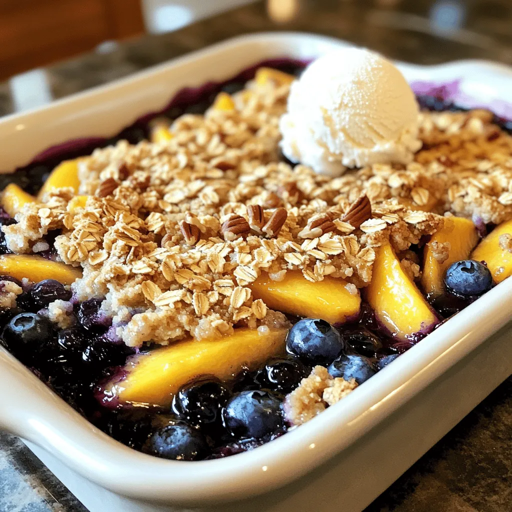 For a tasty Blueberry Peach Crisp, you'll need these fresh ingredients: - 2 cups fresh blueberries - 2 cups fresh peaches - 1 tablespoon freshly squeezed lemon juice Fresh fruit brings out the best flavors in this dessert. The blueberries burst with juice, while the peaches add a sweet and soft touch. The lemon juice helps brighten all the flavors. Next, gather these crisp topping ingredients: - 1 cup rolled oats - 1/2 cup all-purpose flour - 1/2 cup packed brown sugar - 1/3 cup unsalted butter - 1 teaspoon ground cinnamon - 1/4 teaspoon salt - 1/2 cup chopped nuts The topping is where the magic happens! Rolled oats give it a hearty texture. Brown sugar adds sweetness, while cinnamon gives warmth. Nuts, like walnuts or pecans, bring crunch and flavor. For a special touch, consider serving with: - Vanilla ice cream Adding vanilla ice cream creates a delightful contrast. The warm crisp meets the cold ice cream for a perfect bite. Explore more ways to enjoy this crisp by checking the Full Recipe. Set your oven to 350°F (175°C). This step is key, as it ensures even baking. Toss the fresh blueberries and sliced peaches in a bowl. Add 1 tablespoon of freshly squeezed lemon juice. This juice brightens the fruit's flavor. After mixing, transfer the fruit to a greased 9x13-inch baking dish. Spread it out evenly. In a separate bowl, combine 1 cup of rolled oats, 1/2 cup of all-purpose flour, and 1/2 cup of packed brown sugar. Then, add 1/3 cup of melted unsalted butter, 1 teaspoon of ground cinnamon, and 1/4 teaspoon of salt. Mix until crumbly. Finally, stir in 1/2 cup of chopped nuts for added crunch. Now, evenly spread the oat topping over the fruit in the baking dish. Make sure to cover all the fruit. This helps everything bake well together. Place the dish in the oven and bake for 30-35 minutes. Keep an eye on it until the topping turns golden brown. You should see the fruit juices bubbling around the edges. Once done, remove the crisp from the oven. Let it cool for about 10-15 minutes before serving. This cooling time helps the juices settle. Enjoy your warm Blueberry Peach Crisp with a scoop of vanilla ice cream for extra delight. For the full recipe, refer to the recipe section. To make the best blueberry peach crisp, you need ripe, in-season blueberries and peaches. Fresh fruit gives your dish great flavor and texture. Look for blueberries that are plump and shiny. They should not have any wrinkles. For peaches, choose ones that are slightly soft when you press them gently. This means they are ripe and sweet. To get that crunchy topping, I recommend using old-fashioned rolled oats. They give your crisp a great texture. Quick oats can become mushy and lose that nice bite. Mix them well with flour, brown sugar, and melted butter. This will ensure every bite is satisfying and crisp. When serving your blueberry peach crisp, think about adding a scoop of vanilla ice cream or yogurt. This adds creaminess and complements the warm fruit. The cold ice cream contrasts nicely with the warm crisp. You can also drizzle some honey or sprinkle nuts on top for added flavor. For more ideas, check the Full Recipe for serving tips! {{image_4}} You can change the fruit for great new tastes. Try nectarines for a juicy twist. Strawberries also work well. Mixing in other berries adds fun flavors too. I love adding raspberries or blackberries. They bring a tartness that balances the sweetness. Each fruit adds its unique charm to the dish. Need a gluten-free option? Just swap regular flour with gluten-free flour. This keeps the crisp tasty for everyone. If you want a dairy-free dish, use coconut oil instead of butter. It melts in just right and adds a slight coconut flavor. Both options let you enjoy this treat without worry. Want to kick up the flavor? Add a splash of vanilla extract to the topping. Almond extract also makes a lovely addition. Both give the crisp a warm, inviting aroma. These simple changes can make your dessert even more special. For the full recipe, check out the Sweet Blueberry Peach Crisp 🫐 section above. To keep your Blueberry Peach Crisp fresh, store it in an airtight container. Place it in the refrigerator. This way, it stays tasty for up to three days. Just remember to let it cool completely before sealing it up. You can freeze Blueberry Peach Crisp before or after baking. If you freeze it before baking, wrap it tightly in plastic wrap and aluminum foil. This protects it from freezer burn. If you freeze it after baking, let it cool first. Then, store it in a freezer-safe container. It can last for up to three months. For the best taste and texture, reheat your crisp in the oven. Preheat your oven to 350°F (175°C). Place the crisp in an oven-safe dish and cover it with foil. Heat for about 15 minutes or until warm. This helps keep the topping nice and crispy. Enjoy your comforting treat warm! You can prepare Blueberry Peach Crisp in advance. Start by assembling the dish without baking it. Once you layer the fruit and topping in the baking dish, cover it well. Store it in the fridge for up to 24 hours. When you're ready to bake, just pop it in the oven. This saves time and lets the flavors blend. Yes, you can use frozen fruit for this recipe. Just make sure to adjust the baking time. Frozen blueberries or peaches may need an extra 5-10 minutes of baking. Check for the bubbly juices and golden topping. This way, you can enjoy the crisp even in off-seasons. I love serving Blueberry Peach Crisp warm. It tastes amazing with a scoop of vanilla ice cream on top. The warm crisp and cold ice cream create a delightful contrast. You can also add a sprinkle of cinnamon for extra flavor. It makes for a perfect dessert that everyone will enjoy! This article covered how to make a tasty Blueberry Peach Crisp. We explored the best ingredients, like fresh fruit and a crunchy topping. I shared step-by-step instructions to ensure your crisp turns out perfectly every time. With tips on selecting fruit a