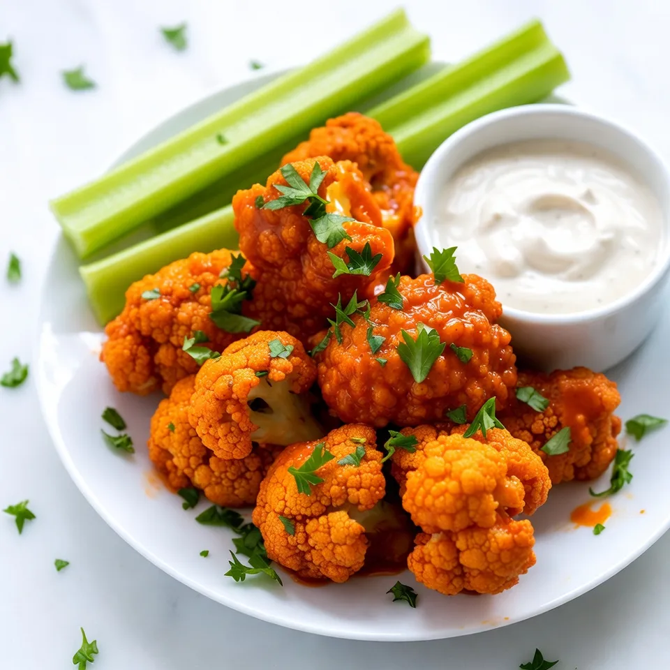 Crispy cauliflower florets coated in spicy buffalo sauce, perfect as an appetizer or snack.