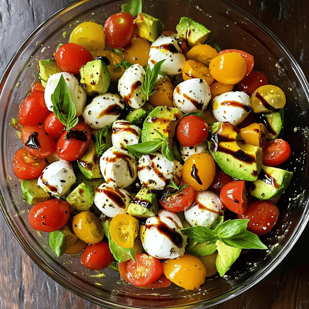 To make a vibrant Caprese Avocado Salad, gather these fresh ingredients. The avocados should be ripe for a creamy texture. Cherry tomatoes add sweetness and color. Fresh mozzarella gives a nice, soft bite. The torn basil leaves bring a fragrant aroma. The extra virgin olive oil adds richness, while balsamic glaze provides a sweet touch. Season with salt and pepper to enhance all the flavors.
