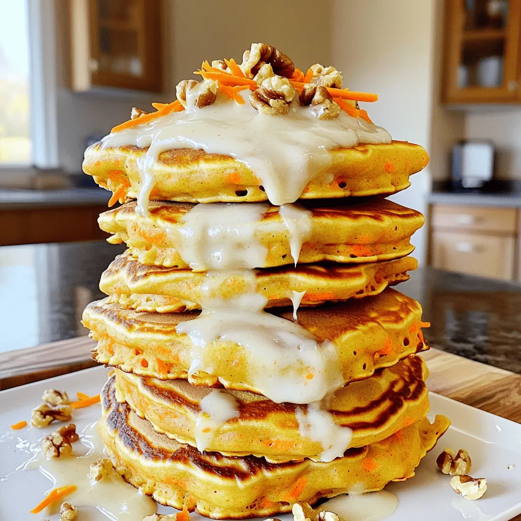 - 1 cup all-purpose flour - 1 teaspoon baking powder - 1/2 teaspoon baking soda - 1/2 teaspoon ground cinnamon - 1/4 teaspoon ground nutmeg - 1/4 teaspoon salt - 1 cup finely grated carrots - 1/4 cup granulated sugar - 1/4 cup packed brown sugar - 1 large egg - 1 cup buttermilk - 2 tablespoons vegetable oil - 1 teaspoon vanilla extract - 1/2 cup chopped walnuts (optional) - 4 oz cream cheese - 1/2 cup powdered sugar - 2 tablespoons milk - 1 teaspoon vanilla extract I love using fresh, finely grated carrots. They add natural sweetness and moisture to the pancakes. The mix of spices, like cinnamon and nutmeg, gives a warm flavor that reminds me of my favorite carrot cake. You can also add walnuts for a nice crunch. If you prefer a nut-free option, feel free to skip them. The cream cheese glaze is rich and smooth. It perfectly balances the fluffy pancakes. These ingredients come together to make each bite a delight. You will enjoy the warm flavors and creamy glaze. It’s a fun twist on a classic breakfast treat! - Mix 1 cup of all-purpose flour, 1 teaspoon baking powder, 1/2 teaspoon baking soda, 1/2 teaspoon ground cinnamon, 1/4 teaspoon ground nutmeg, and 1/4 teaspoon salt in a large bowl. This mix gives your pancakes a great flavor and texture. - In a separate bowl, combine 1 cup of finely grated carrots, 1/4 cup granulated sugar, 1/4 cup packed brown sugar, 1 large egg, 1 cup buttermilk, 2 tablespoons vegetable oil, and 1 teaspoon vanilla extract. Stir until smooth. - Gently pour the wet mix into the dry mix. Use a whisk to combine, but don't overmix. A few lumps are okay. If you want a nice crunch, fold in 1/2 cup of chopped walnuts now. - Preheat your skillet over medium heat. Lightly grease it with cooking spray or oil to prevent sticking. - For each pancake, pour 1/4 cup of batter onto the skillet. Cook until bubbles appear on the surface, which takes about 2-3 minutes. The edges should look firm. - Carefully flip the pancakes and cook for another 2-3 minutes until golden brown. Transfer them to a warm plate while you cook the rest. - In a bowl, mix 4 oz softened cream cheese, 1/2 cup powdered sugar, 2 tablespoons milk, and 1 teaspoon vanilla extract. Use a hand mixer or whisk to blend until smooth. - If the glaze is too thick, add more milk to reach your desired consistency. This glaze adds a sweet, creamy touch to your pancakes. - Avoid overmixing for fluffier pancakes. Mix until just combined. A few lumps are okay. - Adjust heat level for even cooking. Start with medium heat. Lower it if pancakes brown too fast. - Use a measuring cup for uniform pancake sizes. This keeps your pancakes consistent, making them look great on the plate. - Ensure cream cheese is at room temperature for easy mixing. Cold cream cheese will clump up and be hard to blend. - Add more powdered sugar for sweetness or thickness. If you want a sweeter glaze, just keep mixing in sugar until it’s just right. {{image_4}} If you want to make these pancakes nut-free, simply omit the walnuts. They still taste great without them. The flavors of the carrots and spices shine through. You won’t miss the nuts at all. You can easily turn these pancakes vegan. Replace the buttermilk with non-dairy milk mixed with lemon juice. This helps mimic the tangy taste of buttermilk. For the egg, use a flax egg. To make this, mix one tablespoon of ground flaxseed with three tablespoons of water. Let it sit for a few minutes until it thickens. It works great in the batter. If you need a gluten-free option, swap the all-purpose flour for a gluten-free flour blend. Many blends work well in pancakes. Just make sure it has a good mix of flours. This will give you light and fluffy pancakes without gluten. To store leftover pancakes, place them in an airtight container. They will stay fresh for up to 3 days in the fridge. Reheating is easy. You can use a microwave or toaster. Just warm them until they are hot and ready to eat. Keep the cream cheese glaze in the fridge too. It lasts for up to 5 days. If it thickens, simply re-whip it before serving. This helps restore its smooth texture. Enjoy your pancakes with the glaze fresh when you’re ready! Yes, pancakes can be pre-made and frozen. Just cook them, then let them cool. Place each pancake in a single layer on a baking sheet. Then, freeze them for about an hour. Once frozen, stack them in a freezer bag. They will keep well for up to three months. When ready to eat, just reheat them in the microwave or toaster. This makes breakfast easy and quick! Look for a golden color and firm edges. The bubbles on the surface will also help. When you see bubbles, it’s time to flip. After flipping, cook until the bottom is golden brown. If you want to be sure, use a toothpick. Insert it into the center. If it comes out clean, your pancakes are done! Serve with maple syrup for extra sweetness. You can also drizzle on more cream cheese glaze for richness. Fresh fruits like sliced bananas or berries add a nice touch too. Each of these options will make your meal even better. Enjoy experimenting with different toppings! You can enjoy making these delicious carrot cake pancakes at home. We covered all the key ingredients, how to cook them perfectly, and even made a tasty cream cheese glaze. Don’t forget the tips for making them fluffier and adapting the recipe for your needs. These pancakes are great for any meal and can be stored easily. Try different toppings for a fun twist. I hope you feel inspired to whip up this easy, tasty treat!