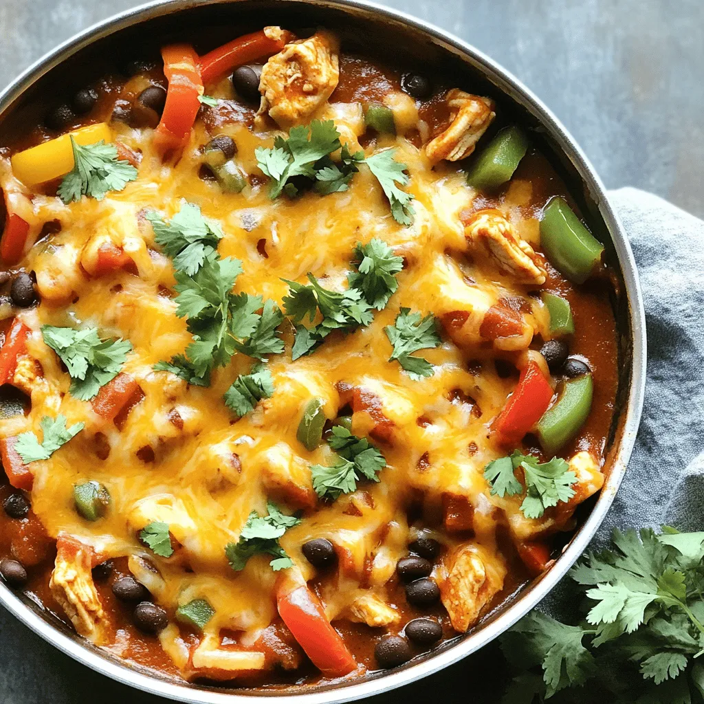 - 1 lb boneless, skinless chicken breasts, cut into small cubes - 1 tablespoon extra virgin olive oil - 1 medium onion, finely chopped - 2 cloves garlic, minced - 1 bell pepper, diced - 1 can (10 oz) enchilada sauce - 1 can (15 oz) black beans, drained and rinsed - 1 cup corn kernels, drained - 2 cups cooked rice, white or brown - 1 teaspoon ground cumin - 1 teaspoon chili powder - Salt and black pepper to taste - 1 ½ cups shredded cheese, like Cheddar or Monterey Jack - Fresh cilantro leaves, chopped The main ingredients create a great base for the dish. The chicken adds protein and flavor. The onion, garlic, and bell pepper give it a nice aroma. The additional ingredients, like the enchilada sauce and black beans, bring in the authentic enchilada taste. Corn adds sweetness, while rice makes it hearty. For a cheesy finish, you need a good amount of cheese. I recommend using a mix, so you get a rich taste. The cilantro at the end adds freshness and color. You can find the full recipe in the earlier section if you need more details. - Heat the olive oil in the skillet. - Season and sauté the chicken. First, grab a large skillet and heat the olive oil over medium heat. Once the oil is hot, add the chicken cubes. Make sure to season the chicken with salt, pepper, cumin, and chili powder. Sauté the chicken for about 5 to 7 minutes. Stir occasionally until the chicken turns golden and is no longer pink. This step ensures your chicken will be juicy and flavorful. - Incorporate onion, garlic, and bell pepper. - Cook until softened. Next, add the chopped onion, minced garlic, and diced bell pepper to the skillet. Stir them in with the chicken. Cook everything for about 3 to 4 minutes. The goal is to soften the veggies and let their flavors mingle. You'll know it's ready when the kitchen smells great! - Pour in enchilada sauce and add beans, corn, and rice. - Mix thoroughly and heat through. Now it's time to bring it all together! Carefully pour in the enchilada sauce. Then, add the drained black beans, corn, and cooked rice. Mix everything well so that the sauce coats all the ingredients. Heat this mixture for about 5 minutes. Stir occasionally to warm it evenly. This step is where you truly create a comforting and hearty dish. - Preheat the oven's broiler. - Sprinkle cheese and broil until melted. Before finishing up, preheat your oven’s broiler to high. Once the mixture is heated through, sprinkle the shredded cheese on top. Place the skillet under the broiler for 2 to 3 minutes. Keep a close eye on it! You want the cheese to melt and turn bubbly without burning. This step adds a delicious, gooey layer that pulls the dish together. Enjoy making this Cheesy Chicken Enchilada Skillet with the full recipe provided! - Always check that your chicken is fully cooked. The inside should be white, not pink. - Broil the cheese carefully. It melts fast, so keep an eye on it to avoid burning. - Spice up your dish! Add more chili powder or cumin based on your taste. - A splash of lime juice can bring a bright zing to your skillet. It adds freshness. - Serve the dish right from the skillet. It looks great and keeps it warm. - Garnish with chopped cilantro. It adds a pop of color and enhances the flavor. For the complete recipe with all details, check the Full Recipe. {{image_4}} You can switch things up with your Cheesy Chicken Enchilada Skillet. Try using turkey instead of chicken for a leaner option. If you want a plant-based meal, tofu works great too. You can also change the cheese. Cheddar adds a sharp taste, while Monterey Jack gives a creamy touch. Need it gluten-free? Use gluten-free enchilada sauce. For a vegan option, simply replace chicken and cheese with plant-based versions. There are many great products that taste amazing. This way, everyone can enjoy the dish! You can serve this dish in many ways. Warm tortillas are perfect for scooping up the enchiladas. Or, put it on a bed of lettuce for a fresh twist. For extra flavor, pair it with guacamole or salsa. These sides add a nice touch and make the meal even more fun. For the full recipe, check the details above! To keep your cheesy chicken enchilada skillet fresh, refrigerate it in an airtight container. This dish tastes best when enjoyed within 3-4 days. The flavors meld beautifully, making it even more delicious on the second day. When you want to enjoy your leftovers, reheat them in the skillet over medium heat. This method helps maintain the texture and flavor. If you're in a hurry, you can also use a microwave for quick reheating. For easy future meals, freeze the skillet in portions. This way, you can enjoy a hearty meal anytime. Make sure to thaw it overnight in the refrigerator before reheating. This keeps the dish flavorful and safe to eat. Enjoy your cheesy chicken enchilada skillet later with great taste! Yes, you can prepare Cheesy Chicken Enchilada Skillet ahead of time. Just cook the dish as directed. Once it's ready, let it cool down. Then, store it in the fridge or freezer. If you store it in the fridge, it stays good for 3-4 days. If you freeze it, it lasts for about 2-3 months. Reheat it when you're ready to enjoy this tasty meal. To kick up the heat, add jalapeños to the skillet. You can slice them and mix them in with the chicken and veggies. Another option is to use a spicy enchilada sauce. This sauce can really bring out the flavors and add that extra zing. Adjust the spice level to your liking for the perfect kick. You can serve Cheesy Chicken Enchilada Skillet with a few tasty sides. Tortilla chips work great for scooping. Guacamole adds a creamy touch. A fresh salad with crunchy veggies also pairs well. These sides balance the richness of the skillet and make for a fun meal. Absolutely! You can swap chicken for your favorite protein. Turkey or tofu are great choices. If you want a vegetarian dish, just leave out the meat. Use extra beans or veggies instead. The flavors will still shine through, making it a delicio