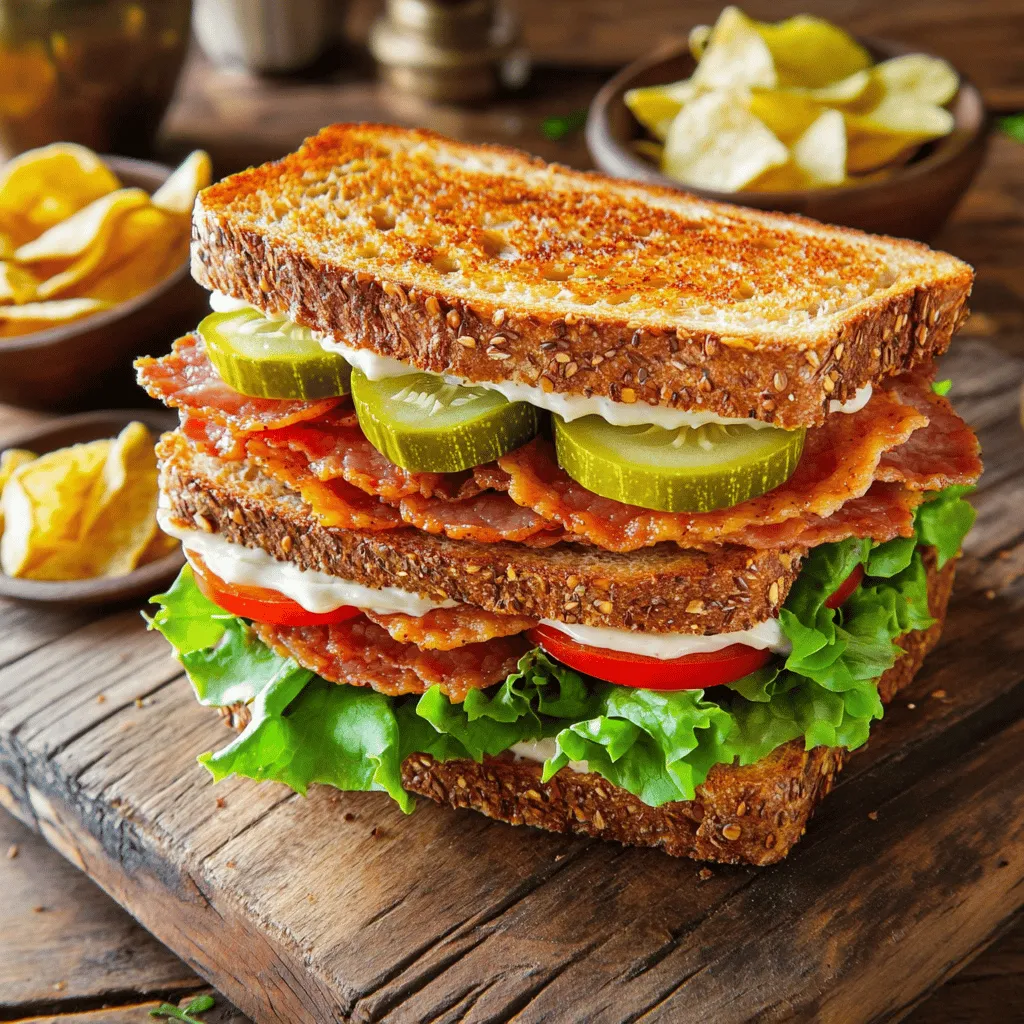 - 8 slices of artisanal whole grain or crusty sourdough bread - 8 crisp leaves of romaine or iceberg lettuce - 8 thick slices of ripe vine tomatoes - 8 slices of smoky turkey bacon (or classic bacon for traditionalists) - 2 tablespoons creamy mayonnaise - 1 teaspoon zesty Dijon mustard - Fresh sea salt and cracked black pepper to taste - Optional: 1 avocado, sliced, or a handful of microgreens for added freshness The ingredients for a Classic BLT Sandwich are simple yet powerful. The bread forms the base. Choose artisanal whole grain for health or crusty sourdough for crunch. The lettuce adds freshness. Romaine or iceberg works well to keep it crisp. Tomatoes are key. Use ripe vine tomatoes for juiciness and flavor. The bacon brings that iconic taste. I often use turkey bacon for a lighter option, but classic bacon is always a hit. The creamy mayonnaise and zesty Dijon mustard blend perfectly. They add a rich and tangy flavor. Don’t forget the sea salt and cracked black pepper. They enhance the taste of the tomatoes. For a twist, add sliced avocado or microgreens. These optional ingredients boost freshness and nutrition. Using the Full Recipe ensures you have the right balance of flavors. Each ingredient plays a vital role in making your sandwich unforgettable. How do you cook bacon to make it crispy? Use a large skillet over medium heat. Add your turkey bacon in a single layer. Cook it for about 5 to 7 minutes on each side. You want it crispy, not burnt! If you prefer, you can also bake the bacon in the oven. Place it on a baking sheet and bake at 400°F for about 15 to 20 minutes. This method lets the grease drip away while cooking. How do you toast the bread to get that golden-brown color? Use the same skillet after cooking the bacon. Toast each slice for 2 to 3 minutes per side. You can also use a toaster if you want it done faster. For sourdough or whole grain bread, pay attention. They take a bit longer to toast. What’s the best way to mix the sauce? In a small bowl, combine 2 tablespoons of creamy mayonnaise with 1 teaspoon of Dijon mustard. Mix them well until you get a smooth blend. This ratio gives a great balance of creaminess and zest. What’s the best way to layer your sandwich? Start with a slice of toasted bread. Spread a generous amount of the mayo-mustard sauce on it. Next, add 2 leaves of crisp lettuce and 2 thick slices of ripe tomato. Sprinkle some sea salt and cracked black pepper on the tomato. Then, add 2 slices of crispy bacon. If you like, you can top it with sliced avocado or microgreens for some extra flavor. Finish with another slice of toasted bread. How do you cut and present the sandwiches? Use a sharp knife to slice each sandwich in half diagonally. This creates nice triangles that are easy to hold. For a great presentation, serve the sandwiches on a wooden board. Add a bowl of pickles and some crunchy chips for a fun touch. For the full recipe, check out the details above. You can make your BLT fit many diets. Here are some easy swaps: - Bread: Use gluten-free bread for a gluten-free option. - Bacon: Try turkey bacon or tempeh bacon for a lower fat choice. - Mayonnaise: Use avocado or hummus for a creamy texture without dairy. - Lettuce: Spinach or arugula can add a new taste. - Tomatoes: Cherry tomatoes can give a sweet twist. These swaps keep your BLT tasty while meeting your needs. Crispiness is key in a great BLT. Here are my favorite tips: - Bacon: Cook it in a hot skillet until it's very crispy. Let it drain on paper towels to remove extra grease. - Lettuce: Use fresh, cold lettuce. This keeps it crunchy. - Bread: Toast the bread until golden brown. This adds texture. - Assembly: Layer the ingredients gently. This helps keep everything intact. Follow these tips to enjoy that perfect crunch in every bite. Pairing sides with your BLT can elevate your meal. Here are some ideas: - Potato Chips: Crispy chips add a nice crunch. - Pickles: Tangy pickles bring a great contrast to the sandwich. - Salad: A fresh side salad can lighten the meal. - Fruit: Serve fresh fruit for a sweet touch. These sides make your meal more fun and tasty. For the full recipe, check out the Classic BLT Sandwich with a Twist! {{image_4}} The classic BLT is simple and tasty. You use bacon, lettuce, and tomato. The bread is often white or whole grain. Gourmet BLTs add fun twists. They use special breads like ciabatta or focaccia. Some chefs swap regular bacon for smoked or flavored varieties. They might even use crispy prosciutto or pancetta. Gourmet BLTs often have unique spreads too. Instead of plain mayo, try garlic aioli or spicy sriracha mayo. You can also add fresh herbs or even pesto for a fresh taste. The result is a delicious mix of flavors that excite your taste buds. Different areas have their own takes on the BLT. In the South, you might find fried green tomatoes instead of fresh ones. This adds a crunchy texture and a unique flavor. Some places add fried eggs for a hearty breakfast option. On the West Coast, it’s common to see avocado slices added. This makes the sandwich creamier. In New England, you might find a lobster BLT, mixing seafood with the classic flavors. Each region brings its own local ingredients to create exciting versions of this beloved sandwich. You can easily make a BLT without meat. For a vegetarian option, use crispy fried eggplant or tempeh bacon. These substitutes give a nice crunch and flavor. For a vegan version, try coconut bacon or marinated tofu strips. You also need to swap out the mayo. Use a vegan mayo or mash up an avocado instead. This gives a rich and creamy texture without any animal products. These meat-free versions keep the spirit of the classic while being friendly for all diets. To keep your BLT fresh, store each ingredient separately. Wrap the bread in plastic. This keeps it soft and prevents it from getting stale. Place the bacon in an airtight container in the fridge. It stays crispy and tasty. Store veggies like lettuc