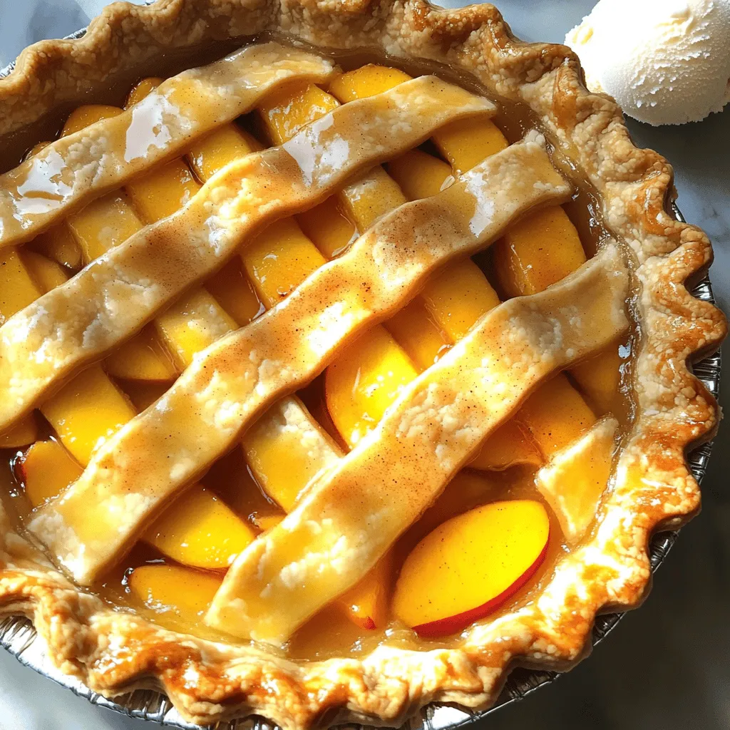 Fresh peaches are the star of this pie. You need about 5 cups of ripe peaches. Look for peaches that smell sweet and feel slightly soft. They should be golden with a hint of blush. Peel and slice them neatly. This step helps release their juicy goodness. You will need 1 cup of granulated sugar and 1/4 cup of all-purpose flour. The sugar adds sweetness while the flour thickens the filling. It helps keep the juices from making the crust soggy. Mix these dry ingredients with the peaches for a great blend. A bit of flavor goes a long way. Add 1 teaspoon of ground cinnamon for warmth. A tablespoon of lemon juice brightens the taste. Don’t forget a pinch of salt to balance the sweetness. Lastly, use 1 tablespoon of unsalted butter, cut into small pieces. This adds richness to the pie. For a full list of ingredients, you can refer to the Full Recipe. To start, gather your fresh peaches. You need about five cups. Peel them and slice them thinly. In a large bowl, mix the peach slices with sugar, flour, cinnamon, lemon juice, and a pinch of salt. Toss everything gently until the peaches are well-coated. Let the mixture sit for about 15 to 20 minutes. This time lets the peaches release their sweet juices, making your filling perfect. While the peaches rest, it’s time to get your oven ready. Preheat it to 425°F (220°C). This will help your pie bake evenly. Next, take one pie crust from the package. Roll it out gently and fit it into a 9-inch pie pan. Let the edges hang over the sides for now. Now, pour the peach filling into your crust. Be careful to avoid any extra liquid. Distribute small pieces of butter over the top of the filling. This adds a rich flavor. Next, roll out the second crust and place it over the filling. Cut slits in the top crust for steam to escape. Trim any overhanging edges and crimp the sides to seal the pie. Brush the top with the beaten egg for a golden finish. Place the pie in the oven. Bake it for about 45 to 50 minutes. Watch it closely. You want the crust golden and the juices bubbling. Once baked, take it out and let it cool on a wire rack for at least two hours. This waiting time helps the filling set. For the full recipe, refer to the earlier section where I mentioned it. To make a great pie crust, keep the ingredients cold. Cold butter makes the crust flaky. Use a light touch when mixing. Overworking the dough can make it tough. Roll it out on a floured surface. Aim for about 1/8-inch thickness. Trim the edges so they hang slightly over the pan. This way, you can crimp them later for a lovely finish. Peach flavor shines with a few simple tweaks. Adding ground cinnamon gives warmth. Lemon juice brightens the taste. A pinch of salt balances the sweetness. You can also try vanilla extract for extra depth. Mix these well with your peaches. Let them sit before filling the pie. This resting time allows flavors to meld and juices to form. Cooling the pie is key for the best slice. Let it cool on a wire rack for two hours. This helps the filling set up nicely. If you slice too soon, it may run. Serve slices warm or at room temperature. I love adding vanilla ice cream on top. The warm pie and cold ice cream create a perfect bite. For a fun twist, try adding fresh mint leaves as a garnish. It looks great and adds freshness. Check out the Full Recipe for more tips! {{image_4}} You can switch out peaches for other fruits. Apples, cherries, or blueberries work well. Each fruit brings its own flavor. For example, apples add crunch and sweetness. Cherries give a tart twist. Blueberries offer a juicy burst. Adjust the sugar based on the fruit's sweetness. Enjoy experimenting with what you have! If you need a gluten-free crust, you have choices. You can use a store-bought gluten-free pie crust. These are often made with rice flour or almond flour. You can also make a crust from ground nuts and coconut oil. Just mix the nuts with oil and press it into the pie pan. It’s simple and tasty! To make this pie vegan, swap a few ingredients. Use a plant-based butter instead of regular butter. You can also replace the egg wash with almond milk or coconut milk. This gives a nice shine to the crust. With these changes, everyone can enjoy this peach pie. It stays delicious and full of flavor! For the full recipe, check out the Peachy Delight Pie! To keep your peach pie fresh, let it cool completely. Once cool, cover it with plastic wrap or foil. Store it at room temperature for up to two days. This keeps the crust crisp and the filling tasty. If you want to save some pie for later, freezing is easy. Wrap the whole pie in plastic wrap. Then, wrap it in aluminum foil to prevent freezer burn. You can freeze it for up to three months. For best results, freeze the pie unbaked. This way, you can bake it fresh later. To reheat your peach pie, preheat the oven to 350°F (175°C). Place the pie on a baking sheet to catch any drips. Heat it for about 15-20 minutes or until warm. If the crust gets too brown, cover it with foil. Enjoy your warm pie with a scoop of ice cream for a treat! You can tell when the peach pie is done by checking the crust and juices. The crust should be a nice golden brown color. You will also see the juices bubbling up through the slits you made on top. This usually takes about 45 to 50 minutes in the oven. Make sure to keep an eye on it, so it does not burn. If the crust gets too dark, you can cover the edges with foil. Yes, you can use canned peaches for your pie. Just make sure to drain them well. Canned peaches are softer than fresh ones, so the texture may change a bit. Use the same amount of canned peaches as fresh ones. They can save time and still taste good. Just remember to adjust the sugar since canned peaches are often sweeter. Peach pie pairs well with many sides. Here are a few great options: - Vanilla ice cream - Whipped cream - Fresh berries - A drizzle of caramel sauce - A scoop of yogurt These sides add flavor and texture. They make each bite even more del