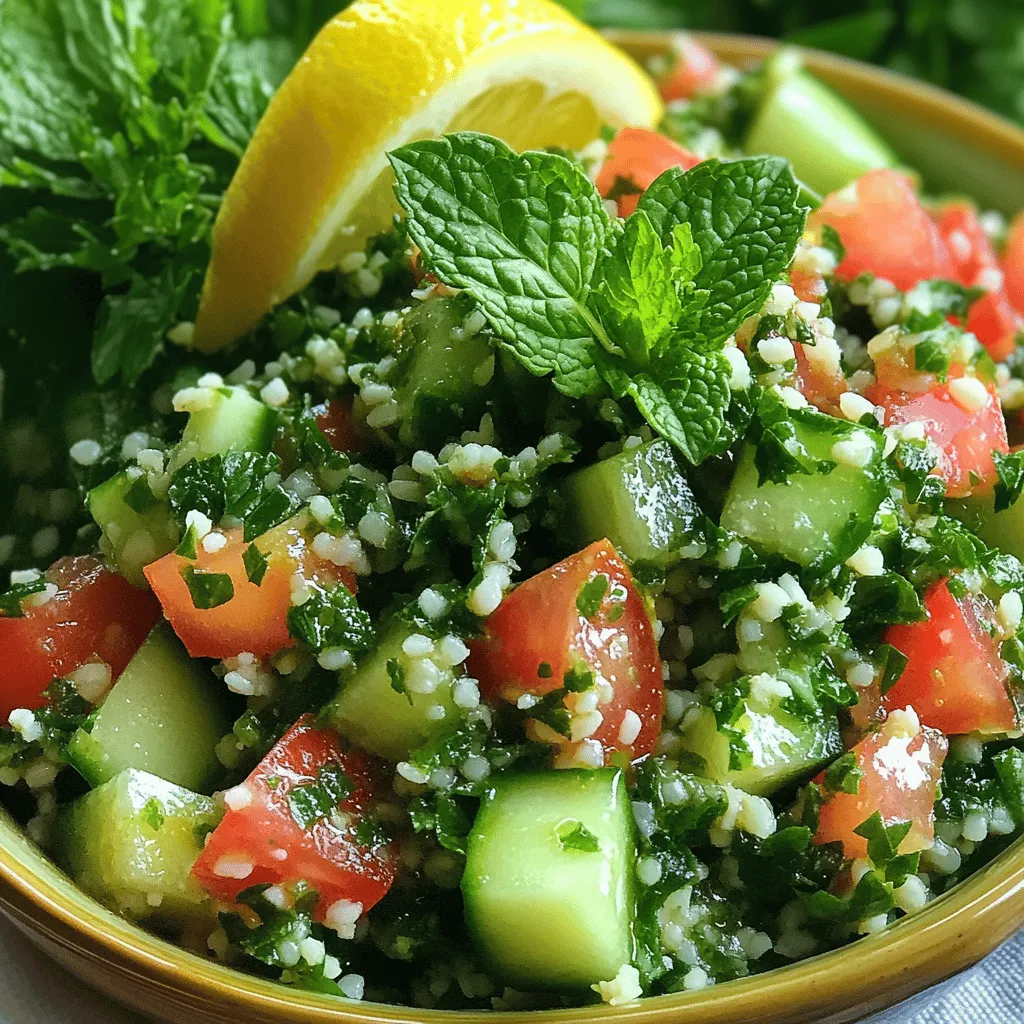 ![To make Classic Tabouli Salad, you need fresh and simple items. Here’s what you will use: - 1 cup bulgur wheat, thoroughly rinsed and drained - 2 cups boiling water - 1 cup fresh parsley, finely chopped - 1/2 cup fresh mint leaves, finely chopped - 2 medium ripe tomatoes, diced into small pieces - 1 small cucumber, diced - 1/4 cup red onion, finely chopped - 1/4 cup high-quality olive oil - 3 tablespoons freshly squeezed lemon juice - Salt and freshly cracked black pepper to taste Using the best ingredients makes a big difference. Fresh parsley and mint give the salad a bright taste. Choose ripe tomatoes for sweetness and juicy texture. The cucumber adds crunch. Always use extra virgin olive oil for rich flavor. Freshly squeezed lemon juice brightens the dish. When you use high-quality and fresh ingredients, your tabouli will shine. Not everyone can eat bulgur wheat. For a gluten-free option, use quinoa instead. If you don’t like mint, try using basil or cilantro for a twist. You can add bell peppers or radishes if you want more crunch. This salad is flexible, so feel free to adjust based on your needs. For the full recipe, check the details above. Start by rinsing the bulgur wheat in cold water. This helps remove any dust. Next, place the rinsed bulgur in a large bowl. Pour two cups of boiling water over the bulgur. Ensure all the grains are covered. Cover the bowl tightly with a lid or plastic wrap. Let it soak for 20 to 30 minutes. This time allows the bulgur to absorb the water and soften. After soaking, fluff the bulgur gently with a fork. This helps keep the grains separate and light. Once the bulgur has cooled to room temperature, it’s time to mix in the veggies. Add the finely chopped parsley and mint to the bulgur. Next, toss in the diced tomatoes, cucumber, and red onion. Stir everything gently to mix the vegetables evenly throughout the bulgur. Now, it’s time to add the dressing. Drizzle high-quality olive oil and freshly squeezed lemon juice over the mixture. Season with salt and freshly cracked black pepper to taste. This step brings all the flavors together. Using a large spoon or spatula, carefully toss all the ingredients. Make sure everything is well combined. Taste the salad and check the seasoning. If it needs more flavor, add a bit more lemon juice or salt. It’s important to adjust the taste to your liking. For the best results, cover the salad and chill it in the fridge. Let it marinate for at least 30 minutes. This resting time helps the flavors blend beautifully. For a lovely presentation, serve the tabouli in chilled bowls. Garnish with fresh mint and a lemon wedge. Enjoy this refreshing dish! To get the best texture in your tabouli salad, start with bulgur wheat. Use fine bulgur for a softer bite. Soak it in boiling water, as the recipe suggests. This makes it fluffy and light. After soaking, fluff the grains gently with a fork. Be careful not to mash them. Tabouli salad pairs well with many dishes. Serve it alongside grilled chicken or fish. The fresh herbs brighten up rich flavors. You can also enjoy it with pita bread and hummus for a light meal. For a twist, add feta cheese for a salty bite. Letting tabouli chill is key for flavor. After mixing, cover the salad and place it in the fridge for at least 30 minutes. This allows the herbs to release their oils and flavors. The longer it chills, the better it tastes. Enjoy this refreshing dish with friends or family. You can find the full recipe in the main article. {{image_4}} You can play with the herbs in tabouli. Besides parsley and mint, try basil or cilantro. These herbs add fresh flavors. You can also mix in veggies like bell peppers or radishes. They bring extra crunch and color. For a twist, add roasted red peppers for a smoky taste. Tabouli is easy to make vegan. Just stick to the basic ingredients. If you want a gluten-free option, swap bulgur wheat with quinoa or cauliflower rice. Both options work well and keep the dish light and healthy. While lemon juice and olive oil are classic, you can switch things up. Try adding tahini for creaminess or balsamic vinegar for sweetness. You can even mix in yogurt for a tangy twist. Each dressing gives a new flavor to the salad. For the full recipe, check out the [Full Recipe]. To store leftover tabouli salad, place it in an airtight container. This keeps the salad fresh and prevents odors from other foods. Make sure to press out any extra air before sealing the container. Tabouli salad lasts about 3 to 5 days in the fridge. The fresh herbs and veggies stay crisp for a few days. However, the flavors meld and get better over time. Check for any signs of spoilage before eating. Freezing tabouli salad is not ideal because it affects texture. If you must freeze it, use a freezer-safe container. Thaw it in the fridge overnight when ready to eat. Expect some sogginess due to the veggies losing water. For best results, enjoy your tabouli fresh. You can find the Full Recipe [here](#). Tabouli salad comes from the Middle East. It is a traditional dish from Lebanon and Syria. The name "tabouli" means "seasoned" in Arabic. It is made with bulgur, fresh herbs, and vegetables. People have enjoyed tabouli for centuries. It reflects the region's love for fresh, healthy foods. Yes, you can make tabouli salad ahead of time. In fact, it tastes better after resting. Allowing it to sit helps the flavors blend well. I recommend chilling it in the fridge for at least 30 minutes. You can make it a day before serving. Just store it in an airtight container. Avoid adding too much salt until serving time. To make tabouli gluten-free, simply replace bulgur wheat. Use quinoa as a great substitute. Quinoa cooks easily and has a nice texture. Prepare it the same way as bulgur. Rinse it, cook it, and then mix it with the veggies. You’ll still enjoy a fresh and tasty salad. For the full recipe, check out the detailed steps above. In this blog post, we explored the key ingredients fo