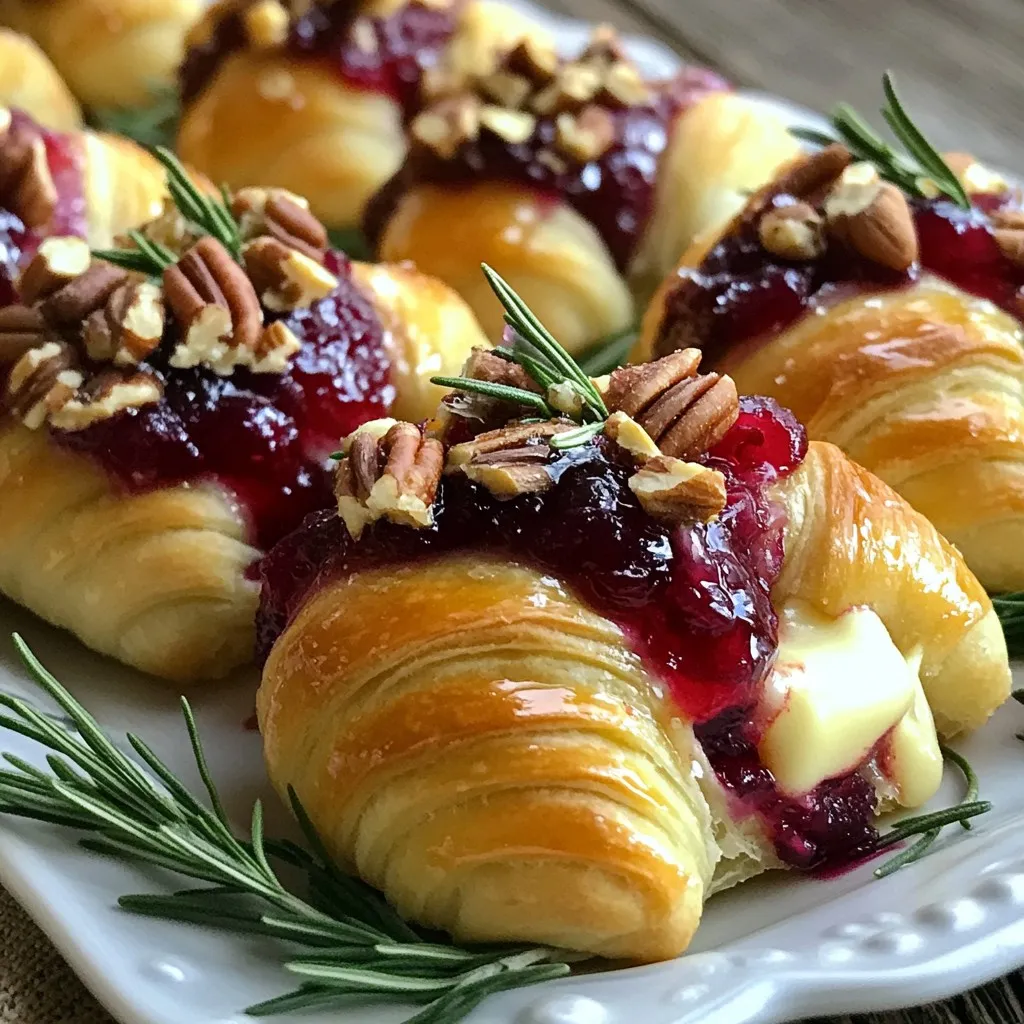 Delicious bite-sized pastries filled with Brie cheese, cranberry sauce, and honey, perfect for any gathering.