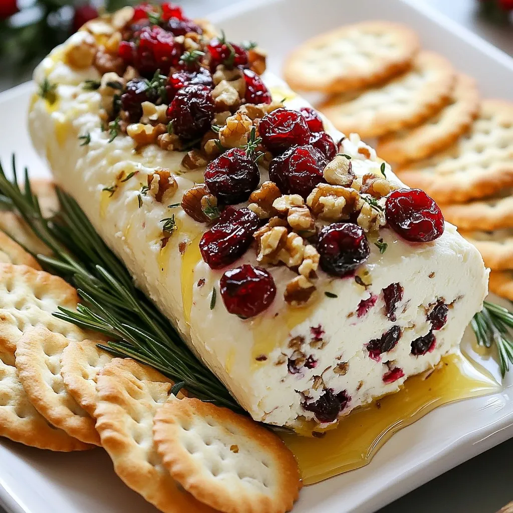 A delightful cheese log coated with cranberries and walnuts, perfect for serving with crackers or baguette.