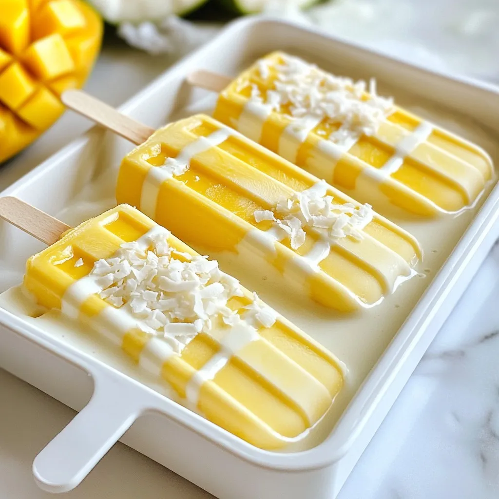 Serve your popsicles on a bright plate to attract attention. You can also place them in fun, colorful cups. For a creative garnish, sprinkle extra shredded coconut on top. Fresh mango slices make a great side, too, adding color and taste. This way, your popsicles look as good as they taste!