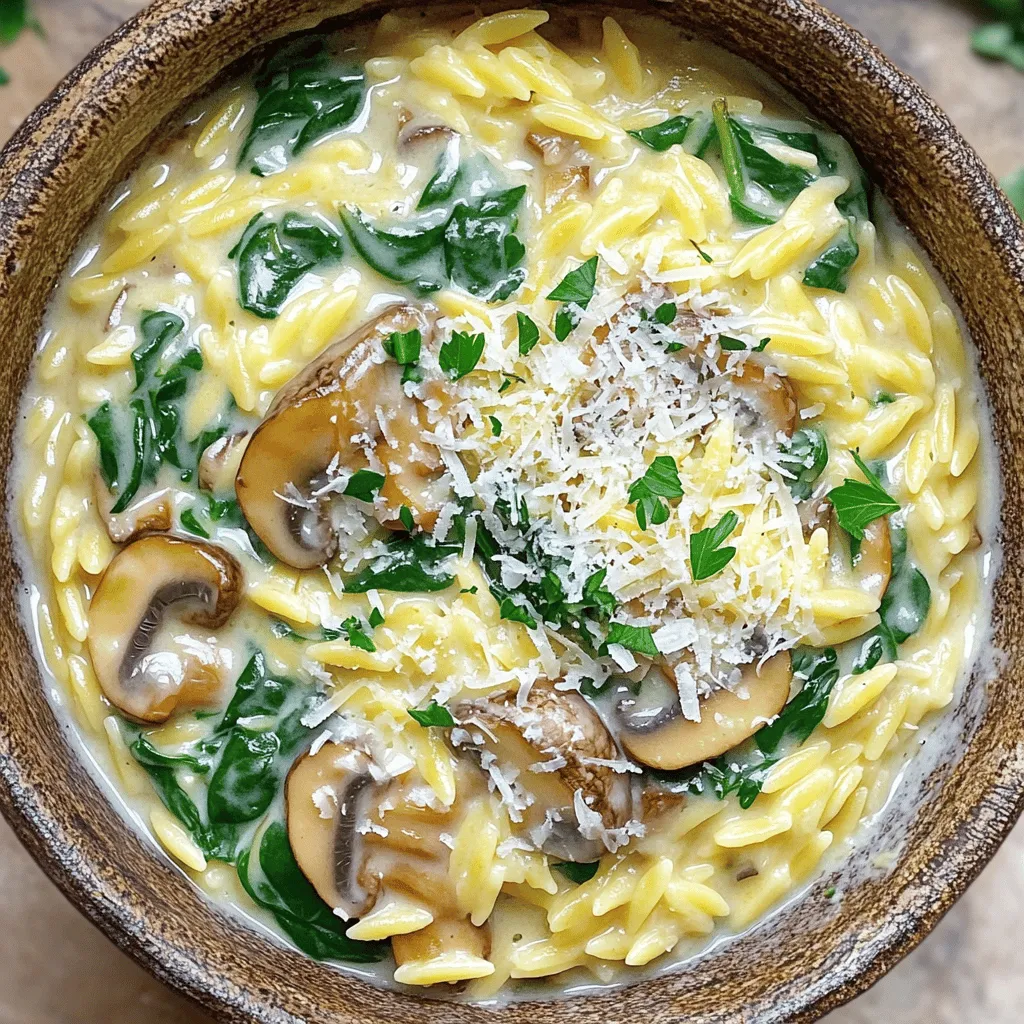 - 1 cup orzo pasta - 2 cups vegetable broth - 1 tablespoon extra-virgin olive oil - 1 medium onion, finely chopped - 2 cloves garlic, minced - 8 oz (about 225g) mushrooms, sliced (cremini or button) - 2 cups fresh spinach, roughly chopped - 1/2 cup heavy cream (or coconut milk as a vegan alternative) - 1/4 cup grated Parmesan cheese (or nutritional yeast for a vegan option) - Salt and freshly ground black pepper to taste - 1 teaspoon dried thyme - Fresh parsley, chopped, for garnish I love using these fresh ingredients for my creamy mushroom spinach orzo. The orzo pasta provides a lovely texture. You can find it in most grocery stores. Vegetable broth adds depth and flavor, making the dish hearty. Olive oil enhances the taste and helps sauté the vegetables. Onions and garlic bring a sweet and savory aroma. I prefer finely chopping the onion to get a nice base. Mushrooms, whether cremini or button, give this dish a rich flavor. Fresh spinach adds color and nutrients, making the dish vibrant. For creaminess, I use heavy cream, but coconut milk works well for a vegan option. Parmesan cheese or nutritional yeast gives it a cheesy flavor. Seasoning with salt, black pepper, and thyme brings everything together. These ingredients create a comforting and satisfying meal. You can easily adjust them based on what you have at home. Enjoy the cooking process and the delicious results! 1. Cooking the orzo: Start by bringing 2 cups of vegetable broth to a simmer in a medium saucepan. Add 1 cup of orzo pasta to the broth. Cook it for 8-10 minutes or until it is al dente. Stir it occasionally to prevent sticking. If it starts to stick, add a splash of broth. 2. Sautéing the vegetables: While the orzo cooks, heat 1 tablespoon of olive oil in a large skillet. Add 1 finely chopped onion and sauté for 3-4 minutes until it turns translucent. Then, add 2 minced garlic cloves and 8 oz of sliced mushrooms. Cook for 5-7 minutes until the mushrooms are golden brown. 3. Combining ingredients: Add 2 cups of roughly chopped spinach to the skillet. Sauté until the spinach wilts, about 2-3 minutes. Season the mix with salt, pepper, and 1 teaspoon of dried thyme for extra flavor. - Instructions for each cooking phase: Once the orzo is cooked, drain any excess broth. Transfer the orzo to the skillet with the vegetables. Lower the heat and pour in 1/2 cup of heavy cream. Stir until everything is mixed well. Gradually add 1/4 cup of grated Parmesan cheese, mixing until it melts and the dish becomes creamy. Taste it and adjust seasonings as needed. - Tips for avoiding common mistakes: Avoid overcooking the orzo; it should remain firm. Stir the mushrooms enough to ensure they brown properly and release moisture. If your spinach is not wilting quickly, raise the heat slightly but keep an eye on it. - Plating techniques: Serve the orzo in shallow bowls. This lets the creamy sauce stand out. - Garnishes to elevate presentation: Add a sprinkle of fresh parsley on top for a pop of color. You can also use extra Parmesan or nutritional yeast for added flavor. Place a few whole spinach leaves or a slice of lemon on the side for a fresh touch. To make your orzo perfect, watch the timing. Cook it until it's al dente. This means it should have a slight bite. Stir often to stop it from sticking. If it seems dry, add a splash of broth. For flavor, use fresh herbs like thyme. They add a nice touch. You can also sprinkle a bit of lemon juice at the end. This adds brightness to the dish. One mistake is overcooking mushrooms. Cook them until they are golden, not mushy. Mushrooms should be soft but still hold their shape. Balancing flavors is key. Taste as you cook. If it’s too salty, add more spinach or cream. This helps mellow the saltiness. Want a quicker meal? Use pre-cooked orzo. You can also use frozen spinach. Just thaw and add it in. If you want to make it ahead, cook the orzo and veggies separately. Combine them just before serving. This keeps everything fresh and tasty. {{image_4}} - Gluten-free options: You can swap orzo with gluten-free pasta. Look for rice or quinoa pasta. These work well and keep the dish tasty and creamy. - Dairy-free alternatives: For a dairy-free version, use coconut milk instead of heavy cream. Nutritional yeast makes a great substitute for Parmesan cheese. This keeps the flavor while making it vegan. - Protein enhancements: Add cooked chicken or tofu for extra protein. Grilled chicken strips give a nice bite. Tofu can soak up all the great flavors of this dish. - Spice and herb variations: Feel free to play with spices! Add red pepper flakes for heat. Fresh basil or oregano can also bring a bright flavor twist. - Using seasonal vegetables: In spring, add asparagus or peas. In fall, try roasted squash or kale. This keeps your dish fresh and exciting with the seasons. - Adjusting for holidays or gatherings: For special occasions, you can top the orzo with crispy bacon bits or serve it as a side to roasted meats. This makes it festive and fun for gatherings. To keep your creamy mushroom spinach orzo fresh, follow these tips: - Refrigeration: Place the orzo in an airtight container. It stays fresh for 3 to 4 days in the fridge. Make sure it cools down before sealing. This prevents condensation, which can make it soggy. - Freezing: You can freeze the orzo for up to 3 months. Store it in freezer-safe containers or bags. When freezing, leave some space in the container. This allows the orzo to expand as it freezes. Reheating the orzo without drying it out is key. Here are some methods: - Stovetop: Heat a skillet over low heat. Add a splash of vegetable broth or water to the orzo. Stir gently until warmed through. This keeps it creamy and moist. - Microwave: Place the orzo in a microwave-safe dish. Add a tablespoon of broth or water. Cover with a lid or microwave-safe wrap. Heat in 30-second intervals, stirring in between to ensure even heating. How long will your creamy mushroom spinach orzo last? - In the 