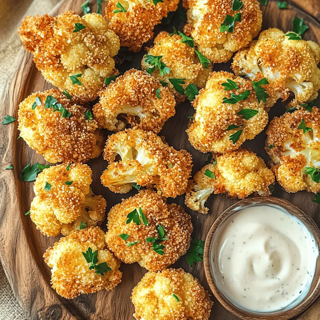 To make Crispy Air Fryer Cauliflower, gather these simple ingredients: - 1 medium head of cauliflower, cut into bite-sized florets - 1 cup all-purpose flour (gluten-free option available) - 1 teaspoon garlic powder - 1 teaspoon onion powder - 1 teaspoon smoked paprika - 1/2 teaspoon cayenne pepper (adjust for spice level) - 1 teaspoon salt - 1/2 teaspoon freshly ground black pepper - 1 cup buttermilk (or substitute with plant-based milk — add 1 tablespoon of vinegar) - 1 cup breadcrumbs (use panko for extra crunch) - 2 tablespoons olive oil These ingredients work together to create a tasty, crunchy treat. The cauliflower florets hold all the flavor from the spices, while the breadcrumbs add a satisfying crunch. This mix makes your dish both fun and delicious. You can play around with the spices to find your perfect blend. For instance, if you want more heat, add more cayenne. If you like a cheesy flavor, sprinkle in some grated cheese. Each time you make it, you can create your own twist. Gather everything before you start cooking. It makes the process easy and fun. For the full recipe, check the section on step-by-step instructions. - Preheat air fryer to 400°F (200°C). - Combine dry ingredients in a mixing bowl: flour, garlic powder, onion powder, smoked paprika, cayenne, salt, and black pepper. - Prepare buttermilk mixture for dipping. If using plant-based milk, add vinegar to mimic buttermilk. - Dip each floret in the buttermilk. Let the excess drip back into the bowl. - Roll the floret in the seasoned flour mixture, ensuring it’s fully coated. Shake off any excess flour. - Dip the floret again in the buttermilk, then coat it with breadcrumbs for a crunchy texture. - Arrange the coated cauliflower in the air fryer basket. Make sure to leave space between each piece. - Drizzle olive oil over the cauliflower to help with crispiness. - Cook for 15 to 18 minutes, shaking the basket halfway through for even cooking. For the Full Recipe, check the detailed instructions above. Enjoy making this crispy delight! To make your cauliflower super crunchy, use panko breading. Panko adds a light, airy crunch that regular breadcrumbs can't match. Preheat your air fryer to 400°F (200°C) for about 5 minutes. This step ensures even cooking. When placing the florets in the fryer, leave space between each piece. This allows hot air to circulate, giving you that perfect crunch. Feel free to get creative with seasonings. Try adding Parmesan cheese or nutritional yeast for a savory twist. You can also experiment with different dipping sauces. Serve your crispy cauliflower with tahini or ranch dressing to elevate the flavors. The cook time can change based on how crispy you want your cauliflower. Start with 15 minutes and check for doneness. If you like it crunchier, add a few more minutes. Always check towards the end of the cooking time to avoid overcooking. For the full recipe, check out the Crispy Air Fryer Cauliflower Delight. {{image_4}} You can change the coating for your crispy cauliflower. Use gluten-free flour to meet dietary needs. This keeps the dish tasty for everyone. You can also make it vegan. Use plant-based milk instead of buttermilk. Just stir in a tablespoon of vinegar for that tangy flavor. This way, all can enjoy this crunchy treat. If you want to switch things up, try other veggies. Broccoli or Brussels sprouts work well as substitutes. They cook nicely and bring new flavors. You can even mix in other vegetables. Carrots or bell peppers add color and taste. This keeps your meals exciting and diverse. You can customize the spice level to suit your taste. If you like it hotter, add more cayenne pepper. This gives it a nice kick. You can also try different spices. Cumin or curry powder adds bold flavors. Feel free to experiment! Your palate will thank you for it. For the full recipe, check out the Crispy Air Fryer Cauliflower Delight section. To keep your crispy air fryer cauliflower fresh, refrigerate leftovers in an airtight container. This helps maintain its crunch. It is best to store the cauliflower without any dipping sauce. This way, it stays crisp and does not get soggy. When it comes to reheating, I recommend using the air fryer again. This method keeps the cauliflower crispy and delicious. Avoid microwaving it, as this can make the cauliflower soft and less tasty. You should enjoy your leftovers within 3-4 days. This timeframe ensures the best flavor and texture. If you wait too long, the cauliflower may lose its delightful crunch. Yes, but best served fresh for optimal crispiness. If you make it early, store it in an airtight container. Reheat in the air fryer to regain that crunch. Pair with dipping sauces like tahini or ranch dressing. You can also enjoy it with a spicy sriracha mayo. These dips enhance the flavor and make it even more fun to eat. Yes, store and reheat for easy weeknight meals. You can cook a batch on Sunday. Pack it in containers to grab during the week. It’s a quick and tasty option for lunch or dinner. Yes, but increase cooking time and ensure not to overcrowd the basket. Frozen florets need a bit longer to cook through. Just shake the basket halfway to make sure they crisp evenly. This recipe shows how to make crispy air fryer cauliflower. You learned the right ingredients, step-by-step instructions, tips for crispiness, and variations to try. You can even store leftovers and reheat them well. This dish is easy to customize for your taste or diet. Enjoy your cooking, and share your delicious results!