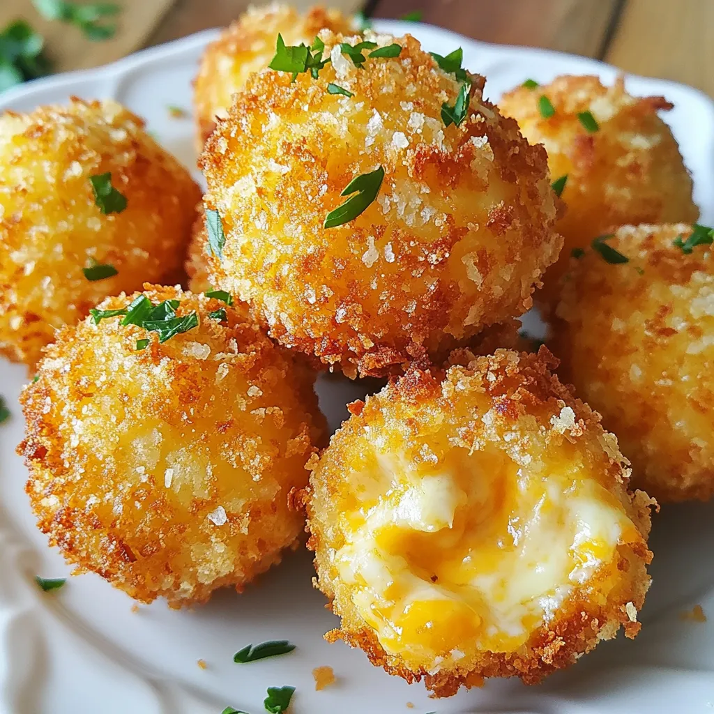 To make crispy cheese balls, you need the following: - 2 cups shredded cheese (a blend of sharp cheddar and stretchy mozzarella) - 1 cup cream cheese, softened to room temperature - 1 cup panko breadcrumbs (for an extra crispy texture) - 2 tablespoons fresh parsley, finely chopped - 1 teaspoon garlic powder - 1 teaspoon onion powder - Salt and freshly ground black pepper to taste - 1 large egg, beaten until smooth - Vegetable oil, for frying Using good-quality cheese makes a big difference. The best cheese melts well and adds flavor. Sharp cheddar gives a nice tang, while mozzarella adds stretch. Cream cheese binds everything together, making the mix creamy. Fresh parsley brightens the taste and looks great too. Always choose fresh spices for better flavor. You can change some ingredients if needed. Use any cheese you like, such as gouda or pepper jack. If you want a lighter option, try using Greek yogurt instead of cream cheese. For a gluten-free version, swap panko for crushed cornflakes. Add spices like paprika or cayenne for a kick! {{ingredient_image_2}} To make the cheese mixture, grab a large mixing bowl. First, add 2 cups of shredded cheese. I like to use a mix of sharp cheddar and stretchy mozzarella for great taste. Next, add 1 cup of softened cream cheese. Mix these cheeses until they blend smoothly. Then, add 2 tablespoons of finely chopped parsley, 1 teaspoon of garlic powder, and 1 teaspoon of onion powder. Don’t forget to sprinkle in some salt and pepper to taste. Stir everything until it is well combined. Now it’s time to form the cheese balls. Take about one tablespoon of the cheese mixture in your hands. Roll it into a ball shape, making around 20 cheese balls. Once you have all your cheese balls ready, get a shallow dish and pour in 1 cup of panko breadcrumbs. Dip each cheese ball into 1 large beaten egg. Make sure it is fully coated. After that, roll it in the breadcrumbs. Press gently to help the crumbs stick well. For frying, heat some vegetable oil in a deep pan over medium heat. To check if the oil is ready, drop a small pinch of breadcrumbs into it. If it sizzles and rises, you are good to go! Carefully place the cheese balls in the hot oil, but do it in small batches. Fry them for about 3 to 4 minutes. Make sure to turn the balls so they brown evenly. You want them to be a nice golden brown color all over. When they are done, use a slotted spoon to lift them out and place them on a plate lined with paper towels to soak up extra oil. Enjoy these warm with your favorite dipping sauces! To get the best crunch, use panko breadcrumbs. They are lighter and crispier than regular ones. Make sure to fry in hot oil. If the oil is too cold, the cheese balls will soak up oil and become soggy. Always test the oil with a breadcrumb. It should sizzle and rise right away. Keep the cheese balls chilled before frying. This helps them hold their shape. If they fall apart, try adjusting the cheese blend. A firmer cheese like gouda or a bit more cream cheese can help. Also, roll them gently but firmly to make sure they stay intact. Serving crispy cheese balls with the right dips can enhance their flavor. I recommend marinara or ranch dressing. Both add a nice tangy kick. You can also try spicy ketchup or garlic aioli for something different. These dips will make your snack even more delightful! Pro Tips Chill the Mixture: Before rolling the cheese balls, refrigerate the cheese mixture for about 30 minutes. This helps the balls hold their shape during frying. Use a Thermometer: For perfectly fried cheese balls, use a kitchen thermometer to maintain the oil temperature around 350°F (175°C) for optimal crispiness. Experiment with Cheeses: Feel free to mix different types of cheese such as pepper jack or gouda for varied flavors and textures in your cheese balls. Serve with Variety: Pair your cheese balls with a range of dipping sauces like spicy sriracha or honey mustard for an exciting flavor experience. {{image_4}} You can change the taste of your crispy cheese balls easily. Add spices or herbs to make them unique. For a spicy kick, mix in some chopped jalapeños or cayenne pepper. If you love herbs, try adding fresh basil or oregano. You can even use a blend of Italian seasoning for a zesty touch. Each flavor brings a new life to these tasty bites! Not everyone eats dairy, but that’s okay! You can make vegan cheese balls too. Use plant-based cheese that melts well, like cashew or almond cheese. Instead of cream cheese, use a vegan cream cheese. It gives a creamy texture without the dairy. This way, everyone can enjoy crispy cheese balls! Frying gives crispy cheese balls a crunchy coat. But baking is a healthier choice if you prefer less oil. To bake, preheat your oven to 400°F (200°C). Place the coated cheese balls on a lined baking sheet. Bake for 15-20 minutes until they turn golden brown. You still get great flavor and texture! To keep leftover cheese balls fresh, place them in an airtight container. Line the bottom with paper towels to absorb moisture. This step helps maintain their crispiness. Store the container in the fridge for up to three days. When ready to enjoy again, you can reheat them. For long-term storage, freezing is a great option. First, place the cheese balls on a baking sheet in a single layer. Freeze them for about an hour until solid. Then, transfer the frozen cheese balls to a freezer bag. Remove as much air as possible before sealing. They can last in the freezer for up to three months. To reheat and keep the cheese balls crispy, preheat your oven to 375°F (190°C). Spread the cheese balls on a baking sheet lined with parchment paper. Heat them for about 10-12 minutes until warm and crispy. Avoid using a microwave, as it can make them soggy. Enjoy your crispy cheese balls just like the first day! Crispy cheese balls stay fresh for about 2 to 3 days in the fridge. After frying, let them cool down. Then, place them in an airtight container. This ke