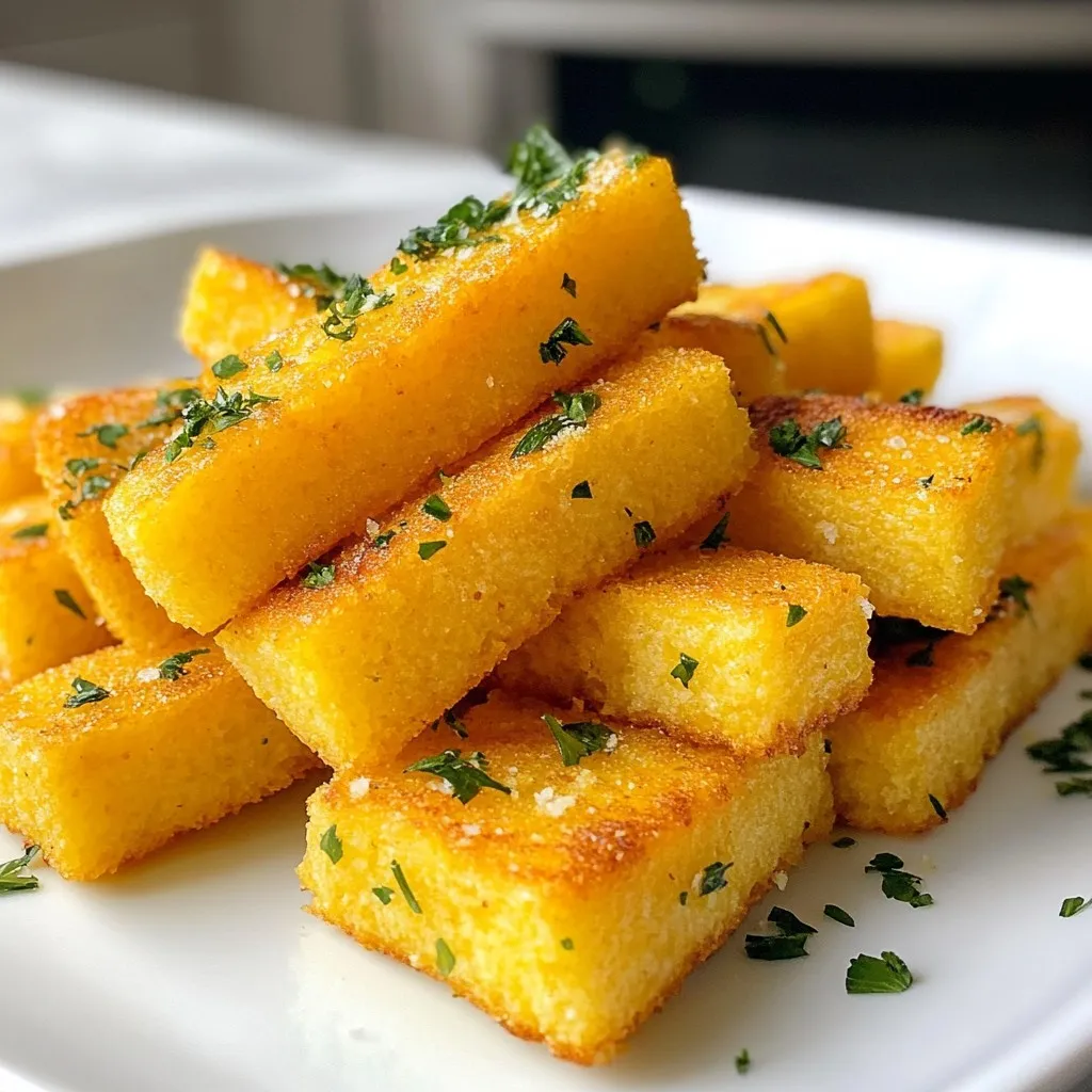 - 1 cup cornmeal - 4 cups vegetable broth - 1 cup freshly grated Parmesan cheese - 1 teaspoon garlic powder - 1 teaspoon onion powder - 1/2 teaspoon sea salt - 1/4 teaspoon freshly ground black pepper - 2 tablespoons extra virgin olive oil - Fresh parsley, finely chopped (for garnish) You can switch the Parmesan cheese with any cheese you like. Try mozzarella or cheddar for a new taste. If you want a richer flavor, use chicken broth instead of vegetable broth. For those who need gluten-free options, look for gluten-free cornmeal. This way, everyone can enjoy the fries! {{ingredient_image_2}} 1. Start by pouring 4 cups of vegetable broth into a medium saucepan. 2. Heat it over medium heat until it reaches a rolling boil. 3. As soon as the broth boils, slowly whisk in 1 cup of cornmeal. 4. Keep whisking to avoid lumps in the mixture. 1. Once the cornmeal is mixed in, reduce the heat to low. 2. Let it simmer for 10-15 minutes. Stir frequently until it thickens. 3. The polenta is ready when it pulls away from the sides of the pan. 4. Remove it from heat and mix in 1 cup of grated Parmesan cheese, 1 teaspoon of garlic powder, 1 teaspoon of onion powder, 1/2 teaspoon of sea salt, and 1/4 teaspoon of black pepper. 5. Stir until everything is creamy and well combined. 1. Pour the polenta into a greased baking dish. 2. Use a spatula to smooth it out into an even layer about 1 inch thick. 3. Let it cool at room temperature for a bit. 4. Cover and refrigerate it for at least 1-2 hours until firm. 1. Preheat your oven to 425°F (220°C). 2. Once firm, take the polenta out of the fridge. 3. Carefully cut it into fry shapes, about 1/2 inch wide. 4. Arrange the fries on a baking sheet lined with parchment paper. 5. Make sure they are spaced apart for even cooking. 6. Drizzle 2 tablespoons of extra virgin olive oil over the fries. 7. Gently toss them to coat each piece evenly. 8. Bake for 25-30 minutes, flipping them halfway through. 9. They should turn golden brown and crispy. 10. Once done, take them out and garnish with chopped parsley. 11. Serve them hot for the best taste! Spacing on the baking sheet is key. When you place the polenta fries, ensure they don’t touch. This helps them cook evenly. Each fry needs space to breathe. It prevents steaming and promotes that lovely crunch. During baking, use a flipping technique. Halfway through, turn each fry. This ensures all sides get golden brown. A gentle flip helps keep the fries intact. The goal is crispy on all sides. For added flavor, consider mixing seasonings. You can try smoked paprika or cayenne pepper. These spices give the fries a nice kick. If you want a fresh taste, add some herbs like rosemary. Serve the fries hot for the best taste. The crispiness shines when they’re fresh from the oven. Let them cool for just a minute before eating. I recommend pairing your polenta fries with dips. Marinara sauce is a classic choice. It offers a nice contrast to the crispy texture. A creamy ranch or garlic aioli also works well. When serving, presentation matters. Arrange the fries in a neat pile. Sprinkle fresh parsley on top for color. A side of dipping sauce adds flair and fun. Pro Tips Use Fresh Ingredients: For the best flavor, always opt for freshly grated Parmesan cheese instead of pre-packaged options. Chill for Crispiness: Allowing the polenta to chill and set properly in the fridge helps achieve that perfect crispy texture when baked. Flavor Variations: Experiment with different seasonings like smoked paprika or cayenne pepper for a spicy kick in your polenta fries. Serving Suggestions: Pair your fries with various dips, such as garlic aioli or a zesty salsa, to enhance the flavor experience. {{image_4}} You can change the taste of your polenta fries easily. Adding herbs like rosemary or thyme gives a fresh twist. Spices such as paprika or cayenne can add heat and depth. You can also mix in cheese beyond Parmesan. Cheddar or feta can boost flavor. You can prepare these fries in different ways. Air frying gives a crunchy texture with less oil. Just set your air fryer to 400°F and cook for about 15 minutes. If you prefer, you can pan-fry them. Heat oil in a skillet and fry until golden brown for a rich taste. Think about fun ways to serve polenta fries. You can create loaded fries by topping them with cheese, bacon, or jalapeños. Pair them with dips like marinara or garlic aioli for extra flavor. They also go well with a fresh salad or grilled veggies for a complete meal. To keep your leftover polenta fries fresh, follow these tips: - Refrigeration: Place the fries in an airtight container. This helps prevent them from drying out. They can last up to 3 days in the fridge. - Freezing: For longer storage, freeze the fries in a single layer. After they freeze, transfer them to a freezer-safe bag. They can stay good for up to 3 months. When you're ready to enjoy your fries again, here’s how to reheat them: - Oven Reheating: Preheat your oven to 400°F (200°C). Place the fries on a baking sheet. Bake for about 10-15 minutes until they are hot and crispy. - Alternative Methods: You can also use an air fryer. Set it to 375°F (190°C) and heat for about 5-7 minutes. This method works great for keeping them crispy. To make your polenta fries nice and crispy, follow these tips: - Use a thin layer of polenta when spreading it in the baking dish. - Ensure your fries are not touching on the baking sheet. This helps them crisp up. - Flip the fries halfway through baking for even browning. - Bake at a high temperature to achieve that crunchy texture. Yes, you can make this recipe vegan! Here are some ideas: - Replace Parmesan cheese with nutritional yeast for a cheesy flavor. - Use vegetable broth to keep it plant-based. - For extra richness, add a vegan cream instead of cheese. These fries pair well with many dips and dishes: - Serve with marinara sauce for a classic combo. - Try a zesty garlic aioli for a creamy twist. - They also go great with a fre