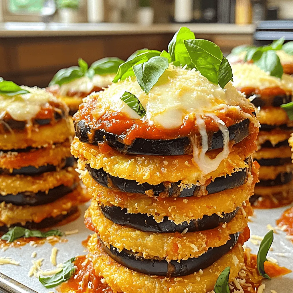 - 2 medium eggplants - 3 cups shredded mozzarella cheese - 1 cup grated Parmesan cheese - 2 cups marinara sauce Eggplants are the star here. Use medium ones for the best taste and texture. They should be firm and smooth. The cheeses add richness. Mozzarella melts beautifully, while Parmesan gives a salty punch. Marinara sauce ties it all together. You can use store-bought or homemade. Both work well. - 1 cup all-purpose flour - 3 large eggs - 2 cups Italian-seasoned breadcrumbs These pantry staples are key to coating the eggplant. Flour helps the coating stick. Eggs create a binding layer. Breadcrumbs give a crunchy finish. I like to use Italian-seasoned breadcrumbs. They add extra flavor with herbs and spices. - 1 teaspoon dried oregano - 1 teaspoon garlic powder - Salt and pepper Oregano and garlic powder add depth. They give the dish an Italian flair. Salt and pepper enhance all the flavors. Adjust these to your taste. A little goes a long way in building flavor. For the complete method of preparation, check the Full Recipe. To start, I slice the eggplants into rounds, about 1/2-inch thick. Next, I sprinkle them with salt. Salting helps draw out moisture and reduces bitterness. I let the slices rest on a paper towel for 30 minutes. After that, I pat them dry with a clean kitchen towel. This step is crucial for achieving a crispy texture. Now, I set up my breading station. I grab three shallow dishes. In the first dish, I place all-purpose flour. The second dish holds the beaten eggs. In the third dish, I add Italian-seasoned breadcrumbs. I mix the breadcrumbs with garlic powder, dried oregano, salt, and pepper to add flavor. To bread the eggplant slices, I take each slice and dip it into the flour first. I make sure it’s lightly coated. Then, I dip it into the beaten eggs, letting any extra drip off. Finally, I coat it thoroughly with the seasoned breadcrumbs. This creates a crunchy outer layer. For frying, I heat a few tablespoons of olive oil in a large skillet over medium heat. Once the oil is hot, I add the breaded eggplant slices in batches. I fry each side for about 3–4 minutes, until they turn golden brown. After frying, I use a slotted spatula to transfer them onto paper towels to drain excess oil. While frying, I preheat my oven to 375°F (190°C). This way, it’s ready for baking when I finish frying. In a baking dish, I spread a thin layer of marinara sauce on the bottom. I arrange half of the fried eggplant slices over the sauce in a single layer. Next, I spoon half of the remaining marinara sauce over the eggplant. I follow this with a generous layer of mozzarella cheese and a sprinkle of grated Parmesan. I repeat these steps with the remaining eggplant slices, adding the last of the marinara, mozzarella, and Parmesan for the top layer. Finally, I place the baking dish in the preheated oven. I bake for 25–30 minutes, until the cheese is bubbling and golden brown. This creates a comforting dish you won’t forget. To fry eggplant well, you need good oil. I like to use olive oil for its flavor. Make sure your oil is hot before adding the eggplant. This helps create a nice, crispy outside. Cook each slice for about 3-4 minutes. Look for a golden brown color. If it cooks too long, it becomes soggy. Layering is key in this dish. After you fry the eggplant, let it cool a bit. This helps the cheese melt just right. When you build your stacks, alternate layers of marinara and cheese. Start with sauce, then eggplant, followed by cheese. This way, every bite has a mix of flavors. Spread sauce evenly to cover all the eggplant. When serving, think about how to wow your guests. Place each stack on a plate. Drizzle some extra marinara around it. A sprig of fresh basil on top adds color and smell. You can serve this dish with a side salad or garlic bread. Both pair nicely and add to the meal. For the full recipe, check out the Eggplant Parmesan Stacks recipe. {{image_4}} For a vegetarian twist, you can swap out the cheese. Use plant-based cheese options, which melt well. Look for brands that offer mozzarella or Parmesan alternatives made from nuts or soy. For a vegan version, choose gluten-free breadcrumbs. They work just as well and keep the dish light. You can even make your own by blending gluten-free bread into crumbs. To add depth, consider spices like crushed red pepper or smoked paprika. These spices give a warm kick to the dish. You can also mix in fresh herbs like thyme or rosemary for a fragrant touch. Incorporate vegetables for more nutrition. Spinach, zucchini, or bell peppers can layer nicely between the eggplant. They add color and flavor, making your stacks even more delightful. You can create individual stacks for a fun serving option. Layer small stacks on plates, drizzled with sauce. This makes each dish unique and personal. For a family-style meal, try a casserole approach. Layer all ingredients in a large dish, then bake. This method is simpler and serves more people at once. Explore these variations to make your Eggplant Parmesan Stacks truly your own. Each option adds a unique twist to this classic comfort dish. Eggplant Parmesan Stacks last about three to four days in the fridge. Store them in an airtight container. This keeps the flavors fresh and prevents drying out. Make sure the dish cools down before sealing it. You don’t want steam to build up inside the container. You can freeze Eggplant Parmesan Stacks before baking. This allows you to cook them fresh later. Wrap the dish tightly in foil or plastic wrap. You can also freeze them after baking. Just let them cool completely before wrapping. For thawing, place the frozen dish in the fridge overnight. Reheat it in the oven when you’re ready to serve. To maintain texture, reheat the stacks in the oven. Set it to 350°F (175°C) and cover the dish with foil. This helps keep the cheese soft. Avoid using the microwave, as it tends to make the dish soggy. If you want a crisp top, remove the foil for the 