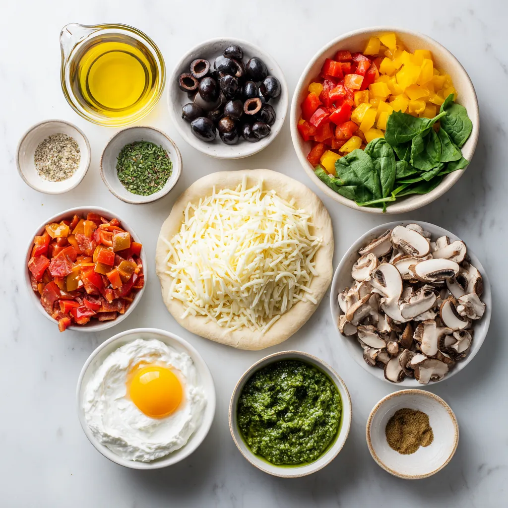 In a medium-sized mixing bowl, combine the shredded mozzarella cheese, diced vegetables, cooked meat (if you choose to include it), sliced black olives, ricotta cheese, and pesto sauce. Sprinkle in the garlic powder, Italian seasoning, and season with salt and pepper to taste. Mix everything together until well incorporated, ensuring that all ingredients are evenly distributed.