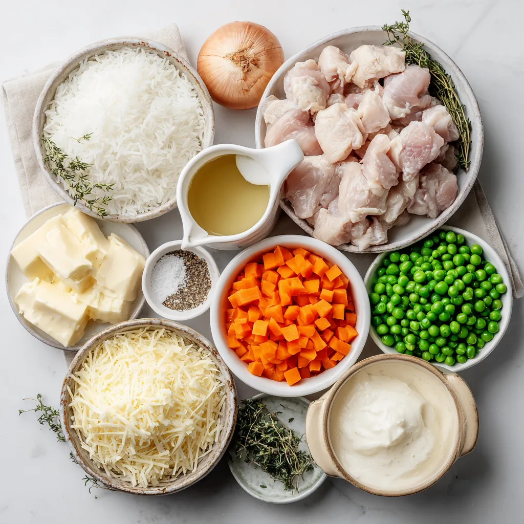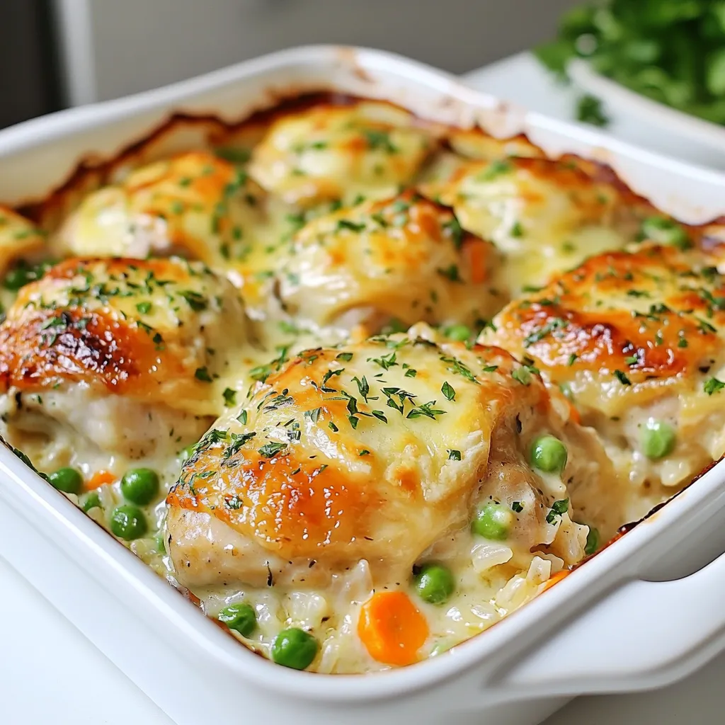 A creamy and flavorful casserole featuring chicken, rice, and vegetables, topped with melted cheese.