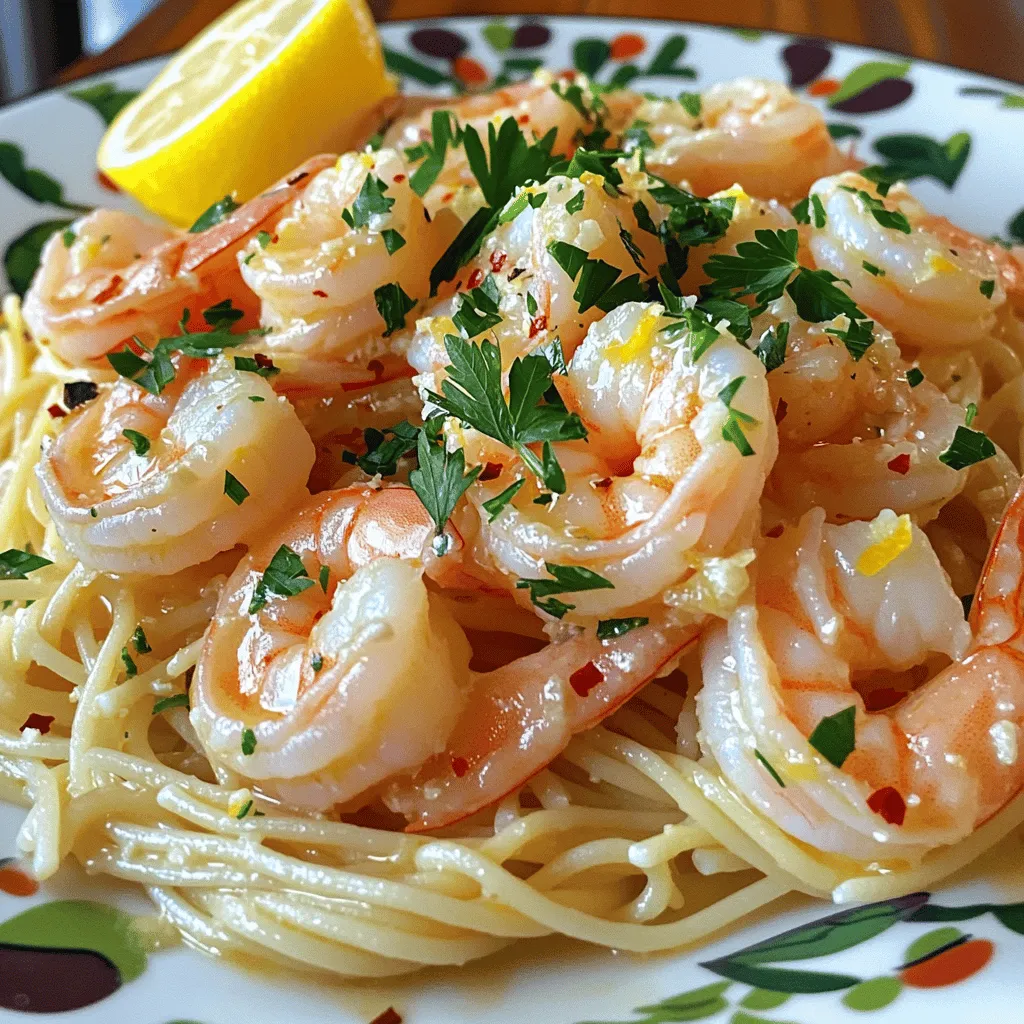 - 1 pound large shrimp - 6 tablespoons unsalted butter - 4 cloves garlic - Red pepper flakes - Lemon zest and juice - Fresh parsley - Grated Parmesan cheese - Linguine or spaghetti For this dish, I always start with fresh ingredients. The shrimp should be large and juicy. Use unsalted butter for better control over the dish’s saltiness. Garlic is key; it brings a rich flavor. When it comes to heat, red pepper flakes add a nice kick. Adjust these to your taste. Fresh lemon zest and juice brighten the dish. You’ll love how they balance the butter. Fresh parsley gives a pop of color and freshness. I like to chop it finely so it mixes well. If you want to add more, consider grated Parmesan. It adds a creamy touch. Linguine or spaghetti works well as a base. Both soak up the sauce nicely. You can find the full recipe linked above. It has all the steps to create this tasty meal. - Bring a large pot of salted water to a boil. - Add 8 ounces of linguine or spaghetti to the water. - Cook until it reaches al dente, or firm to the bite. - Before draining, save 1/2 cup of the pasta water. - Drain the pasta and keep it warm in the pot. - In a large skillet, melt 6 tablespoons of unsalted butter over medium heat. - Once melted, add 4 finely minced cloves of garlic and 1/2 teaspoon of red pepper flakes. - Sauté for 1-2 minutes, stirring often. - Make sure the garlic softens but does not brown. - Turn the heat to medium-high. - Add 1 pound of peeled and deveined shrimp to the skillet. - Season with salt, black pepper, and lemon zest. - Cook for 2-3 minutes, flipping the shrimp halfway. - Look for the shrimp to turn pink and opaque. - Lower the heat to medium after the shrimp is cooked. - Add the warm pasta to the skillet with the shrimp. - Pour in 2 tablespoons of fresh lemon juice. - Toss everything together until well mixed. - If it seems too dry, add some reserved pasta water. - Take the skillet off the heat. - Stir in 1/4 cup of finely chopped fresh parsley. - Taste and adjust the seasoning with more salt or lemon juice if needed. Enjoy your Garlic Butter Shrimp Scampi, a delicious and quick meal from the full recipe! For shrimp scampi, you want the best shrimp you can find. Fresh shrimp tastes great, but frozen shrimp works well too. When buying fresh shrimp, look for those with a mild scent. They should feel firm and look shiny. If you go for frozen, choose shrimp that are sold without ice crystals. This indicates they were frozen properly. Sizing matters. Large shrimp are ideal for this dish. They cook evenly and have a nice bite. Look for shrimp labeled "16-20 count," which means you get 16 to 20 shrimp per pound. This size gives you a good balance of flavor and texture in each bite. Garlic is the star of this dish, so you need to get it just right. Start by sautéing garlic gently. If you burn it, the taste turns bitter. Keep the heat moderate and stir it often. You want the garlic to soften and become fragrant, not brown. To infuse more flavor, consider adding a splash of white wine while cooking the shrimp. This can add a nice depth to your dish. You can also mix in some herbs like thyme or parsley for a fresh twist. When it comes to sides, light salads or crusty bread pair well with scampi. A simple arugula salad with lemon vinaigrette complements the rich garlic butter. For drinks, I love a glass of Chardonnay or Sauvignon Blanc with this meal. These wines enhance the flavors of the shrimp and garlic. They also help cleanse your palate between bites. For the full recipe, check the section above. Enjoy your cooking! {{image_4}} You can change the flavor of your Garlic Butter Shrimp Scampi with herbs. Adding fresh basil or oregano gives a nice twist. Try tossing in a handful of chopped basil right before serving. Oregano adds a warm, earthy taste. If you want a bright flavor, use a citrus herb blend. Mix lemon zest with thyme or dill for a zesty kick. It makes your dish fresh and exciting. If you need gluten-free options, swap the pasta for gluten-free linguine or spaghetti. Many brands offer great choices that taste just as good. You can also use zucchini noodles for a low-carb version. For dairy-free needs, replace unsalted butter with olive oil or vegan butter. This keeps your dish rich without any dairy. You can still enjoy the same great flavors! You can make this dish even better by adding vegetables. Try spinach, cherry tomatoes, or bell peppers. Sauté them with garlic for a healthy boost. You can also add extra protein like scallops or crab. They pair well with shrimp and make your meal more filling. Just adjust the cooking time to ensure everything is cooked perfectly. For the full recipe, check out the link provided. To store leftovers, let the shrimp scampi cool first. Then, place it in an airtight container. This keeps the flavors fresh. You can store it in the fridge for up to three days. Just remember, the shrimp may lose some texture over time. You can freeze cooked scampi. Just make sure to use a freezer-safe container. It will last for about two months. When you're ready to enjoy it again, thaw it in the fridge overnight. To reheat, warm it gently on the stove. Add a splash of water or broth to keep it moist. Prepping ingredients in advance saves time. Chop the garlic and parsley a day before. You can also peel and devein the shrimp ahead of time. For quick meals, serve it with a side salad or garlic bread. This adds variety and makes it feel special. Try using the Full Recipe for more tips! Making Garlic Butter Shrimp Scampi is quick! It takes about 10 minutes to prep. Cooking the dish takes around 10 minutes, too. So, you can have this meal ready in just 20 minutes. It’s perfect for a busy weeknight dinner. Yes, you can use different pasta shapes! While I love linguine or spaghetti, feel free to try fettuccine or penne. You can even use gluten-free pasta if you prefer. The key is to cook the pasta until it is al dente, just like the recipe suggests. To reheat shrimp
