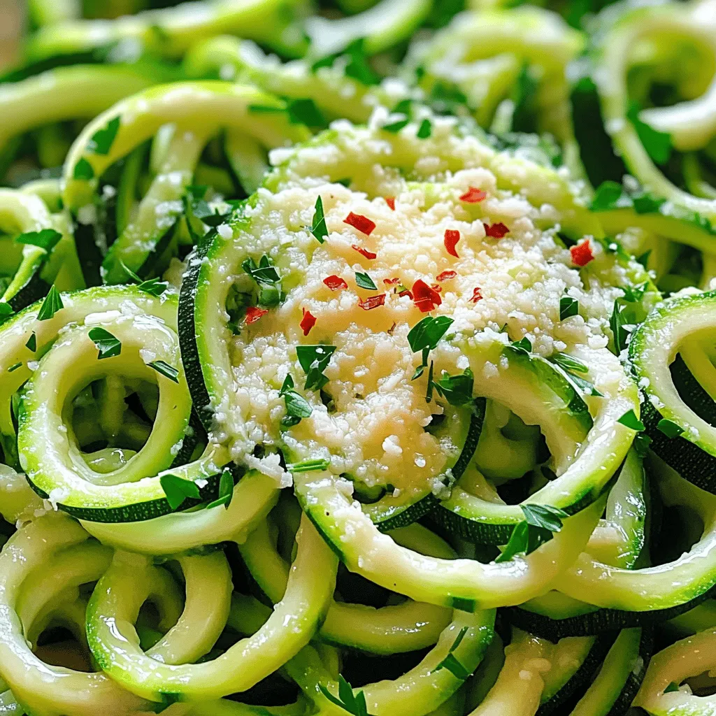 - 4 medium zucchini, spiralized into noodles - 3 tablespoons extra virgin olive oil - 4 cloves garlic, finely minced - 1/2 teaspoon red pepper flakes (optional for a kick) - 1/2 cup freshly grated Parmesan cheese - Salt and freshly ground black pepper, to taste - 2 tablespoons freshly chopped parsley, for garnish Garlic Parmesan Zoodles are simple and quick. You start with fresh zucchini. Zucchini has a mild taste that works well with garlic. You can spiralize the zucchini into noodles, which we call zoodles. This adds fun to the dish. Using extra virgin olive oil is key for flavor. It gives zoodles a rich taste. The garlic adds a strong aroma and taste. I use four cloves for a punch. If you enjoy heat, add red pepper flakes. They give a nice kick to the dish. Then, we have Parmesan cheese. Freshly grated cheese melts beautifully. It coats the zoodles and adds creaminess. Don't forget to season with salt and pepper. This makes sure every bite tastes great. Finally, sprinkle fresh parsley on top. It adds color and freshness to the dish. Garlic Parmesan Zoodles are low in calories. One serving has about 250 calories. They are low in fat and carbs too. This dish has about 15 grams of fat and 8 grams of carbs. Each serving also packs around 10 grams of protein. Zoodles are a low-carb alternative to pasta. They help reduce carbs in meals. Zucchini is full of dietary fiber. Fiber helps digestion and keeps you full longer. Zoodles also contain vitamins A and C. These vitamins are good for your skin and immune system. Eating zoodles is a tasty way to enjoy healthy food. To make zoodles, you need a spiralizer. First, wash the zucchini well. Cut off the ends of each zucchini. Place one zucchini in the spiralizer and twist to create long noodles. Repeat this with the other zucchinis. After spiralizing, place the zoodles in a bowl and set them aside for later. In a large skillet, pour in the olive oil and warm it over medium heat. Wait until the oil shimmers. Then, add the minced garlic. Sauté it for 1-2 minutes, stirring often. You want it fragrant, not burnt. If you like a bit of heat, sprinkle in the red pepper flakes now. Stir for another minute to mix in the spice. Next, gently add the zoodles to the skillet. Toss them in the garlicky oil. Sauté for about 3-4 minutes. They should be tender but still crunchy. Take the skillet off the heat. Immediately sprinkle the grated Parmesan cheese over the zoodles. Toss everything together well. The cheese will start to melt and coat the zoodles. Season with salt and freshly ground black pepper to taste. Serve warm, topped with chopped parsley for a fresh touch. This dish is simple yet full of flavor. For the full recipe, check here. To get that perfect garlic taste, keep these tips in mind. Start with fresh garlic; it has the best flavor. Mince it finely so it cooks evenly. Heat the oil over medium heat, but watch it closely. If garlic burns, it turns bitter. This can ruin your dish. Sauté the garlic for just 1-2 minutes until it smells amazing. If you want some heat, add red pepper flakes after the garlic. This way, the spice blends well without overpowering the garlic. For zoodles, the cooking time is key. You want them tender but still firm. Aim for 3-4 minutes of cooking. This keeps them al dente, which is great for texture. Overcooking makes zoodles soggy and watery. Keep tossing them gently in the pan. This helps them cook evenly. Remember, zoodles cook faster than regular pasta. So keep an eye on them! How you serve Garlic Parmesan Zoodles can elevate your meal. Use a shallow bowl for a nice look. Place the zoodles in the center, then add a sprinkle of parsley on top. For extra flair, drizzle a little olive oil around the edges. This adds a touch of elegance. You can also add a few extra parsley leaves for color. A well-plated dish makes your meal even more enjoyable! For the complete recipe, check out the Full Recipe section. {{image_4}} You can make Garlic Parmesan Zoodles even more filling by adding protein. Chicken works great. Simply sauté bite-sized pieces along with the garlic. Shrimp is another tasty option. Cook the shrimp until pink and add them with the zoodles. For a plant-based choice, try tofu. Use firm tofu, cut it into cubes, and sauté until golden. This way, you get more flavor and nutrients in your dish. Want to change up the taste? You can add different herbs and spices. Basil brings a sweet touch. Oregano adds a warm, earthy flavor. If you like heat, try crushed red pepper flakes. They add a nice kick. Fresh herbs like thyme or dill can also enhance your zoodles. Get creative with your spice rack to find your favorite combo. Zoodles are not just for zucchini! You can mix in other spiralized veggies for fun. Carrots add a sweet crunch. Sweet potatoes bring a hearty taste. You can also try butternut squash for a creamy texture. This mix not only adds color but also boosts nutrition. Get your spiralizer ready for a colorful veggie feast! For a full recipe, check out the Garlic Parmesan Zoodles. To keep your zoodles fresh, place them in an airtight container. Make sure they cool down first. Add a paper towel inside the container to absorb moisture. This helps prevent sogginess. Store them in the fridge and use within 2-3 days for best quality. When reheating zoodles, avoid the microwave if possible. Microwaving can make them mushy. Instead, heat a skillet over medium-low heat. Add a small amount of olive oil. Toss the zoodles gently until warm. This keeps their nice texture and flavor intact. Freezing zoodles is easy but requires some prep. First, blanch them in boiling water for 1-2 minutes. This helps keep their color and texture. Drain and cool them quickly in ice water. Once cooled, pack them in freezer bags, removing as much air as you can. They can last up to 3 months in the freezer. To use, thaw them in the fridge overnight before cooking. Zoodles are noodles made from zucchini. They are a fun, low-carb alternative to pa