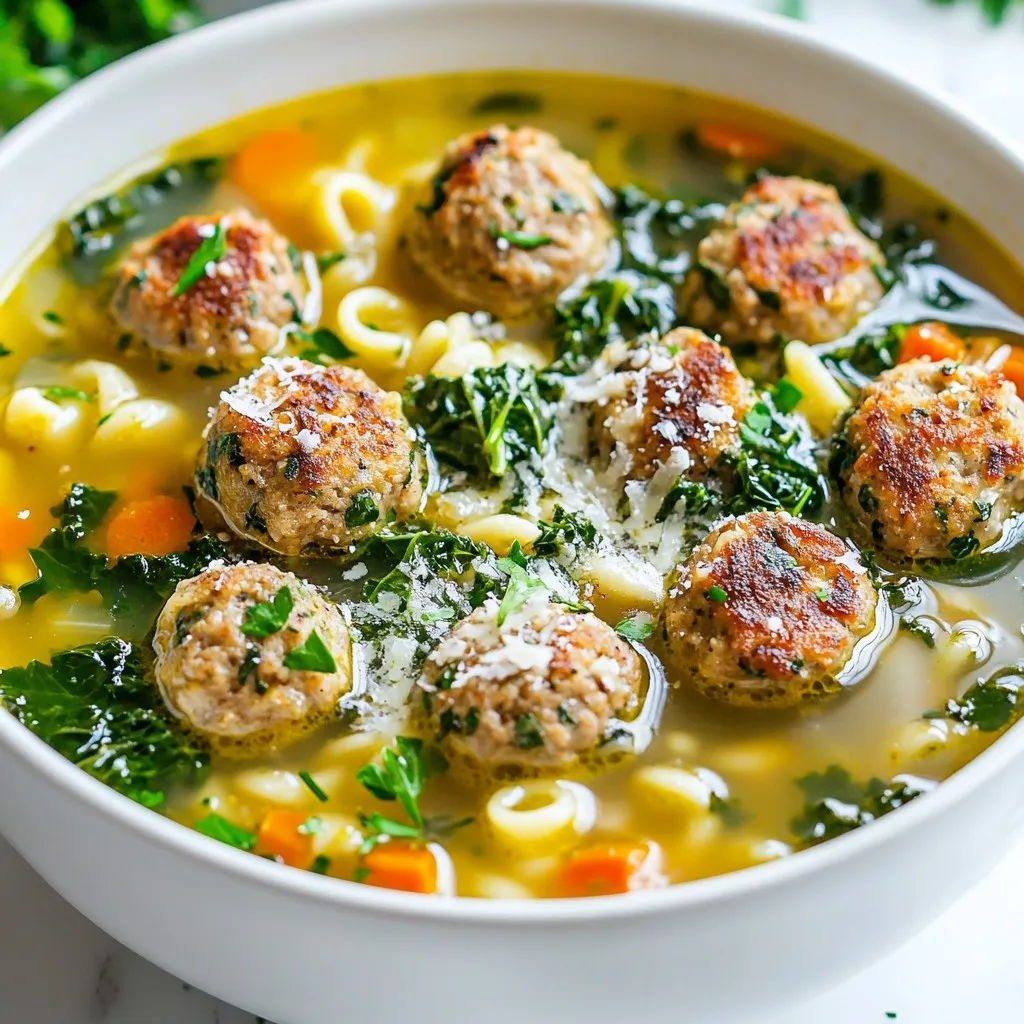 A comforting Italian soup filled with meatballs, vegetables, and pasta.