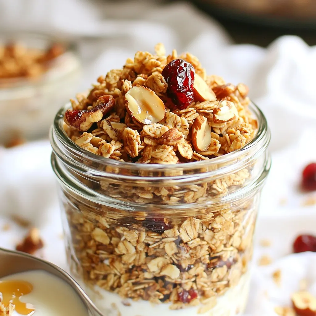 For a delightful presentation, serve the granola in a clear glass jar or a rustic bowl. Top with yogurt and honey for added sweetness.