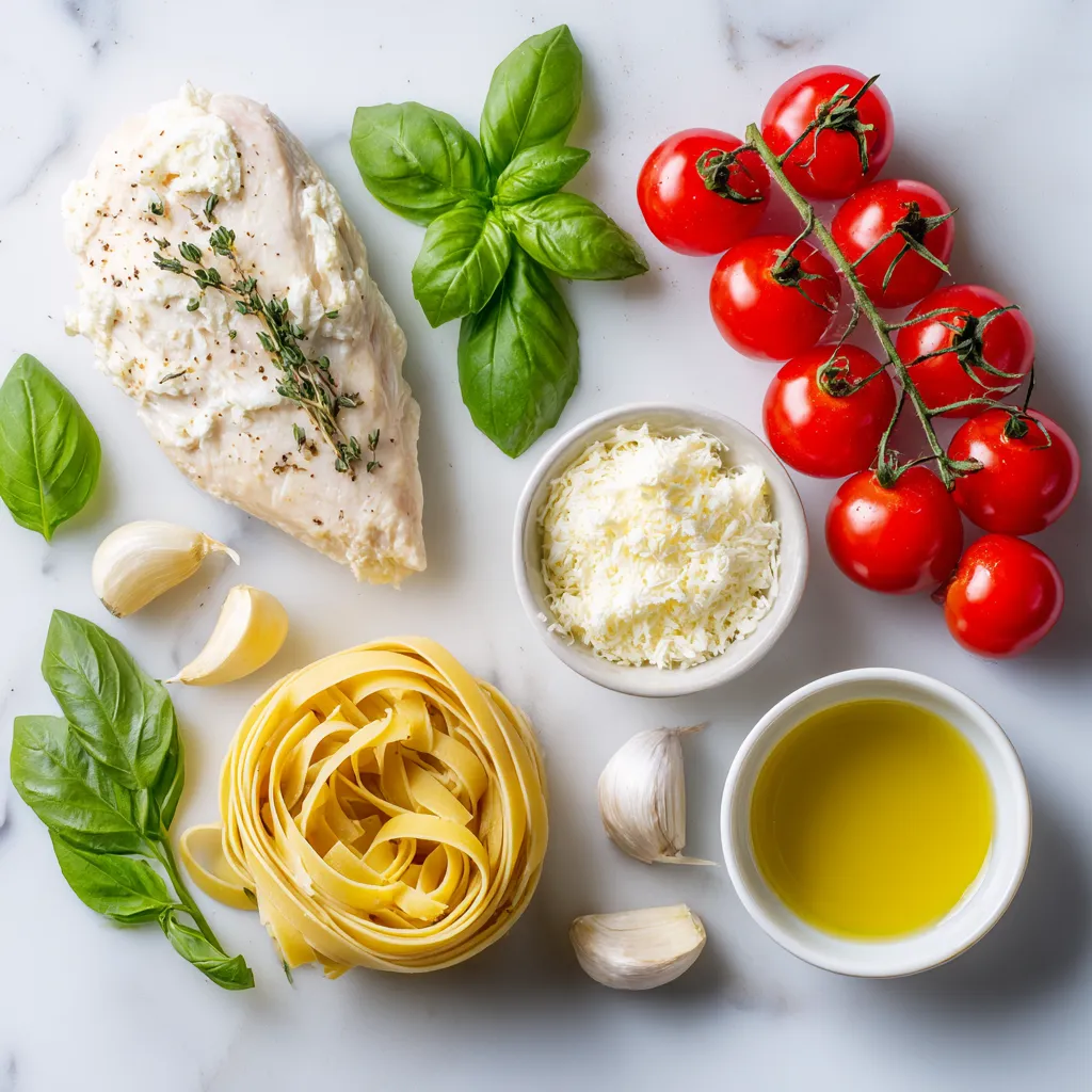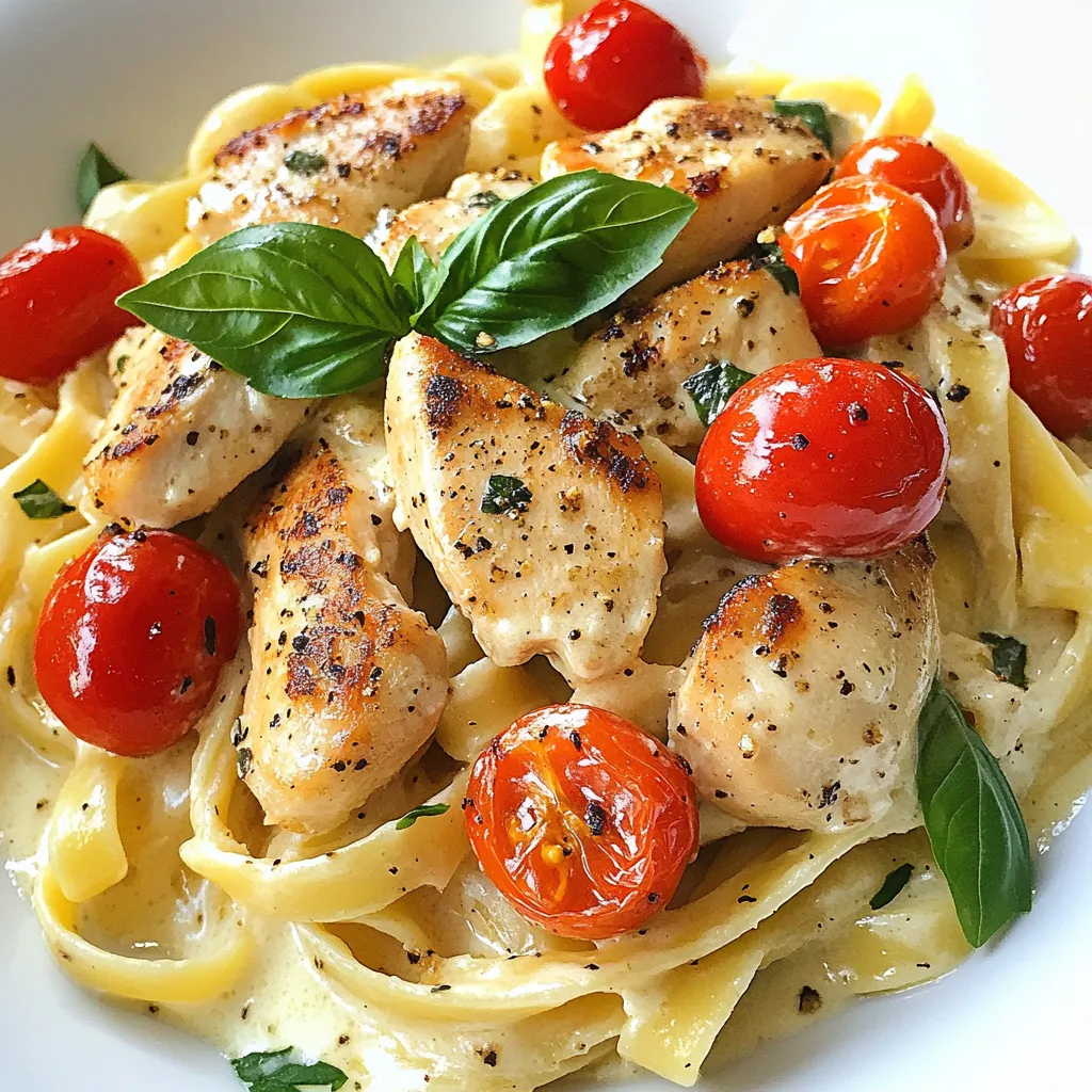 A creamy and flavorful pasta dish featuring seasoned chicken breasts, cherry tomatoes, and a rich sauce, perfect for a romantic dinner.