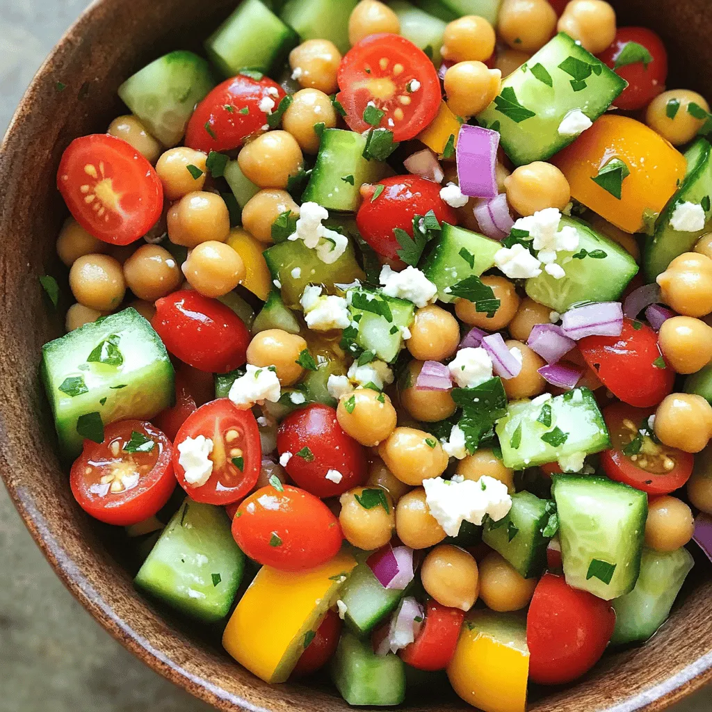 To make the Mediterranean Chickpea Salad, gather these fresh ingredients: - 1 can chickpeas (approximately 15 ounces), drained and rinsed - 1 medium cucumber, diced into bite-sized pieces - 1 cup cherry tomatoes, halved for vibrant color - 1/2 medium red onion, finely chopped for a mild flavor - 1 bell pepper (choose either red or yellow), diced for a sweet crunch - 1/4 cup Kalamata olives, pitted and sliced for a briny kick - 1/4 cup feta cheese, crumbled (optional, for a creamy finish) - 2 tablespoons fresh parsley, chopped for freshness - 3 tablespoons extra virgin olive oil for richness - 2 tablespoons red wine vinegar (or substitute with fresh lemon juice for a zesty twist) - 1 teaspoon dried oregano for an aromatic touch - Salt and pepper to taste You can adjust this salad to fit your taste. Here are some optional ingredients you might enjoy: - Avocado, diced for creaminess - Arugula or spinach for added greens - Sun-dried tomatoes for a tangy flavor - Canned tuna or grilled chicken for extra protein - Nuts or seeds for crunch This salad is not just tasty; it offers great nutrition too! Each serving provides: - Calories: Approximately 220 - Protein: 7 grams - Carbohydrates: 22 grams - Fiber: 6 grams - Fats: 12 grams - Vitamins: A, C, and K from the veggies - Minerals: Iron and calcium from chickpeas and feta This salad is balanced and full of flavors! Enjoy making it your own! Start by rinsing and draining the can of chickpeas. This step helps remove excess salt. Next, use a knife to dice one medium cucumber into small pieces. Cut one cup of cherry tomatoes in half for color and taste. Finely chop half of a medium red onion. Dice one bell pepper, choosing either red or yellow for sweetness. Lastly, slice a quarter cup of Kalamata olives and set them aside. In a large mixing bowl, combine all the prepared ingredients. Add the drained chickpeas, diced cucumber, halved cherry tomatoes, chopped red onion, diced bell pepper, and sliced olives. Mix everything well to ensure even distribution. If you want a creamy touch, gently fold in the crumbled feta cheese. Toss in two tablespoons of freshly chopped parsley to brighten the salad. In a small bowl, whisk together three tablespoons of extra virgin olive oil and two tablespoons of red wine vinegar. If you prefer, you can use fresh lemon juice instead. Add one teaspoon of dried oregano, along with salt and pepper to taste. Blend until the dressing is smooth and well combined. Drizzle this dressing over your salad mixture and toss gently. This helps coat each ingredient, allowing the flavors to meld beautifully. Cover the bowl and refrigerate for at least 30 minutes. This wait enhances the salad's flavor before serving. - Use fresh ingredients for the best taste. Fresh veggies make the salad bright. - Rinse the chickpeas well. This removes excess sodium and improves flavor. - Let the salad chill for at least 30 minutes. This helps flavors mix well. - Taste and adjust seasoning before serving. You want every bite to pop! - Don’t skip the marinating step. It truly enhances the salad’s taste. - Avoid over-mixing the salad. You want the veggies to stay crisp. - Don’t use too much dressing. Start with less and add more if needed. - Forgetting to taste can lead to bland flavors. Always sample before serving. - Add a pinch of red pepper flakes for heat. It adds a nice kick to the mix. - Squeeze fresh lemon juice just before serving. This brightens the flavors. - Try adding diced avocado for creaminess. It pairs well with chickpeas. - Use herbs like mint or dill for an extra layer of flavor. They add freshness and complexity. {{image_4}} You can easily make this salad vegetarian or vegan. The main ingredient, chickpeas, is already plant-based. To keep it vegan, skip the feta cheese. The salad still tastes great without it. You can add more veggies like shredded carrots or avocado for extra flavor and texture. Need to adjust for dietary needs? No problem! If you're allergic to olives, leave them out or use capers for a similar taste. For a nut-free option, avoid using nuts as toppings. If you prefer a different cheese, try goat cheese. You can also switch red wine vinegar for apple cider vinegar if you like a milder taste. Using fresh, seasonal ingredients makes the salad even better. In summer, add ripe peaches or watermelon for sweetness. In fall, use roasted pumpkin or butternut squash for a cozy twist. Seasonal ingredients not only enhance flavor but also add color to your dish. Always look for what’s fresh at your local market! After making the Mediterranean chickpea salad, you might have some leftovers. To keep it fresh, store the salad in an airtight container. Place it in the fridge right away. This helps maintain the flavors and crunch of the veggies. Your salad can last up to three days in the fridge. Keep in mind that the longer it sits, the softer it gets. Freezing this salad is not the best idea. The veggies will lose their texture. However, if you want to freeze it, only freeze the chickpeas and the dressing. Do not freeze the fresh veggies or feta cheese. When you are ready to eat, thaw the chickpeas and dressing in the fridge before mixing them with fresh ingredients. You don't usually need to reheat a salad. However, if you prefer it warm, heat the chickpeas gently in a skillet. Add a splash of olive oil to keep them moist. Avoid cooking the fresh veggies, as they are best enjoyed raw. After warming the chickpeas, mix them back into the salad right before serving. This way, you keep the crunch and freshness intact. You can serve this salad with many dishes. Grilled chicken pairs well. Fish adds a nice touch too. For a vegetarian option, try serving it with pita bread or hummus. It also goes great with rice or quinoa. You can even enjoy it as a light meal on its own. You can keep the salad in the fridge for about 3 days. The flavors get better as it sits. However, the veggies may lose some crunch after this time. Store it in 