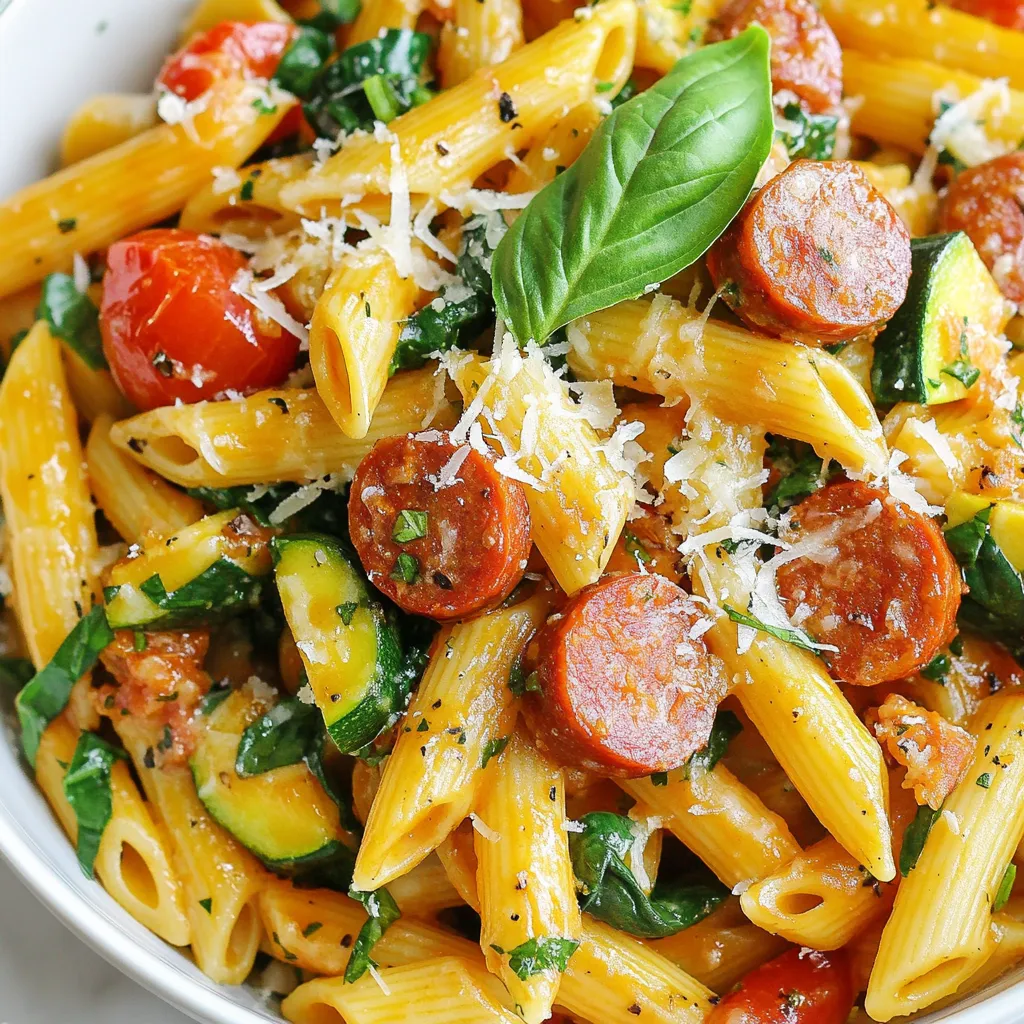 - 8 oz. penne pasta - 12 oz. kielbasa, sliced - 1 tablespoon extra virgin olive oil - 1 medium onion, finely diced - 3 cloves garlic, minced - 1 red bell pepper, thinly sliced - 1 medium zucchini, diced - 4 cups low-sodium chicken broth - 1 teaspoon dried Italian seasoning - 1/2 teaspoon red pepper flakes (optional) - Salt and freshly cracked pepper - 1 cup cherry tomatoes, halved - 1 cup fresh spinach, chopped - 1/2 cup finely grated Parmesan cheese - Fresh basil leaves for garnish This dish starts with simple ingredients. Each one plays a key role. First, the penne pasta gives a nice bite. Next, the kielbasa adds a rich, savory flavor. The olive oil helps the ingredients cook well. Then, we have the onion and garlic. They create a fragrant base. The red bell pepper and zucchini add color and crunch. Chicken broth is vital. It brings moisture and depth to the dish. Italian seasoning gives it a lovely, herby taste. If you like spice, the red pepper flakes are optional. Don't forget salt and pepper to taste. They enhance all the flavors. Cherry tomatoes add sweetness, while spinach brings freshness. Finally, Parmesan cheese makes it creamy and rich. Gather these ingredients, and you are ready to make a delicious meal. It’s simple, yet so flavorful! {{ingredient_image_2}} First, grab a large pot. Pour in one tablespoon of olive oil and heat it over medium heat. Watch for it to shimmer. Then, add the sliced kielbasa. Cook it for about 5-7 minutes. You want it browned and a bit crispy. This step adds great flavor. Next, add the finely diced onion, minced garlic, and thinly sliced red bell pepper to the pot. Stir well and cook for 3-4 minutes. The onion should turn translucent, and the peppers will soften. This mix will bring out a sweet aroma. Now, it’s time for the zucchini. Add the diced zucchini and stir everything together. Carefully pour in 4 cups of low-sodium chicken broth. Bring this to a gentle simmer. Once simmering, add the 8 oz. of penne pasta, 1 teaspoon of dried Italian seasoning, and 1/2 teaspoon of red pepper flakes if you like some heat. Season with salt and freshly cracked pepper. Make sure the pasta is fully submerged. Cover the pot and let it simmer for 10-12 minutes. Stir occasionally to keep the pasta from sticking. After the pasta cooks to your liking, fold in 1 cup of halved cherry tomatoes and 1 cup of chopped spinach. Cook for another 2-3 minutes until the spinach wilts and the tomatoes soften. Remove the pot from heat. Stir in 1/2 cup of finely grated Parmesan cheese. This makes the dish creamy. Taste and adjust the seasoning if needed. You can add more salt or pepper. To ensure even cooking of your pasta, always stir it during cooking. This helps prevent sticking and allows the pasta to absorb the rich flavors. Make sure the pasta is fully submerged in the broth. If it’s not, add a bit more broth or water. This will keep it from becoming dry. If you want to add some heat, increase the red pepper flakes. For a milder dish, skip them altogether. You can also add a splash of hot sauce for a different spice profile. Taste as you go, and adjust until you find your perfect level of heat. For a creamier sauce, use more Parmesan cheese. It melts beautifully and adds a rich flavor. You can also stir in a splash of heavy cream or a dollop of cream cheese after cooking. This will make your dish even more luscious and satisfying. Pro Tips Cook Pasta Al Dente: Make sure to cook the penne pasta until it is al dente to ensure the best texture. It will continue to absorb liquid while resting, so slightly undercooking it is a great strategy. Enhance Flavor: For an added depth of flavor, consider browning the kielbasa longer until it’s caramelized. This creates a rich, savory base for your dish. Vegetable Variations: Feel free to mix up the vegetables! Seasonal veggies like asparagus or mushrooms can be great substitutes in this recipe. Garnish for Freshness: Don’t skip the fresh basil leaves! They not only add a burst of color but also a fresh, aromatic touch that brightens the dish. {{image_4}} You can make your one pot kielbasa pasta even more colorful and healthy. Here are some great veggies to try: - Mushrooms: They add a nice earthy flavor. - Broccoli: Toss in some florets for crunch. - Carrots: Dice them for a sweet touch. - Peas: Add them for a pop of color and sweetness. Feel free to mix and match these vegetables. They not only boost nutrition but also add fun flavors to your dish. If you want to switch up the protein, there are many options. You can try: - Chicken: Use bite-sized pieces. Cook them until golden. - Turkey Sausage: A lighter option that still packs flavor. - Tofu: For a vegetarian choice, use firm tofu. Sauté it to add texture. These substitutes keep the meal exciting and cater to different diets. You can use other pasta shapes besides penne. Here are a few ideas: - Fusilli: Its twists hold sauce well. - Farfalle: These bow-ties add a fun look. - Shells: They catch the sauce nicely. Choosing different pasta shapes can change the meal's texture and fun. Enjoy experimenting! To store leftovers safely, let the dish cool down. Once cooled, place it in an airtight container. Make sure to cover it tightly to keep it fresh. This meal lasts about 3 to 4 days in the fridge. Always check for any bad smells or changes in color before eating leftovers. If you want to freeze your pasta, first allow it to cool completely. Then, transfer it to a freezer-safe container. You can also use heavy-duty freezer bags, removing as much air as you can. It will stay good for about 2 to 3 months in the freezer. When you're ready to eat it, just thaw it in the fridge overnight. To reheat your One Pot Kielbasa Pasta, the best method is on the stove. Place it in a pot over medium heat. Add a splash of chicken broth or water to prevent it from drying out. Stir it often until it's heated through. You can also use a microwave, but be sure to cover it to keep the moisture in. Hea