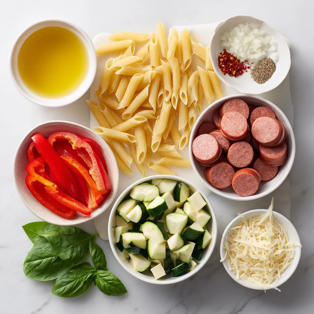 First, the penne pasta gives a nice bite. Next, the kielbasa adds a rich, savory flavor. The olive oil helps the ingredients cook well.