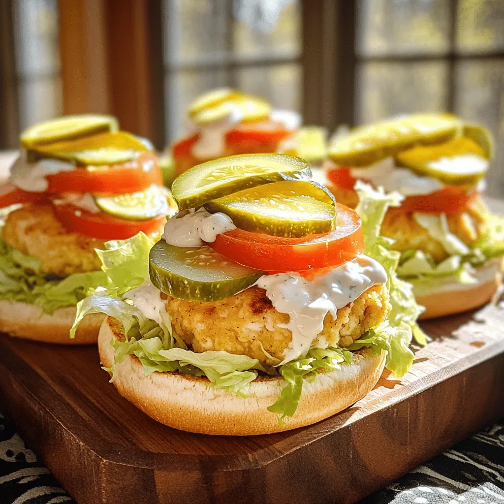 - 1 lb ground chicken - 1/2 cup dill pickle relish - 1/4 cup ranch dressing These main ingredients are key to making your sliders flavorful. The ground chicken provides a great base, while the dill pickle relish adds a nice crunch and tang. Ranch dressing brings a creamy and zesty flavor that ties everything together. - 1/2 cup breadcrumbs - 1 teaspoon garlic powder - 1 teaspoon onion powder - 1/2 teaspoon black pepper - 1/2 teaspoon salt - 6 slider buns - 1 cup shredded lettuce - 1 large tomato, sliced The breadcrumbs help bind the chicken mixture, giving it a nice texture. Garlic and onion powders add depth to the flavor. The slider buns make it easy to enjoy these delicious bites, while the lettuce and tomato keep things fresh. - Sliced pickles - Fresh parsley - Additional ranch dressing Garnishes add a fun touch to your sliders. Sliced pickles provide extra crunch, while fresh parsley adds color and a hint of earthiness. Drizzling more ranch on top gives each bite an extra burst of flavor. For the full recipe, check the details below. To start, take a large mixing bowl. Add the following main ingredients: - 1 lb ground chicken - 1/2 cup dill pickle relish - 1/4 cup ranch dressing - 1/2 cup breadcrumbs - 1 teaspoon garlic powder - 1 teaspoon onion powder - 1/2 teaspoon black pepper - 1/2 teaspoon salt Mix these together well. Use your hands or a spoon to ensure all ingredients blend smoothly. You want a uniform mixture so every bite is packed with flavor. Next, divide that mixture into six equal portions. You can use a measuring cup for accuracy. Shape each portion into a patty. Make each patty slightly larger than the slider buns. This way, they will fit perfectly after cooking. Now, it’s time to cook! You can choose between a skillet or a grill. If using a skillet, preheat it over medium heat. Place the chicken patties in the skillet or on the grill. Cook each side for about 5-6 minutes. Check the internal temperature; it should reach 165°F (75°C) for safety. While the patties cook, toast the slider buns. You can toast them in the same skillet after removing the chicken or in a separate pan. Aim for a golden brown color to add crunch. Once everything is cooked, assemble your sliders. Place a patty on the bottom half of each bun. Top it with shredded lettuce, a tomato slice, and any extra pickles if you like. Drizzle more ranch dressing on top before placing the bun's top half. Enjoy your Pickle Ranch Chicken Sliders! For the detailed recipe, check the Full Recipe. To keep your chicken patties juicy, do not overcook them. Cook the patties for about 5-6 minutes on each side. Use a meat thermometer to check that they reach 165°F (75°C). This ensures they are safe to eat and not dry. To ensure even cooking, shape the patties uniformly. Make them slightly larger than the buns, as they will shrink while cooking. This helps them stay juicy and flavorful. For perfect toasting, use medium heat. A non-stick skillet works great. After you cook the patties, toast the buns in the same pan. This adds flavor from the chicken drippings. Toast for about 2-3 minutes or until golden brown. Timing is key. Start toasting your buns just before the patties finish cooking. This way, everything is warm and ready at the same time. When assembling, layer the toppings wisely. Place the chicken patty first, then add shredded lettuce. Next, add a slice of tomato and pickles. This order keeps the bun from getting soggy. For a great presentation, use a colorful platter. Arrange the sliders neatly and add a bowl of ranch dressing in the center. Garnish with parsley or extra pickle slices for a pop of color. This makes your sliders look as good as they taste! For the full recipe, click here. {{image_4}} You can have fun with ingredient swaps in this recipe. Try using other proteins like turkey or beef instead of chicken. If you want a veggie option, use black beans or lentils for a tasty twist. You can also change up the flavors by adding different spices. Try paprika for some warmth or chili powder for a bit of heat. These sliders pair well with many sides. Serve them with crispy fries for a classic combo. A fresh garden salad can add a nice crunch too. For gatherings, set up a slider bar. Let guests add their favorite toppings like extra pickles or different sauces. It makes for a fun and interactive meal! If you need gluten-free options, swap out the slider buns for lettuce wraps. This keeps the flavor but cuts carbs. For a low-carb alternative, use grilled portobello mushrooms as your bun. They give a nice meaty texture and flavor. Remember, these simple swaps keep the dish delicious while meeting dietary needs. Check the Full Recipe to see how easy it can be! To keep your Pickle Ranch Chicken Sliders fresh, cool them down quickly. Place them in a shallow container. This helps air circulate and cools the food faster. Use airtight containers or wrap them tightly in plastic wrap. This prevents moisture loss and keeps them tasty. Store them in the fridge for up to three days. When you're ready to enjoy your sliders again, use the oven or stovetop. Preheat the oven to 350°F (175°C). Place the sliders on a baking sheet. Heat for about 10 minutes or until warm. If you use the stovetop, heat a skillet over medium-low heat. Add the sliders and cover with a lid. This keeps them moist and helps maintain their flavor and texture. You can freeze the cooked patties or raw patties. For cooked patties, let them cool completely. Wrap them tightly in plastic wrap and then foil. For raw patties, shape them and place them on a baking sheet. Freeze until firm, then transfer them to a bag. This prevents freezer burn. When you're ready to cook from frozen, thaw them in the fridge overnight. Cook them fully, reaching an internal temperature of 165°F (75°C). Pickle Ranch Chicken Sliders are small sandwiches made with ground chicken. They mix dill pickle relish and ranch dressing for a tasty treat. These sliders are popular be