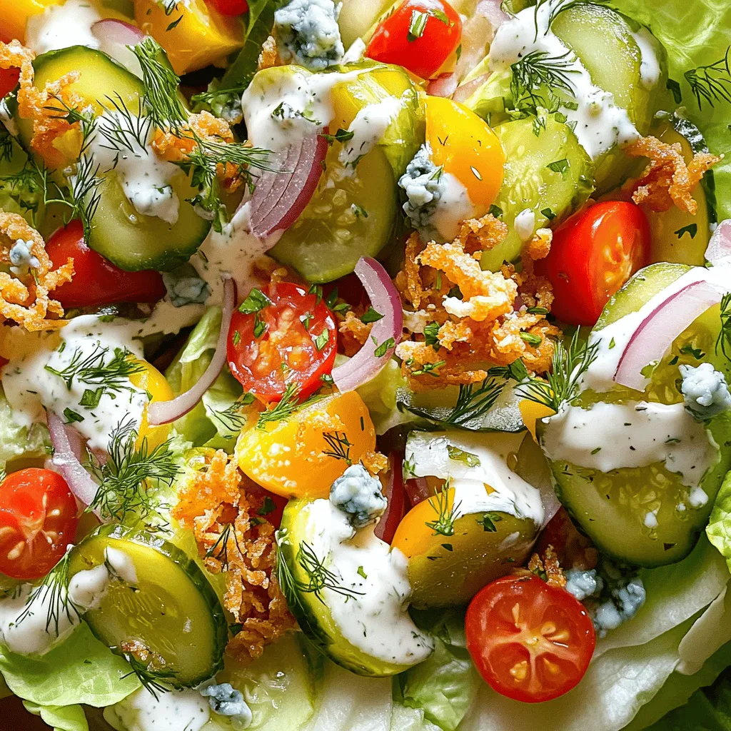 Each of these ingredients adds a special touch. Iceberg lettuce gives a nice crunch. Dill pickles bring a tangy kick. The ranch dressing adds creaminess. Cherry tomatoes add sweetness. Red onion gives a sharp bite. Blue cheese or feta provides a rich flavor. Fresh dill adds brightness. Seasoning ties the flavors together. You can also add fried onions for extra crunch.