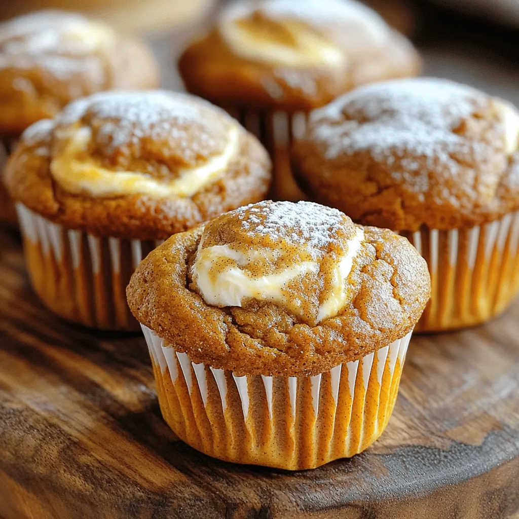 - 1 cup canned pumpkin puree - 1/2 cup cream cheese, softened - 1/2 cup granulated sugar - 1/2 cup brown sugar, tightly packed - 1/2 cup vegetable oil - 2 large eggs, at room temperature - 1 teaspoon pure vanilla extract - 1 1/2 cups all-purpose flour - 1 teaspoon baking powder - 1 teaspoon baking soda - 1 teaspoon ground cinnamon - 1/4 teaspoon ground nutmeg - 1/4 teaspoon ground ginger - 1/2 teaspoon salt Using canned pumpkin puree saves time and adds moisture. If you prefer fresh pumpkin, roast it first for the best flavor. Cream cheese should be softened to mix well, but you can use Greek yogurt as a lighter swap. For sweeteners, you can substitute coconut sugar for a deeper taste. Vegetable oil ensures the muffins stay moist, but melted coconut oil works, too. Make sure to use room-temperature eggs; they blend better, leading to fluffier muffins. If you want a nutty flavor, consider adding chopped walnuts or pecans. Remember, high-quality spices make a big difference in taste. Use fresh ground cinnamon, nutmeg, and ginger for the best results. 1. Prepping the oven and muffin tin: Start by preheating your oven to 350°F (175°C). This step is key to getting those muffins just right. Line a muffin tin with paper liners or grease each cup lightly. This helps prevent sticking. 2. Mixing the cream cheese filling: Take a medium bowl and add the softened cream cheese, granulated sugar, and brown sugar. Use a hand mixer or whisk to combine them. Mix until the mixture is smooth and creamy. Set this aside for later. 3. Combining wet ingredients: In a large bowl, mix together the canned pumpkin puree, vegetable oil, eggs, and vanilla extract. Use a whisk to blend everything well. It should look uniform in color and texture. 1. Sifting the dry mixture: In another bowl, sift together the all-purpose flour, baking powder, baking soda, ground cinnamon, ground nutmeg, ground ginger, and salt. This step helps to aerate the flour and mix the spices evenly. 2. Gradual incorporation with wet ingredients: Slowly add the dry mixture into the wet pumpkin mixture. Use a spatula to fold them together gently. Be careful not to overmix. It's okay if some lumps remain; they add to the texture. 1. Filling the muffin cups: Spoon the pumpkin batter into each muffin cup, filling them halfway. Then, add a generous spoonful of the cream cheese mixture on top of each muffin. Use a toothpick or skewer to gently swirl the mixtures together. This creates a nice marbled look. 2. Baking time and indicators of doneness: Add a bit more pumpkin batter on top of the cream cheese mixture so each cup is about three-quarters full. Bake the muffins for 20-25 minutes. To check if they are done, insert a toothpick into the center. If it comes out clean, they are ready. Let them cool in the tin for about 5 minutes before moving them to a wire rack to cool completely. To get the best texture in your muffins, avoid overmixing the batter. When you mix too much, the muffins can turn out tough. Just fold the ingredients gently until you see no dry flour. Some lumps are okay! For the cream cheese swirl, use a toothpick or skewer. After spooning the cream cheese mixture onto the batter, gently swirl it. Move the toothpick in a figure-eight motion. This creates a nice marbled look without fully blending the two mixtures. Adding spices can boost the flavor of your muffins. I recommend using fresh ground spices when you can. They taste better! You can add more cinnamon or a pinch of cloves for a warm flavor. Always choose high-quality ingredients. Use real vanilla extract instead of imitation. Opt for pure pumpkin puree. It makes a big difference in taste and richness. For this recipe, you'll need a few basic tools. A good mixing bowl and a whisk or hand mixer will work well. A spatula is essential for folding the ingredients without overmixing. Use muffin liners for easy cleanup. If you prefer, lightly grease each muffin cup with oil or butter. This will help the muffins release easily after baking. {{image_4}} To make pumpkin cream cheese muffins even more fun, try adding chocolate chips. They add a sweet twist and pair well with the pumpkin flavor. Use about 1 cup of semi-sweet chocolate chips. Just fold them into the batter before you scoop it into the muffin cups. You can also incorporate nuts or seeds. Chopped walnuts or pecans give a nice crunch. Use about 1/2 cup of your choice. If you prefer seeds, pumpkin seeds work great. They add a healthy touch too. Just mix them in with the batter for a delightful surprise in every bite. If you're looking for gluten-free options, you can swap all-purpose flour with a gluten-free blend. Look for blends that work well for baking. These usually contain a mix of rice flour, tapioca, and potato starch. This change keeps the muffins soft and tasty. For a vegan version, replace the eggs with flax eggs. To make a flax egg, mix 1 tablespoon of ground flaxseed with 2.5 tablespoons of water. Let it sit for about 5 minutes to thicken. You can also use vegan cream cheese instead of regular cream cheese. This way, you still get that creamy filling, but it fits a vegan diet. After baking your pumpkin cream cheese muffins, let them cool in the tin for about 5 minutes. This short rest helps them firm up without sticking. Then, move them to a wire rack. This allows air to flow around the muffins, preventing sogginess. For storing, use an airtight container. Place parchment paper between layers to keep them from sticking. Store the muffins at room temperature for up to 3 days. If you want to keep them longer, the fridge is a good option. They can last about a week in there. To freeze your muffins, allow them to cool completely first. Then, wrap each muffin tightly in plastic wrap. This prevents freezer burn and keeps them fresh. Place wrapped muffins in a freezer bag or container. They can stay frozen for up to 3 months. When you're ready to enjoy, remove a muffin from the freezer. You can reheat it directly in th