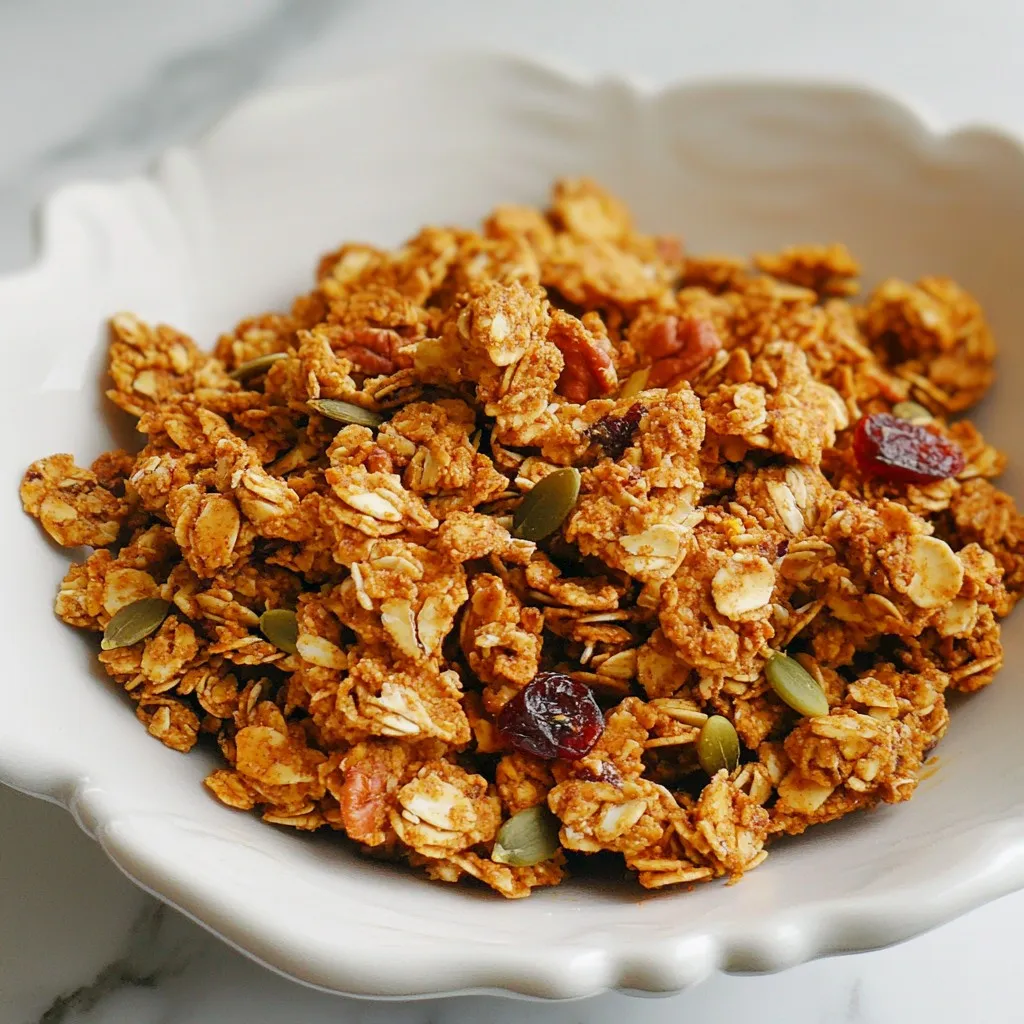 - 2 cups rolled oats - 1 cup pumpkin seeds - 1 cup chopped pecans - 1/2 cup honey or maple syrup - 1/3 cup melted coconut oil - 1 teaspoon pure vanilla extract - 1 tablespoon pumpkin spice blend - 1/2 teaspoon fine sea salt - 1/2 cup dried cranberries or raisins Pumpkin spice granola clusters are a treat you can enjoy any time. The main ingredients create a great base. Rolled oats give the clusters a nice chewy texture. Pumpkin seeds add crunch and good nutrition. Chopped pecans bring a rich, nutty flavor. Honey or maple syrup acts as a sweet binder. For flavor, melted coconut oil makes the granola crisp and tasty. Pure vanilla extract adds warmth. The pumpkin spice blend is key here, giving that cozy fall taste. Finally, sea salt balances the sweetness and enhances all the flavors. You can also add dried cranberries or raisins for a fruity kick. These optional add-ins bring a nice contrast to the spices. They make each bite a little more exciting. Feel free to mix and match. Use different nuts or add seeds based on what you like. The key is to have fun and make it your own! {{ingredient_image_2}} - Preheat oven to 350°F (175°C). - Line baking sheet with parchment paper. Start by preheating your oven. This step gets your oven ready for baking. The parchment paper keeps the granola from sticking. - Combine rolled oats, pumpkin seeds, chopped pecans, and sea salt. In a large bowl, add the rolled oats, pumpkin seeds, and chopped pecans. Don’t forget the sea salt! Stir these together until mixed well. This mix forms the base of your granola. - Whisk together honey (or maple syrup), melted coconut oil, vanilla extract, and pumpkin spice. In a separate bowl, whisk the honey, melted coconut oil, vanilla extract, and pumpkin spice. This mixture adds sweetness and flavor to your granola. Make sure it’s smooth and well combined. - Pour wet mixture over dry ingredients and stir thoroughly. Now, pour the wet mixture over the dry ingredients. Stir carefully until every oat, seed, and nut gets coated. This helps the granola stick together when baking. - Transfer to baking sheet and press into an even layer. - Bake for 20-25 minutes until golden brown. Next, transfer your mix to the baking sheet. Press it down firmly into an even layer. Bake it for 20-25 minutes. Look for a golden brown color. The smell will be amazing! - Cool for 10 minutes and cut into clusters. - Add optional cranberries or raisins. After baking, cool the granola for about 10 minutes. Once cool, use a knife to cut into clusters, or break apart by hand. If you like, mix in some dried cranberries or raisins for added sweetness. To get the best cluster formation, you must press the mixture firmly. After mixing the wet and dry ingredients, spread them evenly on the baking sheet. Use your hands or a spatula to press down hard. This helps the granola hold together when baking. Firmly pressing the mixture creates big, crunchy clusters. If you skip this step, your granola may turn out crumbly. Remember, the more you press, the better your clusters! You can swap sweeteners for a twist in flavor. Honey gives a nice taste, but maple syrup works too. You can even use agave syrup for a lighter touch. Each option adds its unique flavor. Using different nuts and seeds can also change the taste. Try almonds, walnuts, or sunflower seeds. Each nut adds its crunch and flavor. Feel free to mix and match to find your favorite combo! For a beautiful presentation, serve your granola clusters in a rustic bowl. Garnish with a sprinkle of cinnamon or extra pumpkin seeds on top. This adds color and makes your dish more inviting. You can also pair the clusters with yogurt or milk for serving. This makes a lovely breakfast or snack. Enjoy your tasty creation in style! Pro Tips Choose Your Sweetener: You can use either honey or maple syrup depending on your taste preference. Maple syrup will provide a more robust flavor, while honey adds a natural sweetness. Press Firmly: Make sure to press the granola mixture down firmly on the baking sheet. This will help the clusters stick together better and create a satisfying crunch. Storage Tips: Store your granola clusters in an airtight container at room temperature for up to two weeks. For longer freshness, consider refrigerating them. Experiment with Add-ins: Feel free to customize your granola by adding other nuts, seeds, or dried fruits according to your preference. Chocolate chips can also be a delicious addition! {{image_4}} You can make your pumpkin spice granola clusters even more festive. Adding chocolate chips gives a sweet twist. Just mix in half a cup of your favorite chocolate chips after baking. This works well for the holidays. Spice variations can also change the flavor. You could try adding cinnamon or nutmeg. Both spices pair well with pumpkin. Just swap out a little of the pumpkin spice blend for these other spices. If you need a gluten-free option, don’t worry. You can use gluten-free oats in your recipe. They taste just as good and keep the clusters crunchy. You can also use alternative nut butters for binding. Try almond butter or sunflower seed butter. They help hold everything together. For those with nut allergies, there are easy swaps. Substitute nuts with extra seeds. Pumpkin seeds or sunflower seeds work great. They still give you healthy fats and a crunch. You can also choose nut-free sweeteners. Maple syrup or coconut sugar are good options. They add sweetness without the nuts. To keep your granola clusters fresh, store them in an airtight container. This prevents moisture from making them soggy. I recommend a glass jar or a plastic container with a good seal. Place the container in a cool, dry spot away from sunlight. Avoid the fridge, as cold air can make them lose their crunch. At room temperature, your granola clusters will last about two weeks. If you want them to last longer, consider freezing them. They can stay good for up to three months in the freezer. Just make sure to us