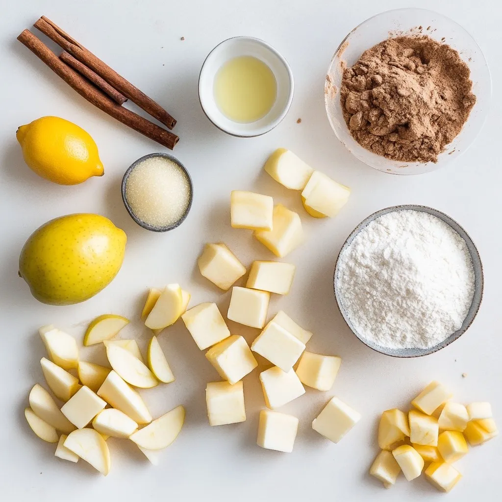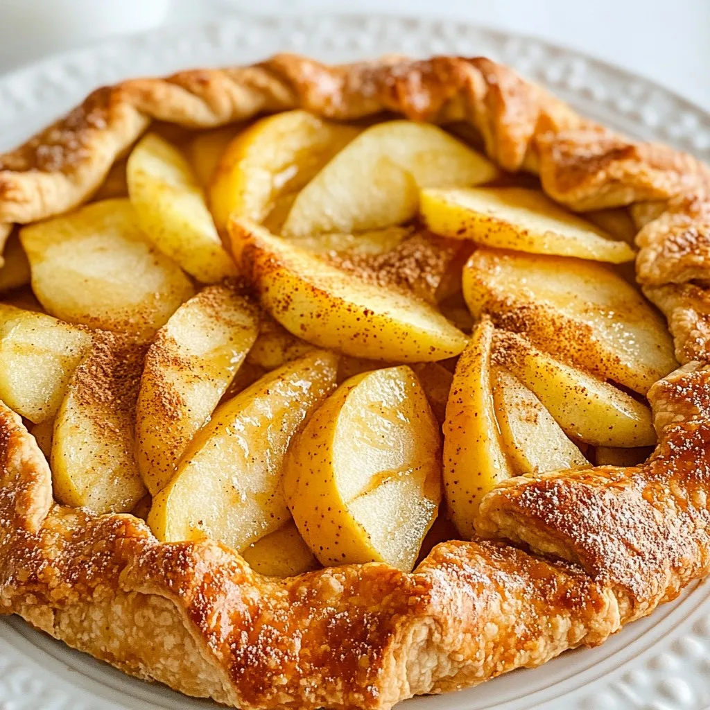 To make a Rustic Apple Galette, you will need the following ingredients: - 2 cups all-purpose flour - 1/2 teaspoon salt - 1 tablespoon granulated sugar - 1/2 cup unsalted butter, chilled and cut into small cubes - 6-8 tablespoons ice water (more if needed) - 4 medium apples, peeled, cored, and thinly sliced - 1 tablespoon fresh lemon juice - 1 teaspoon ground cinnamon - 1/4 teaspoon ground nutmeg - 1/4 cup packed brown sugar - 1 large egg (for egg wash) - Extra granulated sugar for sprinkling on top For a great galette, choose apples that balance sweet and tart. I suggest using: - Granny Smith - Honeycrisp - Fuji - Gala These apples hold their shape well. They bring a nice flavor and texture. Mixing two kinds can enhance taste. You can swap some ingredients if needed. Here are some options: - For all-purpose flour, use whole wheat flour for a nuttier taste. - Coconut oil can replace butter for a dairy-free option. - Maple syrup can be used instead of brown sugar for a different sweetness. - Lemon juice can be swapped with lime juice for a zesty twist. These substitutes still give a delicious result. Feel free to experiment! {{ingredient_image_2}} To make the dough, start with a large bowl. Mix 2 cups of all-purpose flour, 1/2 teaspoon of salt, and 1 tablespoon of granulated sugar. Next, add 1/2 cup of chilled, cubed unsalted butter. Use a pastry cutter, fork, or your fingers to mix. Blend until it looks like coarse crumbs, with small chunks of butter. Add 6-8 tablespoons of ice water one tablespoon at a time. Stir gently until the dough sticks together. It should feel a bit sticky but still manageable. Form the dough into a ball and flatten it into a disk. Wrap it in plastic wrap and chill in the fridge for at least 30 minutes. This helps the dough firm up and makes it easier to work with later. For the filling, take 4 medium apples, like Granny Smith or Honeycrisp. Peel, core, and slice them thinly. In a separate bowl, toss the apple slices with 1 tablespoon of fresh lemon juice, 1 teaspoon of ground cinnamon, 1/4 teaspoon of ground nutmeg, and 1/4 cup of packed brown sugar. Mix until all the apple slices are coated. Let the filling sit for about 10 minutes. This allows the flavors to blend and the juices to form. Preheat your oven to 400°F (200°C). On a floured surface, roll out the chilled dough into a circle about 12 inches wide. Carefully move the dough to a baking sheet lined with parchment paper. Spoon the apple filling into the center of the dough, leaving a 2-inch border. Fold the edges over the apples, creating pleats. This gives the galette a rustic look. Make sure the center stays open, showing off the beautiful apples. Next, beat 1 large egg in a small bowl. Use a pastry brush to apply the egg wash over the exposed crust. Finally, sprinkle some granulated sugar on top. This adds a nice sweetness and sparkle. Now, you're ready to bake! Place the baking sheet in the oven and bake for 35-40 minutes. The crust should turn golden brown, and the apples should be soft and fragrant. Enjoy the delicious aroma filling your kitchen! To make the best dough, keep your butter cold. This helps create a flaky crust. When mixing, use a pastry cutter or your fingers. Blend until it looks like coarse crumbs. You want small chunks of butter to stay in the mix. This adds to the texture. Add ice water slowly, one tablespoon at a time. Mix gently until the dough starts to come together. It should feel a bit sticky but still easy to handle. If it feels too dry, add a bit more water. After mixing, wrap the dough in plastic. Chill it for at least 30 minutes. This resting time is key for good texture. For a tasty filling, choose your apples wisely. I recommend Granny Smith or Honeycrisp. They bring the right balance of sweet and tart. To boost flavor, add lemon juice, cinnamon, and nutmeg. These spices make the apples shine. You can also play with sugars. Brown sugar gives a richer taste. If you want, try a splash of vanilla extract. It adds warmth and depth. Let the apple mixture sit for about 10 minutes. This lets the flavors mix and juices form. When baking, preheat your oven to 400°F (200°C). A hot oven helps the crust become golden. For even baking, use parchment paper on your baking sheet. This prevents sticking and makes cleanup easy. Apply an egg wash to the crust before baking. This gives the galette a nice shine. Sprinkle a little granulated sugar on top. It adds sweetness and sparkle. Bake for 35-40 minutes. Look for a golden crust and tender apples. Trust your senses; the smell tells you it’s ready! Pro Tips Chill Your Ingredients: Ensure that your butter and water are icy cold. This helps create a flaky crust by preventing the butter from melting before baking. Mixing the Dough: Be cautious not to overmix the dough. Stop as soon as it holds together to avoid a tough crust. Apple Selection: Use a mix of tart and sweet apples for a balanced flavor. Granny Smith and Honeycrisp create a lovely contrast. Serving Suggestions: For an extra indulgent treat, serve your galette warm with a scoop of vanilla ice cream or a drizzle of caramel sauce. {{image_4}} The Rustic Apple Galette shines with simple pairings. Serve it warm for the best taste. Here are my top picks: - Vanilla Ice Cream: The creamy texture adds richness and balances the tart apples. - Whipped Cream: A dollop gives a light, fluffy touch. - Caramel Sauce: Drizzle some for extra sweetness and a lovely finish. - Cheese: Try sharp cheddar for a bold contrast. If you have leftovers, store them right for the best taste. Here’s how: - Cool Completely: Let the galette cool down before storing. - Wrap It Up: Use plastic wrap or aluminum foil to keep it fresh. - Refrigerate: Keep it in the fridge for up to 3 days. - Reheat: Warm slices in the oven for a few minutes. This keeps the crust crispy. Make your Rustic Apple Galette look as good as it tastes. Here are some fun ideas: - Slice Neatly: Cut into wedges for easy serving. - Garnish