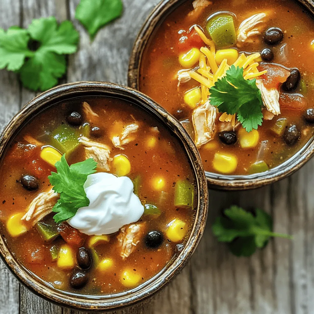 - 1 lb boneless, skinless chicken breasts - 1 can (15 oz) black beans, rinsed and drained - 1 can (15 oz) sweet corn, drained - 1 can (10 oz) diced tomatoes with green chilies, undrained - 1 medium onion, finely chopped - 2 cloves garlic, minced - 1 bell pepper, chopped into small pieces - Fresh cilantro leaves, roughly chopped, for garnish - 1 packet of taco seasoning (about 1 oz) - 1 tablespoon olive oil - Sea salt and freshly ground black pepper to taste - Sour cream and shredded cheese (like cheddar or Monterey Jack), for serving This list covers everything you need for a savory chicken taco soup. Each ingredient plays a key role in creating rich flavors. The chicken gives protein and heartiness, while the beans and corn add texture and sweetness. The tomatoes with green chilies bring a bit of heat and brightness. Using fresh veggies like onion and bell pepper enhances the taste and aroma of the soup. Don't skip the cilantro; it adds a fresh touch. The taco seasoning offers a blend of spices that brings everything together. The olive oil keeps it moist, while salt and pepper balance the flavors. Make sure to have sour cream and shredded cheese ready for serving. They add creaminess and richness to each bowl of soup. You can find the full recipe [here](Full Recipe). First, heat the olive oil in a large pot over medium heat. When it shimmers, add the chopped onion and bell pepper. Sauté them for about 3 to 4 minutes. You want them soft and translucent. Next, add the minced garlic. Stir it often for about one minute until it smells great. Be careful not to burn the garlic. Now, push the sautéed veggies to one side of the pot. Add the diced chicken breasts to the center. Cook the chicken for about 5 to 6 minutes. Stir it occasionally until all sides are browned. Once the chicken is nice and golden, sprinkle the taco seasoning on top. Mix it well to coat the chicken evenly with spices. Next, pour in the chicken broth. Then, add the rinsed black beans, drained corn, and the can of diced tomatoes with their juices. Stir gently to combine all the ingredients. Increase the heat and bring the soup to a boil. Once it boils, reduce the heat to low. Let the soup simmer uncovered for 20 to 25 minutes. This allows all the flavors to blend and grow stronger. After simmering, taste the soup. Adjust the seasoning with salt and pepper as needed. For the full recipe and detailed measurements, check out the [Full Recipe]. To make your Chicken Taco Soup even tastier, consider adding spices like cumin or paprika. A dash of chili powder can also kick up the heat. Fresh herbs like cilantro can brighten the soup. Always taste your soup during cooking. Adjust the salt and pepper to fit your taste. You can cook Chicken Taco Soup in a slow cooker for a hands-off approach. Just combine all the ingredients and cook on low for 6-8 hours. For a quick meal, use an Instant Pot. Set it to pressure cook for about 10 minutes. This will give you the same great flavor in less time. Garnishing makes the soup look vibrant. Top each bowl with a dollop of sour cream. Add shredded cheese and fresh cilantro for a pop of color. You can serve the soup with tortilla chips or warm tortillas. This makes a complete meal that everyone will enjoy. If you want the full recipe, you can find it [here]. {{image_4}} To make Chicken Taco Soup gluten-free, use gluten-free taco seasoning. Check the canned goods, too. Most black beans and corn are gluten-free, but always read the labels. For a low-carb version, swap the black beans with diced zucchini or cauliflower. This keeps the soup hearty without the extra carbs. If you want a vegetarian option, you can replace the chicken with extra beans. Try using pinto beans or chickpeas for protein. You can also add more vegetables like carrots, mushrooms, or spinach. These changes make the soup just as filling and yummy. For those who do not eat chicken, turkey can be a great swap. If you prefer a meatless meal, use canned lentils or more beans. You might also want to try air-fried tofu for a fun twist. Adding different veggies can change the soup’s taste. Toss in diced sweet potatoes or chopped kale. Bell peppers come in many colors, so mix them for extra flavor. You can also add corn to make it sweeter and crunchier. To add some heat, consider slicing fresh jalapeños. You can also add chili powder or cayenne pepper. Just remember, start with a little. You can always add more heat later. For toppings, get creative! Besides sour cream and cheese, try avocado slices or fresh lime juice. Crushed tortilla chips add a nice crunch. Add some fresh herbs like cilantro or green onions for a fresh touch. Each topping adds a new flavor layer, making every bowl unique. For the full recipe, check out [Full Recipe]. To store leftovers, let the Chicken Taco Soup cool first. Then, place it in an airtight container. This keeps the soup fresh and tasty. You can store it in the fridge for up to three days. When you want to eat it again, reheat the soup on the stove or in the microwave. Stir it well to heat evenly. If it seems thick, add a splash of broth or water to loosen it up. Freezing Chicken Taco Soup is easy and a great way to save it. First, let the soup cool completely. Then, pour it into freezer-safe bags or containers. Leave some space at the top for expansion. This soup can last up to three months in the freezer. When you're ready to eat, take it out and place it in the fridge overnight to thaw. You can also defrost it in the microwave if you’re in a hurry. Once thawed, reheat it on the stove or in the microwave until it's hot. Chicken Taco Soup has a good shelf life when stored right. In the fridge, it stays fresh for about three days. In the freezer, it can last three months. Always check for signs of spoilage before eating. If the soup smells bad or has a strange color, it's best to toss it out. Keeping an eye on these signs helps ensure you enjoy your soup at its best. For the full recipe, refer t