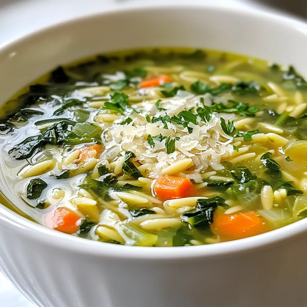 A hearty and nutritious soup featuring orzo pasta and fresh spinach, perfect for a comforting meal.