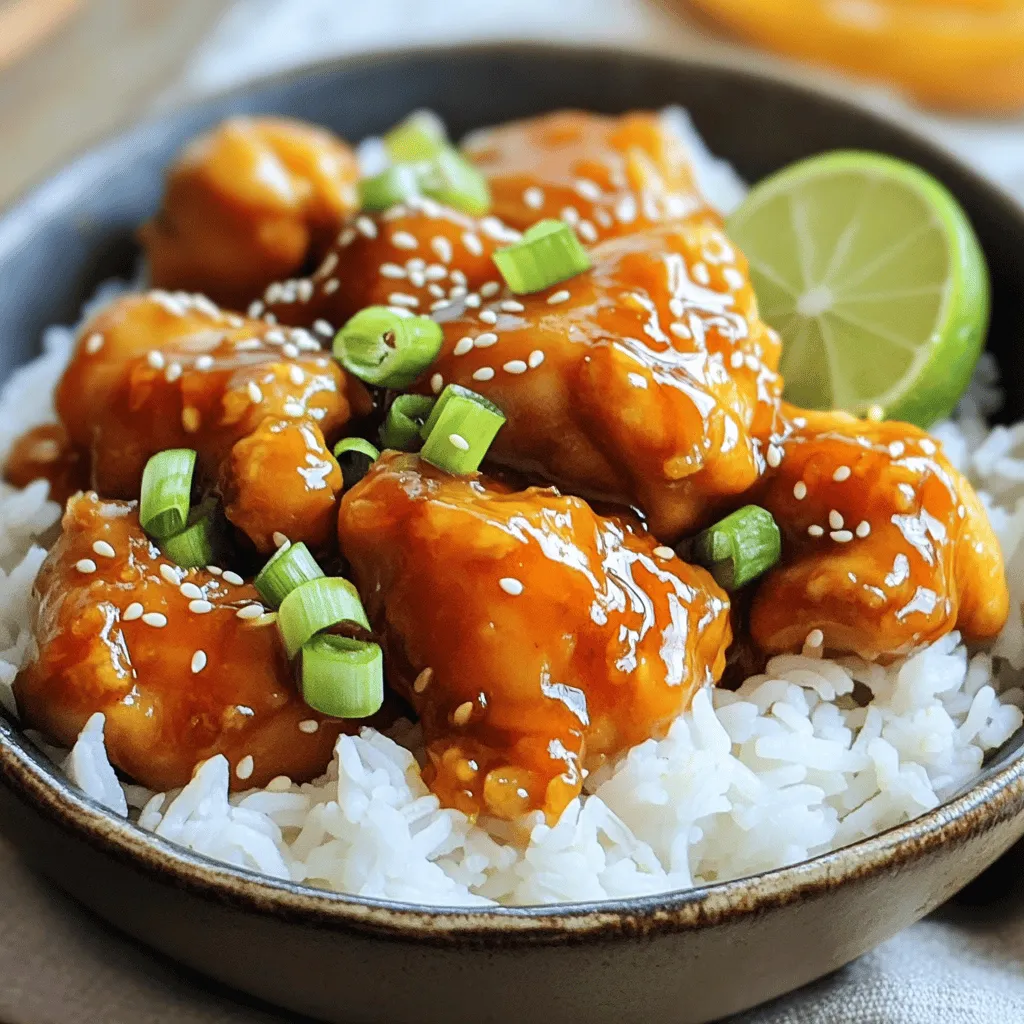 - 1 pound boneless, skinless chicken thighs, cut into bite-sized pieces - 1 cup freshly squeezed orange juice - 2 tablespoons soy sauce - 3 tablespoons honey - 2 cloves garlic, minced - 1 tablespoon fresh ginger, grated - 1 tablespoon sesame oil - 1 teaspoon chili flakes (optional, for heat) - 1 tablespoon cornstarch mixed with 2 tablespoons water (slurry) - 2 green onions, thinly sliced (for garnish) - Sesame seeds (for garnish) In this recipe, we focus on fresh flavors. The chicken thighs give a juicy base. Freshly squeezed orange juice adds brightness and sweetness. Soy sauce gives it a savory depth. Honey rounds out the flavor, adding a sticky sweetness. The additional ingredients are key. Garlic and ginger create a fragrant aroma. Sesame oil adds richness, while chili flakes bring a hint of heat. The cornstarch slurry helps thicken the sauce, making it sticky. Green onions and sesame seeds finish the dish with color and crunch. Using fresh ingredients makes a big difference. They enhance the taste and make your meal special. Check out the Full Recipe for exact measurements and step-by-step guidance. Enjoy cooking! To start, gather your ingredients. You need freshly squeezed orange juice, soy sauce, honey, minced garlic, grated ginger, and sesame oil. In a large bowl, combine them. Whisk until smooth. This mix is your marinade. It gives the chicken a bright flavor. Cut the chicken thighs into bite-sized pieces. Add them to the marinade. Make sure each piece is coated well. Cover the bowl with plastic wrap. Place it in the fridge for at least 30 minutes, but up to 2 hours is better for flavor. Heat a large skillet over medium-high heat. Take the chicken out of the marinade. Reserve the marinade for later. Sauté the chicken in the skillet for about 5 to 7 minutes. Keep stirring until the chicken is cooked and caramelized. Next, lower the heat to medium. Pour the reserved marinade into the skillet. Bring it to a gentle simmer. Cook for around 3 to 4 minutes. This helps the sauce thicken. Finally, stir in the cornstarch slurry. This will make the sauce sticky. After about 1 to 2 minutes, the sauce should be thick. If you like spice, add chili flakes now. Mix well. Serve the sticky orange chicken over steamed rice. Garnish with green onions and sesame seeds. Enjoy this delicious dish! For the full recipe, check out the Sticky Orange Chicken Delight. To get the best taste, always use fresh orange juice. The flavor will shine through. I recommend squeezing the oranges yourself. It makes a big difference! Marinate the chicken longer for more flavor. A minimum of 30 minutes is good, but 2 hours is even better. The chicken will soak up all those tasty juices. When sautéing chicken, make sure your skillet is hot. This helps the chicken cook evenly and brown nicely. Don't overcrowd the pan. If you do, the chicken will steam instead of getting that nice crust. Cook it in batches if needed. For perfect caramelization, let the chicken sit in the pan without stirring too much. This allows the sugars to brown and gives you that tasty glaze. Sticky orange chicken pairs well with steamed rice. The rice soaks up the sauce nicely. For a colorful plate, add some steamed broccoli or snap peas. When serving, use a shallow bowl. Place the rice first, then the chicken on top. Drizzle the extra sauce over the chicken. For a pop of color, garnish with thinly sliced green onions and sesame seeds. A lime wedge on the side adds freshness and flair. This makes your dish attractive and delicious! For the full recipe, refer to the link provided. {{image_4}} You can easily add spice to your sticky orange chicken. Just sprinkle in chili flakes while cooking. This makes the dish warm and exciting. Adjust the amount to your taste. If you like more heat, add more flakes. For less heat, use fewer flakes. This simple change adds a nice kick and depth to the flavor. If you want to switch up the protein, try using tofu or shrimp. Tofu absorbs the orange sauce well. Cut it into cubes and marinate just like chicken. For shrimp, use large, peeled shrimp. Cook them for a shorter time so they stay tender. Both options give you a new twist on this tasty dish. Adding vegetables brings more color and nutrients to your sticky orange chicken. Bell peppers and broccoli work great. Slice bell peppers thinly and add them to the skillet. They cook quickly and add crunch. Steam broccoli until bright green, then mix it in just before serving. This makes your meal more balanced and fun. For the full recipe, check out the Sticky Orange Chicken Delight. To keep your sticky orange chicken fresh in the refrigerator, place it in an airtight container. This helps maintain its flavor and texture. It can stay good for up to four days. When you want to eat it again, simply reheat it in a skillet over medium heat. Stir occasionally until it warms up. You can also microwave it in a bowl, but be sure to cover it with a lid or plate to keep moisture in. If you want to store sticky orange chicken for longer, freezing works well. First, let the chicken cool completely. Then, place it in a freezer-safe bag or container. Remove as much air as possible before sealing. This can help prevent freezer burn. Your sticky orange chicken can last up to three months in the freezer. When you’re ready to eat it, take it out and thaw it in the fridge overnight. After thawing, the texture might change a bit. To fix this, reheat it gently in a skillet. Adding a splash of orange juice can help bring back that tasty, sticky sauce. For the best results, always check for flavor and adjust as needed. Enjoy your meal! Sticky Orange Chicken pairs well with many sides. Here are some great options: - Steamed rice - Fried rice - Quinoa - Broccoli - Snap peas - Stir-fried vegetables - A fresh salad These sides balance the dish's rich flavors. They add texture and nutrients. You can mix and match to suit your taste. Yes, you can use chicken breasts. They will work fine in this reci