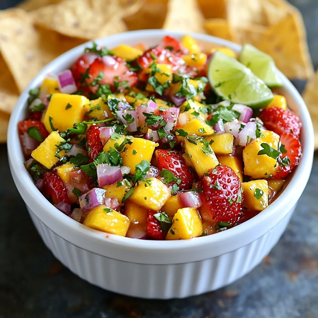 A vibrant and refreshing salsa made with fresh strawberries and mango, perfect for summer gatherings.