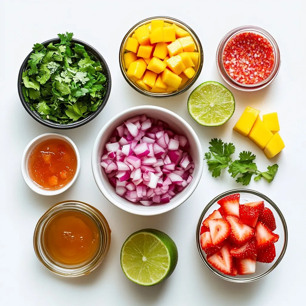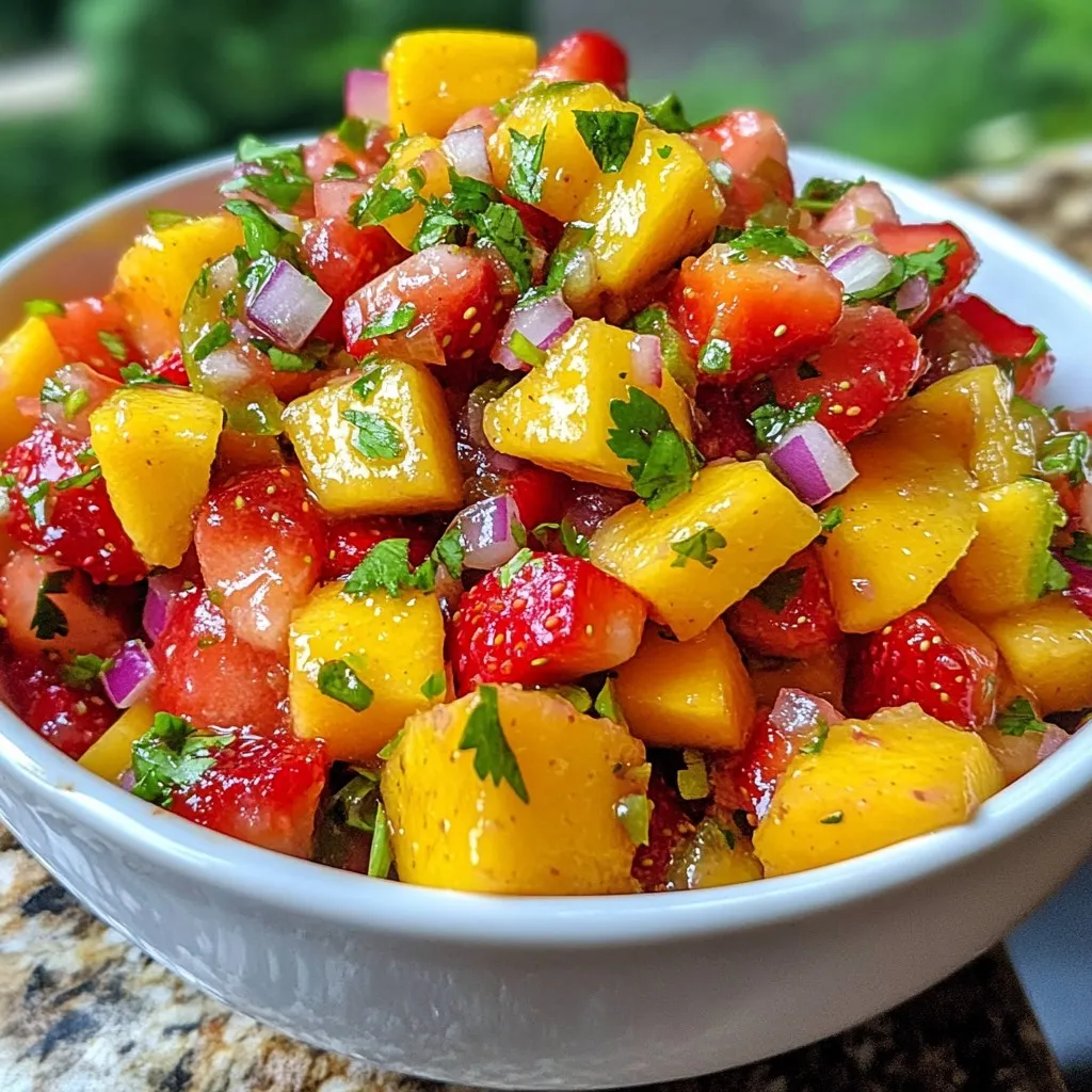 - 1 cup fresh strawberries, hulled and diced into small pieces - 1 ripe mango, peeled and diced into cubes - 1 small red onion, finely chopped for added crunch - 1 jalapeño, seeded and minced (adjust to your desired level of spice) - 1/4 cup fresh cilantro, finely chopped for a burst of flavor I love using fresh ingredients for this salsa. Strawberries bring sweetness, while mango adds a tropical twist. The red onion gives a nice crunch. Jalapeño adds a little heat, and cilantro brings freshness. Each ingredient plays a key role in making this salsa shine. - Juice of 2 fresh limes for acidity - 1 tablespoon honey or agave syrup (optional for added sweetness) - Salt to taste Lime juice adds a tangy flavor, balancing the sweetness of the fruits. Honey or agave syrup is optional, but they can enhance the taste. A pinch of salt brings all the flavors together, making every bite delicious. This recipe yields about 4 servings. It’s perfect for sharing at a gathering or enjoying on your own. The vibrant colors and fresh flavors make it a great addition to any meal. Serve it with tortilla chips or as a topping for grilled meats. Enjoy! {{ingredient_image_2}} Start by preparing your base. In a medium mixing bowl, combine the diced strawberries and mango. Make sure they are fresh and ripe for the best flavor. This colorful mix will create a fruity and vibrant salsa. Stir gently to avoid mashing the fruit. You want to keep the pieces intact for a nice texture. Next, add the finely chopped red onion and minced jalapeño. The onion gives a nice crunch, while the jalapeño adds a spicy kick. If you prefer less heat, remove the seeds and ribs from the jalapeño. Mix everything well. This blend of fruit and veggies creates a delicious contrast. Now, it’s time to season your salsa. Fold in the chopped cilantro for a burst of fresh flavor. Then, squeeze the juice of two fresh limes over the mixture. This adds acidity and brightens the salsa. If you like it sweeter, drizzle in a tablespoon of honey or agave syrup and mix gently. Finally, sprinkle a pinch of salt. Taste as you go to find the right balance. Let your salsa rest. Allow it to sit at room temperature for at least 15 minutes. This resting period helps the flavors meld together. The longer it sits, the better it tastes! Enjoy your fresh and flavorful Strawberry Mango Fruit Salsa with chips or on top of your favorite grilled dishes. When making strawberry mango fruit salsa, pick ripe fruits. Look for strawberries that are bright red and firm. They should smell sweet and fresh. For mangoes, choose ones that yield slightly when pressed. A ripe mango will have a sweet scent and a bit of give. This salsa works well with many snacks and dishes. Serve it with crispy tortilla chips for a refreshing dip. You can also use it as a topping for grilled chicken or fish. This adds a burst of flavor to your meal. For a fun twist, try it with tacos or over nachos. You might want to change the spice and sweetness levels. If you like it spicier, add more jalapeño or a dash of hot sauce. For more sweetness, drizzle in extra honey or agave syrup. Always taste as you mix to find the perfect balance for your salsa. Pro Tips Choose Ripe Fruits: Make sure your strawberries and mangoes are perfectly ripe for the best flavor and sweetness in your salsa. Adjust the Spice: Feel free to adjust the amount of jalapeño based on your spice preference; taste as you go! Resting Time: Allowing the salsa to rest for at least 15 minutes is crucial for letting the flavors meld together beautifully. Serving Suggestions: This salsa pairs wonderfully with grilled fish or chicken, adding a tropical twist to your meal. {{image_4}} You can switch up the fruits in your salsa. Try using fresh peaches or pineapple for a different twist. These fruits offer sweetness and tang, just like mango. You might also enjoy adding kiwi for a unique flavor and color. Each fruit brings its own charm, making your salsa fun and fresh. If you want more heat, add more jalapeño. You can also try adding diced serrano peppers for a kick. For milder salsa, use less jalapeño or remove the seeds. A pinch of cayenne pepper can also spice things up without changing the base flavor. Adjust the heat to suit your taste. This salsa is easy to adapt for different diets. To make it vegan, skip the honey and use agave syrup. You can also reduce the sweetness or leave it out entirely for a low-sugar option. This way, everyone can enjoy your tasty creation, no matter their dietary needs. To store leftovers, transfer the salsa to an airtight container. Make sure the lid seals tightly. This helps keep the flavors fresh. You can store it in the fridge for up to three days. Avoid keeping it out at room temperature for too long. This keeps harmful bacteria from growing. The salsa stays fresh for about three days in the fridge. After that, it may lose its bright flavors and crunch. Always check for any signs of spoilage before eating. If it smells sour or looks off, it's better to toss it. You can freeze strawberry mango salsa, but it will change in texture. The fruits may become mushy when thawed. If you want to freeze it, use a freezer-safe container. It can last up to three months in the freezer. When ready to use, thaw it in the fridge overnight for best results. You can make your salsa spicier by adjusting the jalapeño. Use more jalapeño or leave in seeds for heat. You can also add spices like cayenne or chili powder for extra kick. Start small and taste as you go. This way, you can find the perfect level of spice for your taste buds. Strawberry mango salsa is versatile. It goes great with grilled chicken or fish. You can also use it as a topping for tacos or burritos. Serve it with crispy tortilla chips for a fun snack. It adds color and flavor to any meal, making it a crowd-pleaser. Yes, you can use frozen fruit. Thaw the fruit and drain any extra liquid before mixing. Keep in mind that frozen fruit may not be as fir