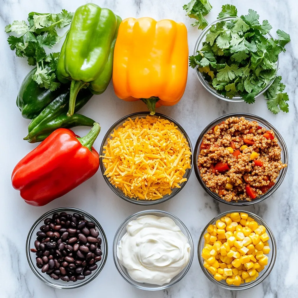These ingredients make taco stuffed bell peppers a hit. Each item plays a big role. Bell peppers hold the filling and add crunch. Ground turkey or beef gives rich flavor and protein. Quinoa or rice adds texture and heartiness. Black beans offer fiber and extra taste. Corn adds sweetness, while tomatoes keep it juicy. Taco seasoning gives that bold punch everyone loves. Cheese melts beautifully on top, making it all come together. Fresh cilantro brightens the dish, and yogurt or sour cream adds creaminess.