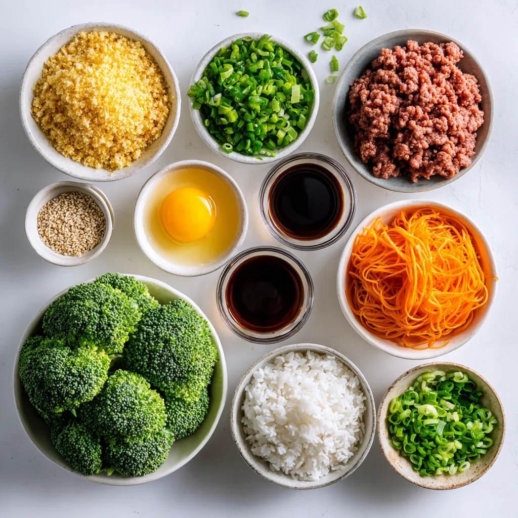 To make Teriyaki Meatball Rice Bowls, you need simple and tasty ingredients. The main part is ground beef or chicken. You can use either, depending on your taste. Breadcrumbs help bind the meatballs and keep them moist. Fresh green onions add a mild taste and a pop of color. The egg holds everything together while garlic and ginger give that classic Asian flavor.