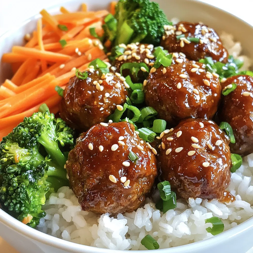 When presenting your bowls, think about color. Layer the rice on the bottom, then add the meatballs and vegetables. Drizzle sauce over the top and sprinkle sesame seeds. This makes the dish look great and taste even better!