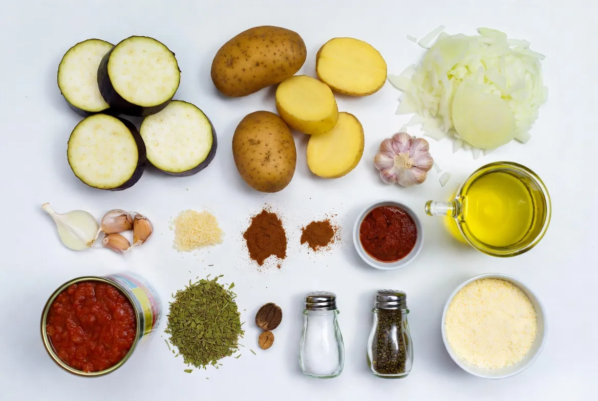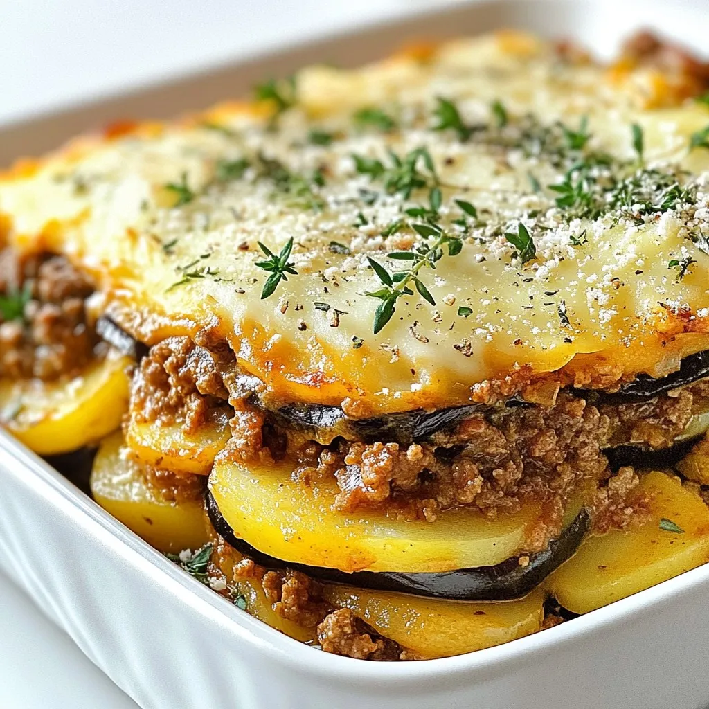 A delicious layered dish featuring eggplants, potatoes, and a rich meat sauce topped with creamy béchamel.