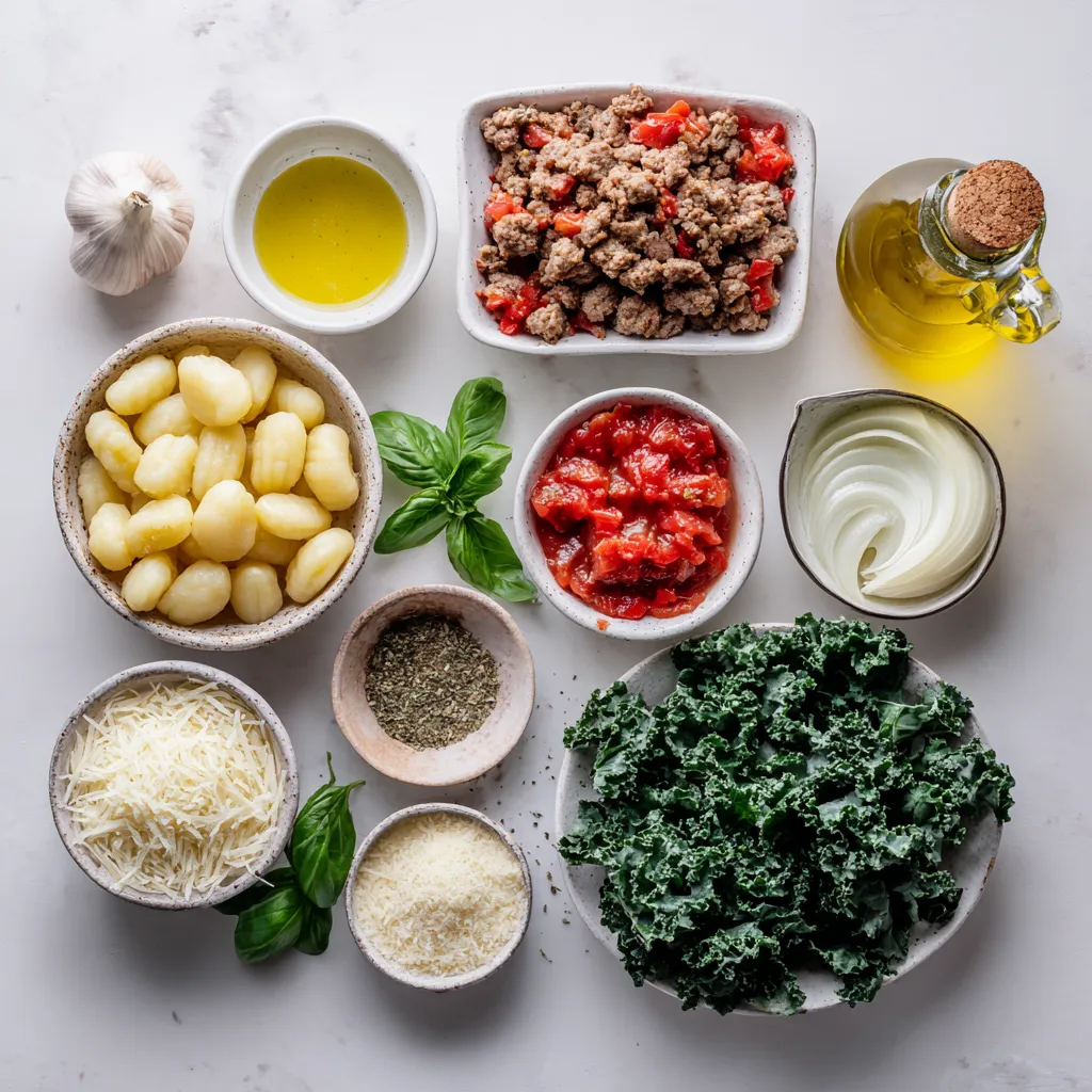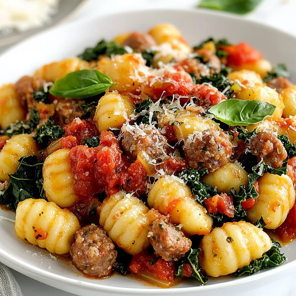 A creamy and flavorful dish featuring potato gnocchi, Italian sausage, and kale in a rich tomato sauce.