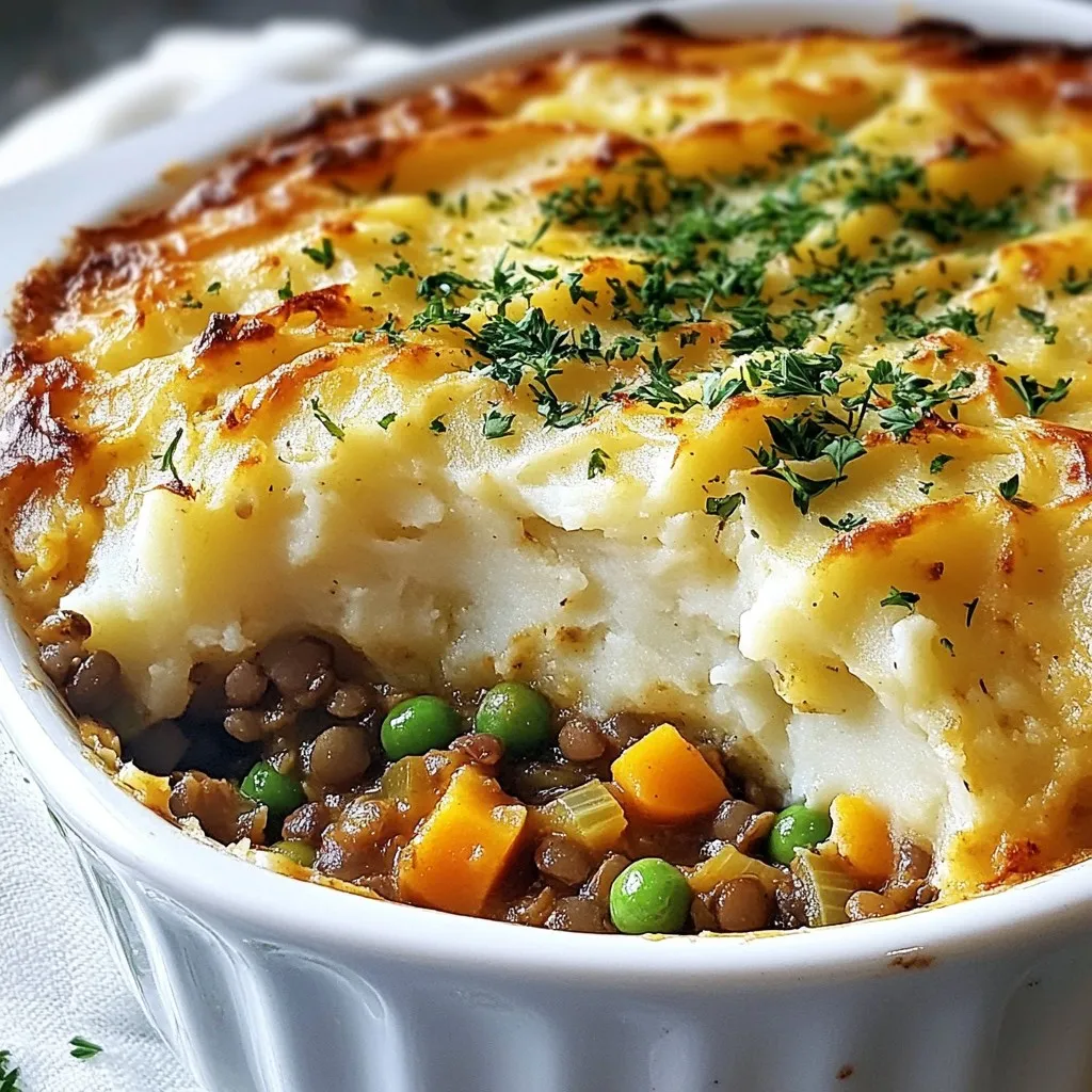 Preheat your oven to 400°F (200°C). In a greased baking dish, layer the lentil mixture evenly at the bottom. Carefully spread the creamy mashed potatoes over the top. Smooth them out with a spatula for an even layer. To make a golden crust, use a fork to create peaks and valleys on the mashed potatoes. Bake in the preheated oven for 25-30 minutes. You want the top to be golden brown and slightly crispy. Once baked, let the Shepherd’s Pie rest for a few minutes. Garnish with freshly chopped parsley before serving. Enjoy your hearty meal!