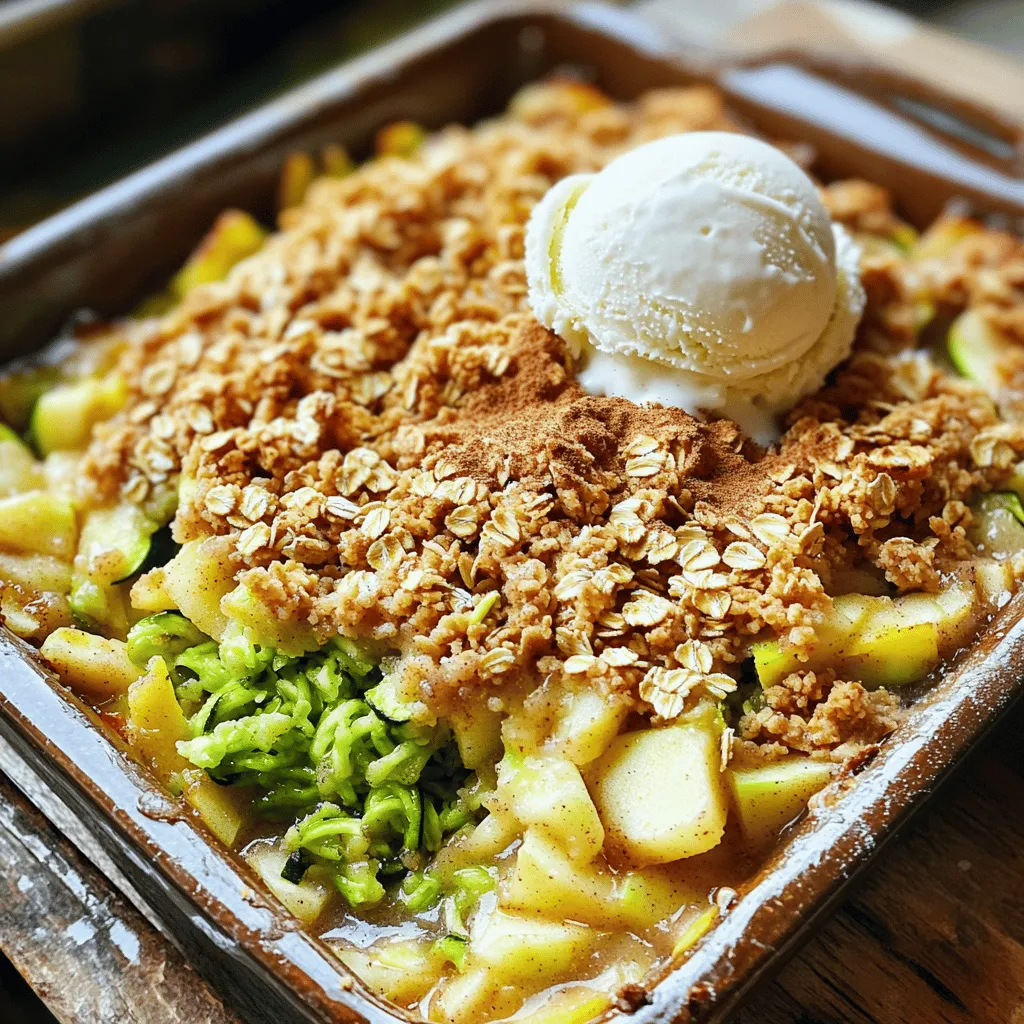 ![- 2 medium zucchinis, finely grated - 2 large apples, peeled, cored, and diced - 1 cup rolled oats I love using both zucchini and apples in this dish. Zucchini adds moisture without a strong taste, making it perfect in desserts. When you pick apples, select ones like Granny Smith for a tart kick or Honeycrisp for a sweet treat. The rolled oats give the crumble its heartiness. - 1/2 cup all-purpose flour - 1/2 cup packed brown sugar - 1/4 cup granulated sugar - 1/2 cup unsalted butter, melted - 1/2 teaspoon pure vanilla extract The topping is where the magic happens. Use all-purpose flour for a great structure. Brown sugar adds a nice depth of flavor while granulated sugar provides sweetness. The melted butter binds everything together, and a splash of vanilla brings warmth to the mix. - 1/2 cup chopped nuts (walnuts or pecans) - 1 teaspoon ground cinnamon - 1/4 teaspoon ground nutmeg Feel free to get creative! Chopped nuts add crunch and flavor. Nuts like walnuts or pecans work well. Spices like cinnamon and nutmeg elevate the dish. They add warmth and a hint of spice that pairs beautifully with the apples. For the full recipe, check out the entire guide. 1. Preheat your oven to 350°F (175°C). This step is key to getting a nice bake. 2. In a large bowl, combine 2 medium zucchinis, finely grated, and 2 large apples, peeled and diced. Granny Smith apples add a nice tartness. Honeycrisp apples bring sweetness. 3. Lightly sprinkle the mixture with 1 teaspoon of cinnamon and 1 tablespoon of sugar. Gently toss everything together. This lets the flavors mix well while you prepare the topping. 1. In a medium bowl, mix 1 cup of rolled oats, 1/2 cup of all-purpose flour, 1/2 cup packed brown sugar, and 1/4 cup granulated sugar. Add 1 teaspoon of cinnamon and 1/4 teaspoon of nutmeg for extra flavor. 2. Pour in 1/2 cup of melted unsalted butter and 1/2 teaspoon of vanilla extract. Add a pinch of salt too. 3. Stir until the mixture looks crumbly, like coarse sand. This is the perfect texture for your topping. 1. Grease a 9x9-inch baking dish with a little butter or cooking spray. This helps with easy serving later. 2. Spread the zucchini and apple mixture evenly across the bottom of the dish. 3. Sprinkle the crumble topping generously over the fruit layer. Make sure it covers every bit for an even bake. 4. If you want more crunch, add 1/2 cup of chopped nuts, like walnuts or pecans, on top. 1. Place the dish in the preheated oven and bake for 30-35 minutes. 2. Look for a golden brown topping and bubbling filling. These are signs that your crumble is done. 3. Once baked, take it out and let it cool for about 10 minutes before serving. Now you can enjoy your warm, tasty Zucchini Apple Crumble! For the full recipe, check out the details above. Use the best apples for baking. I recommend Granny Smith apples for a tart flavor or Honeycrisp apples for sweetness. Granny Smith adds a nice zing, while Honeycrisp brings out the dish's natural sweetness. You can mix both for a balanced taste. Apples with good firmness hold up well during baking. Look for apples that are bright and unblemished. Achieve the ideal crumble by mixing your dry ingredients well. Combine oats, flour, sugars, and spices until they are evenly blended. Incorporate melted butter slowly, mixing with a fork or your fingers. You want the mixture to be crumbly, resembling coarse sand. If the crumble is too dry, add a bit more butter. Adjust sweetness by adding more sugar or spices based on your taste. A pinch of nutmeg can bring warmth and depth. For a stunning presentation, serve the warm crumble in individual bowls. Top each bowl with a scoop of vanilla ice cream. This adds a creamy contrast to the warm, spiced crumble. Consider a light dusting of cinnamon on top for a finishing touch. Fresh mint leaves can add a pop of color. Enjoy it right away for the best flavor! If you want to make it even more special, drizzle some caramel sauce over the top. {{image_4}} For a gluten-free Zucchini Apple Crumble, you can swap the flour and oats. Instead of all-purpose flour, use almond flour or coconut flour. These options keep the dish light and tasty. For oats, choose gluten-free oats. They provide the same crunch without the gluten. When it comes to sweeteners, you have choices too. Instead of brown sugar, try coconut sugar or honey. Both add a nice flavor and sweetness. You can also use maple syrup for a unique twist. You can change the flavor of your crumble with a few simple additions. Adding lemon or orange zest brightens the dish. It gives a fresh taste that works well with the apples. You can also try different spices. Cardamom or ginger can add a warm kick to the crumble. Incorporating dried fruits is another fun option. Raisins or cranberries bring sweetness and chewiness. You can also mix in other fruits like pears or peaches for new flavors. Each fruit adds its own twist, making every bite exciting. Making your Zucchini Apple Crumble ahead of time is easy. Start by prepping the filling. Grate the zucchini and dice the apples. Mix them with sugar and spices, then store in the fridge. You can also prepare the crumble topping. Just combine the dry ingredients and melted butter, then store it in a separate container. When you're ready to bake, simply layer the filling and topping in a greased dish. You can bake it straight from the fridge. If you have leftovers, reheating is simple. Use the oven for best results. Heat at 350°F (175°C) for about 10 to 15 minutes. This method keeps the crumble's crisp texture. For a quick fix, you can use the microwave. Just heat in short bursts until warm. However, the topping may not be as crunchy. Enjoy your delicious dessert anytime! For the full recipe, visit the [Full Recipe]. To keep your Zucchini Apple Crumble fresh, use an airtight container. Glass or plastic containers work well. If you want to store it longer, you can freeze it. Just make sure it’s cooled before wrapping it tightly. Refrigerato