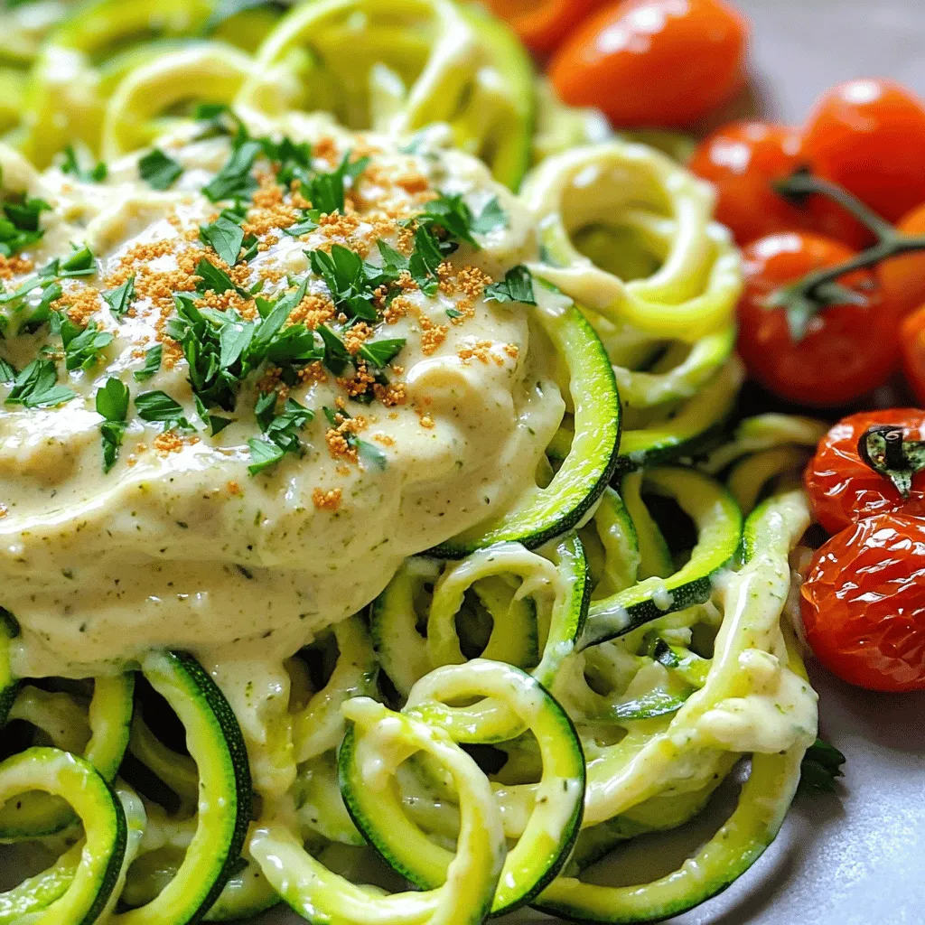 For a stunning presentation, garnish your dish with fresh parsley. It adds color and a fresh taste. Sprinkle some nutritional yeast over the top for a cheesy flavor. Pair your Zucchini Noodle Alfredo with roasted cherry tomatoes. Their sweetness complements the creamy sauce. You can also serve it with a side salad to add crunch and freshness. Enjoy the blend of colors and flavors on your plate!